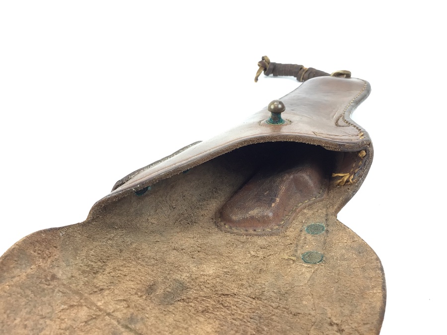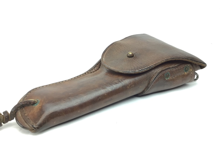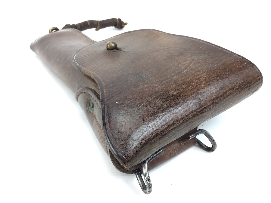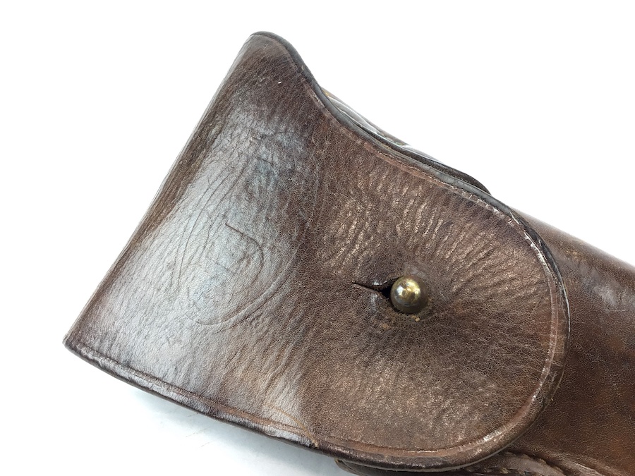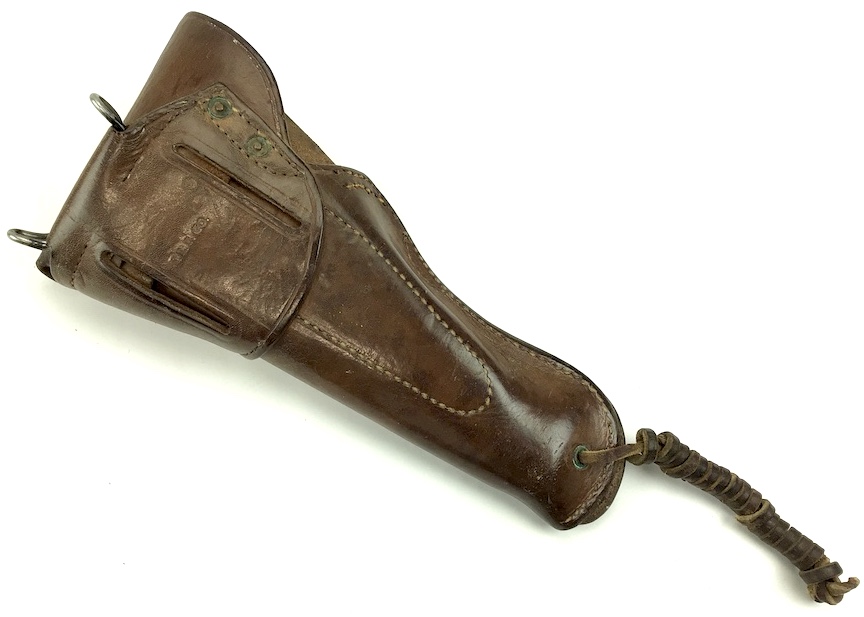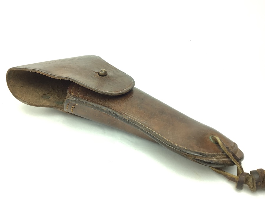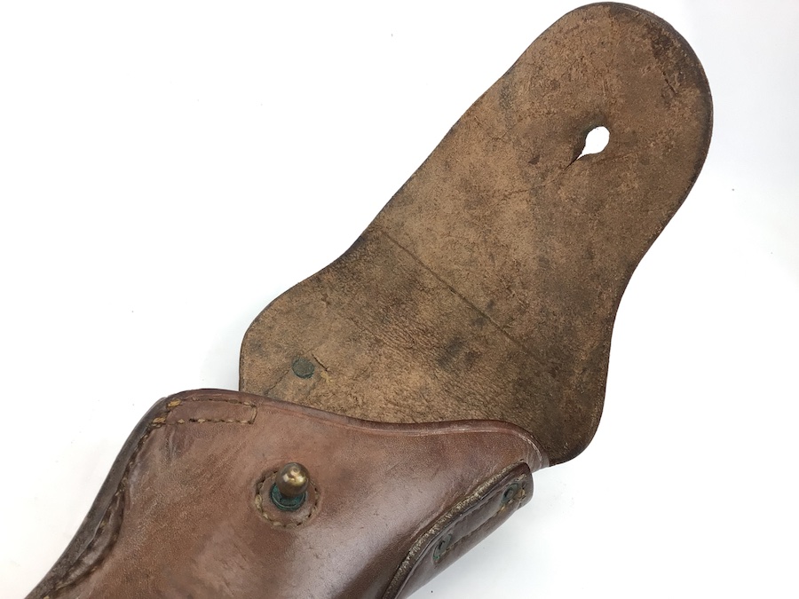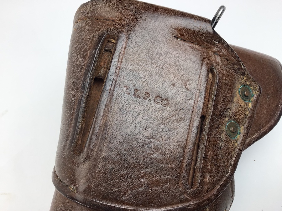 6/3/21 – Original and great condition. M1916 Belt Holster for the Colt 1911 side arm. Includes original leg lanyard. Distinctly maker stamped on the back. Intact and secure stitching and rivets. Clean interior. A.L.P. Co. made holsters during both world wars, for both the 1911 and 1911A1 pistols.
