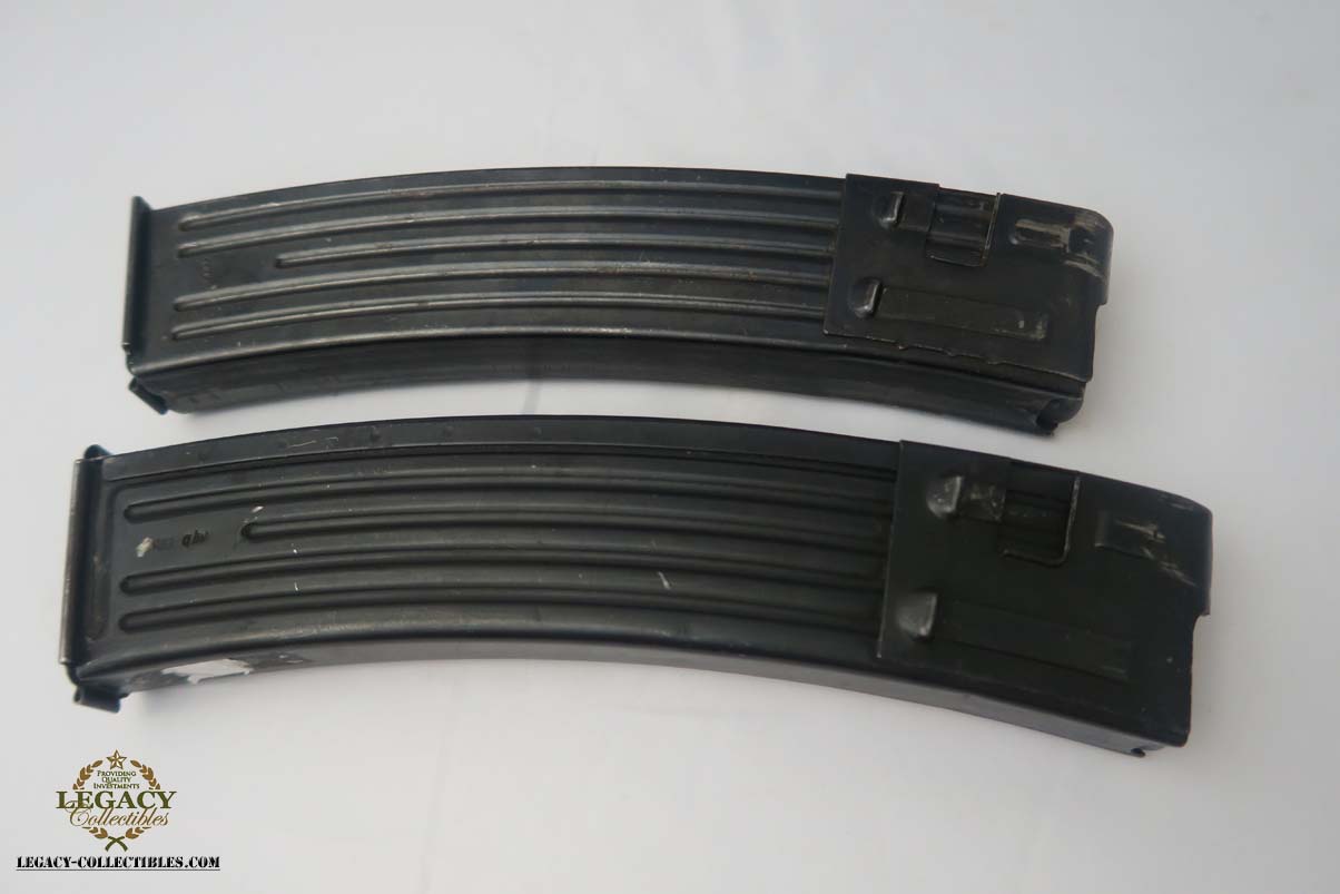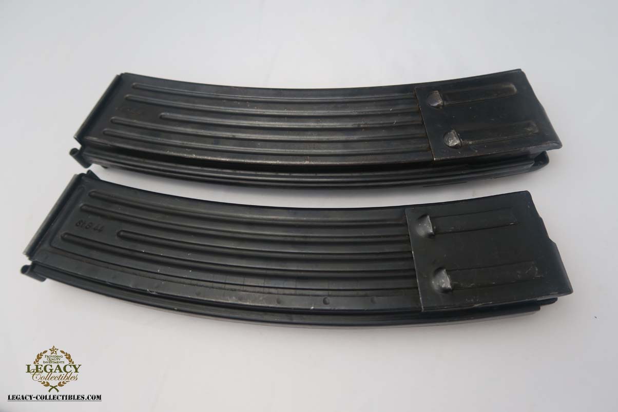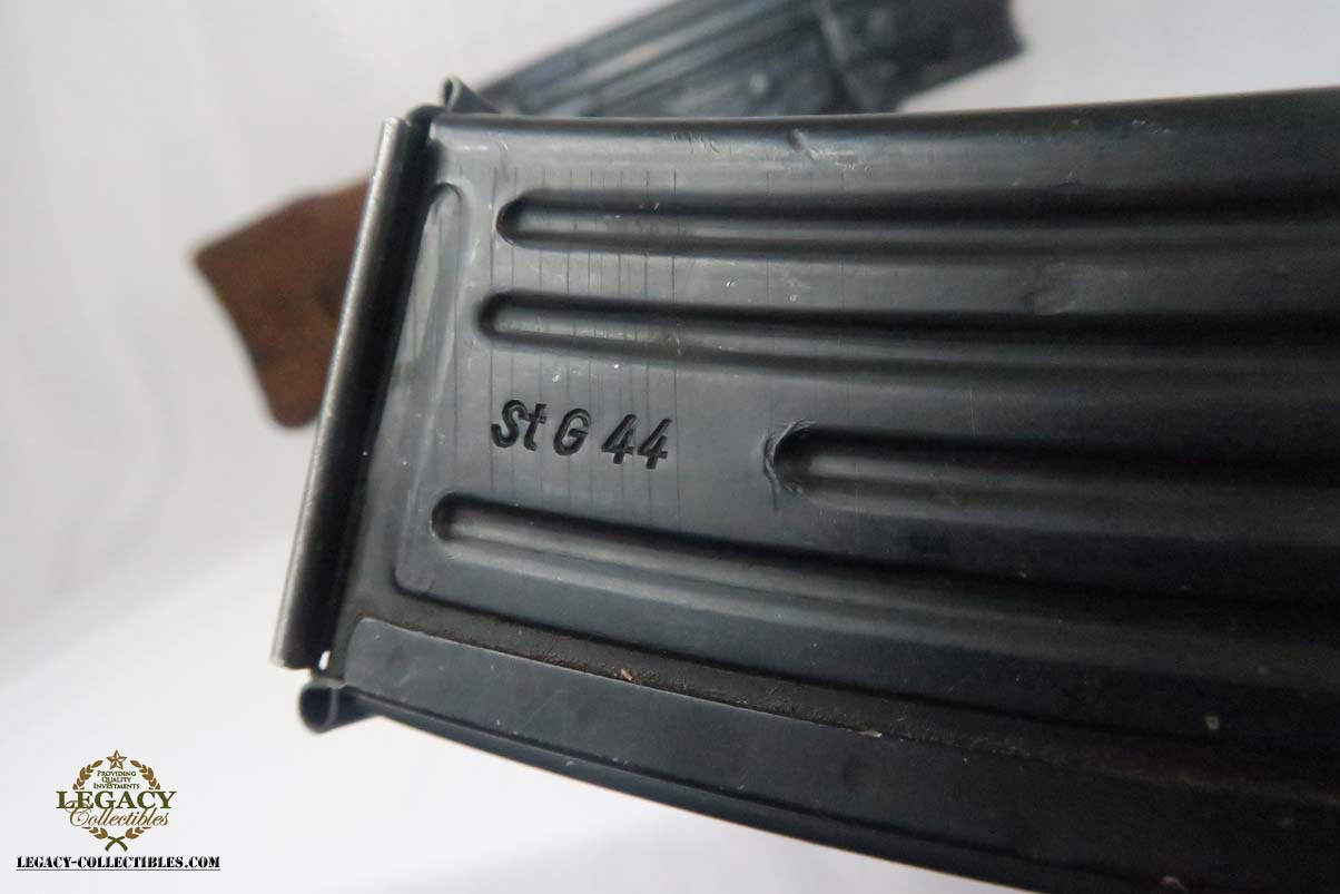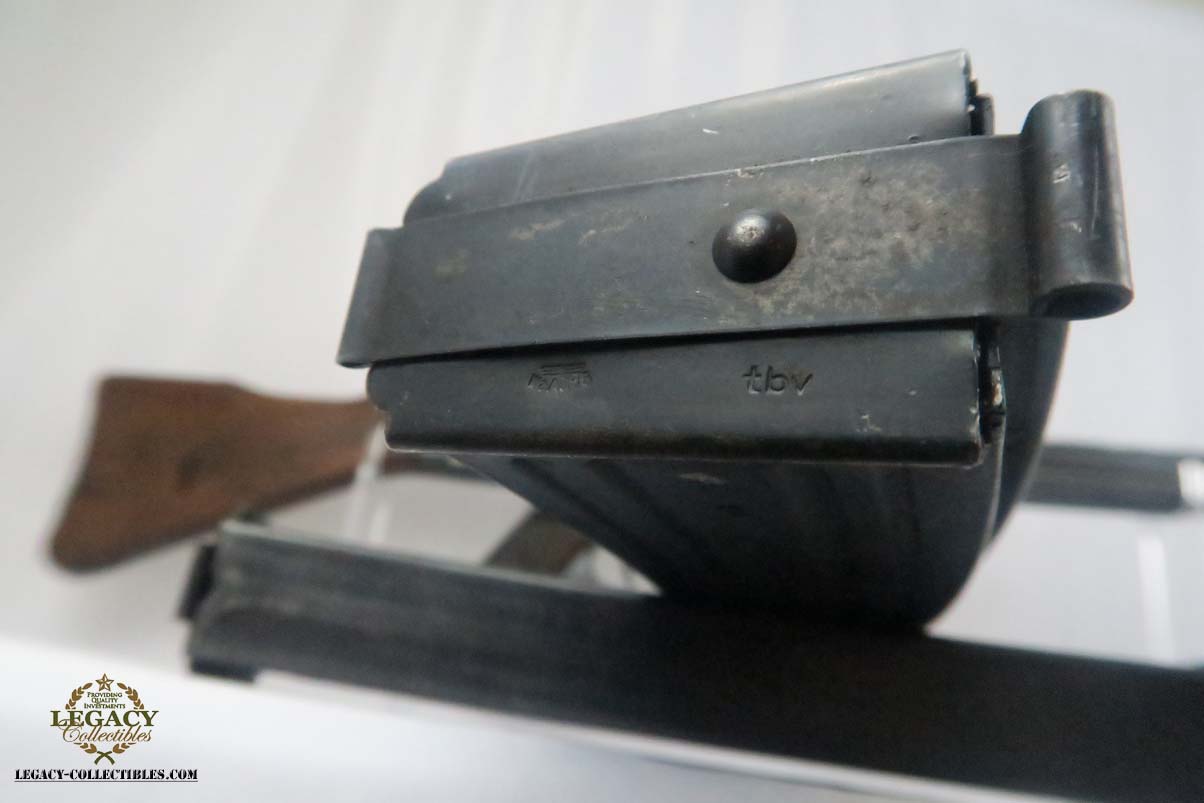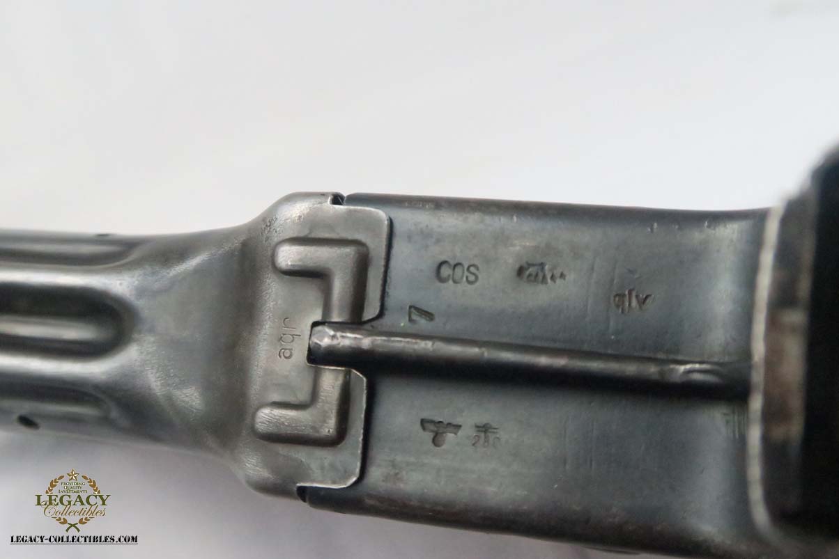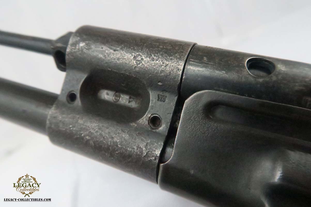 7/18/17 – The is a very cool full auto German MP44 Machine Gun from World War II. It is SN 1489N and has a 16-1/2″ barrel. Manufactured by ERMA. All parts on the gun except for rear sight numbered 73 appear to be all matching with ERMA manufactured op-rod, barrel and gas block with Haenel manufactured bolt. Metal receiver and buttstock parts by Mertzwerke with ERMA “qlv” mark on receiver. Buttstock is of the later 5-1/2″ vertical profile type. Bolt moves freely within the action, spring tension is good. This weapon appears fully functional. The original finish is very nice with a nice even patina, a smooth original blue finish turning gray with a mottling of brown, completely consistent with wartime use in a combat area. The bore is excellent and shiny. Bolt and op-rod extremely fine. Wooden grips and buttstock also extremely fine with a noticeable 2-1/2″ crack parallel to the bore line- 2″ up from the toe. Original leather sling also serviceable, soft and supple. The MP44 is the Granddaddy of all modern assault rifles. This particular specimen has an extremely smooth action and a very attractive appearance. These are a dream to shoot on the range and thankfully significant quantities of modern made ammunition are available. No German WWII machine gun collection is complete without one of these. Includes two 30 rnd magazines, 1 marked MP44 and the other StG44. This is a National Firearms Act item and requires BATF approval prior to transfer. This item is fully transferable on an ATF Form 3 or Form 4. It is Curio & Relic (C & R) eligible.