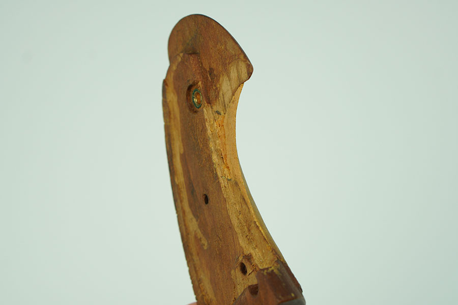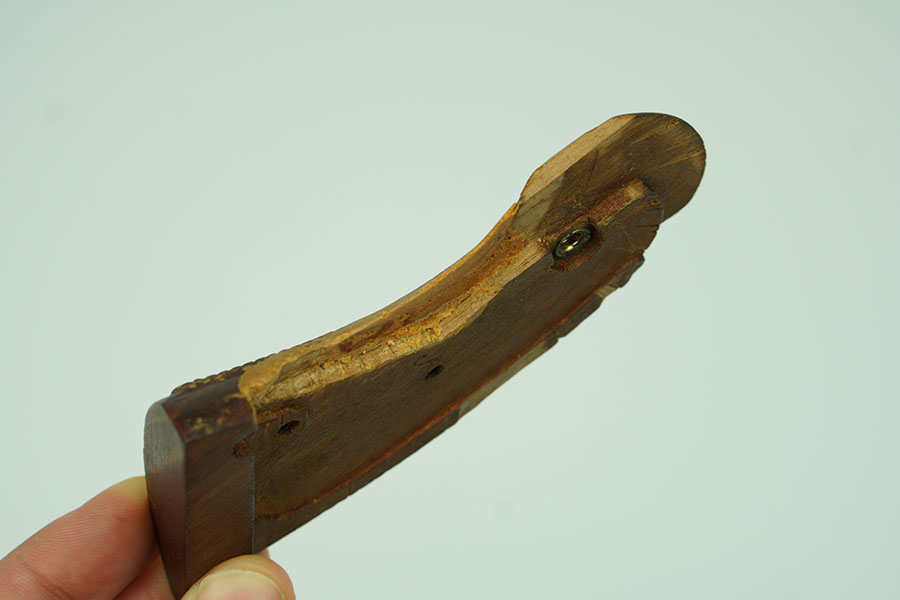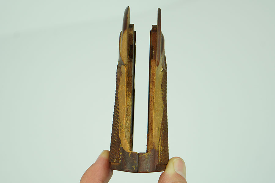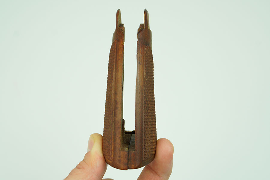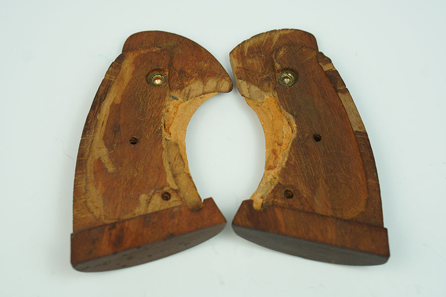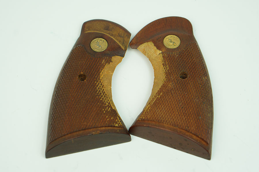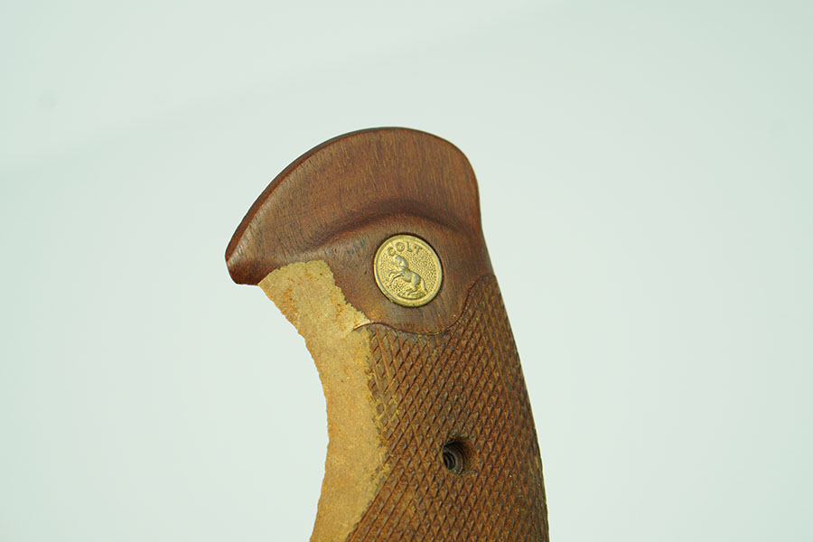 1/19/24 – This is an original example of a “Second Type” Colt Python pair of grips. As seen in the photos these grips are in below average condition with some heavy damage to both sides of the grips that align with the front strap. It appears previous owner used a wood filler to fill in the chip, the condition under the wood filler is unknown. The top corner of the right grip is also chipped. This example would be good for a restoration project or to be installed on a python while shooting so your “display” grips don’t receive further wear. Knurling is still in great condition on the rest of the grips.