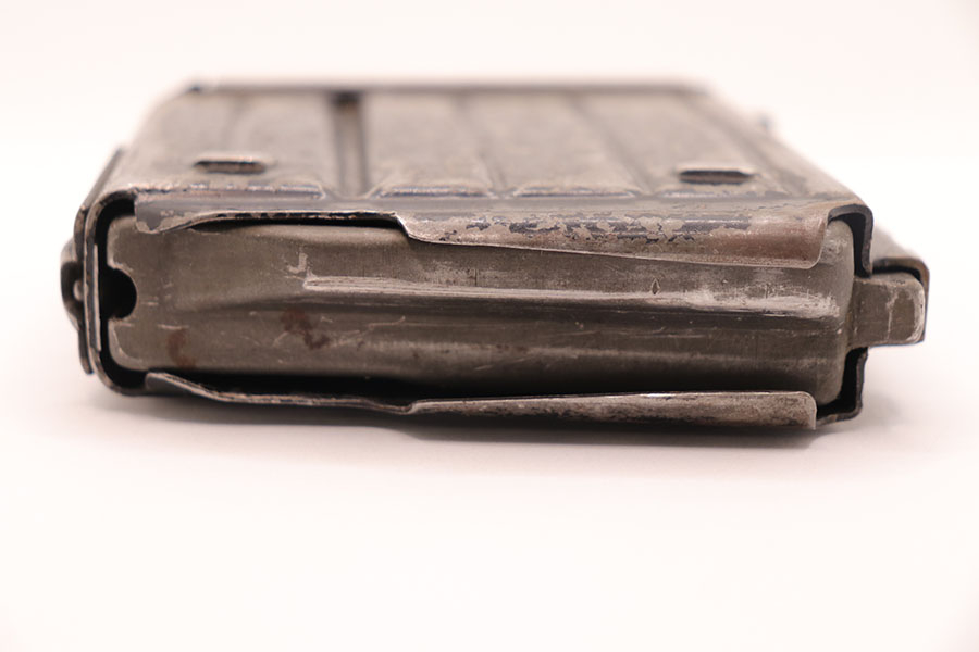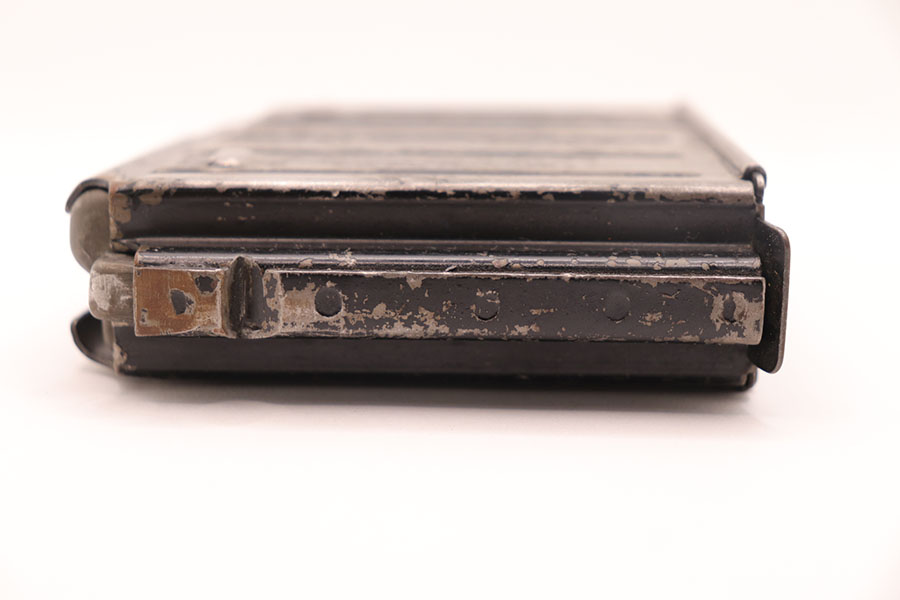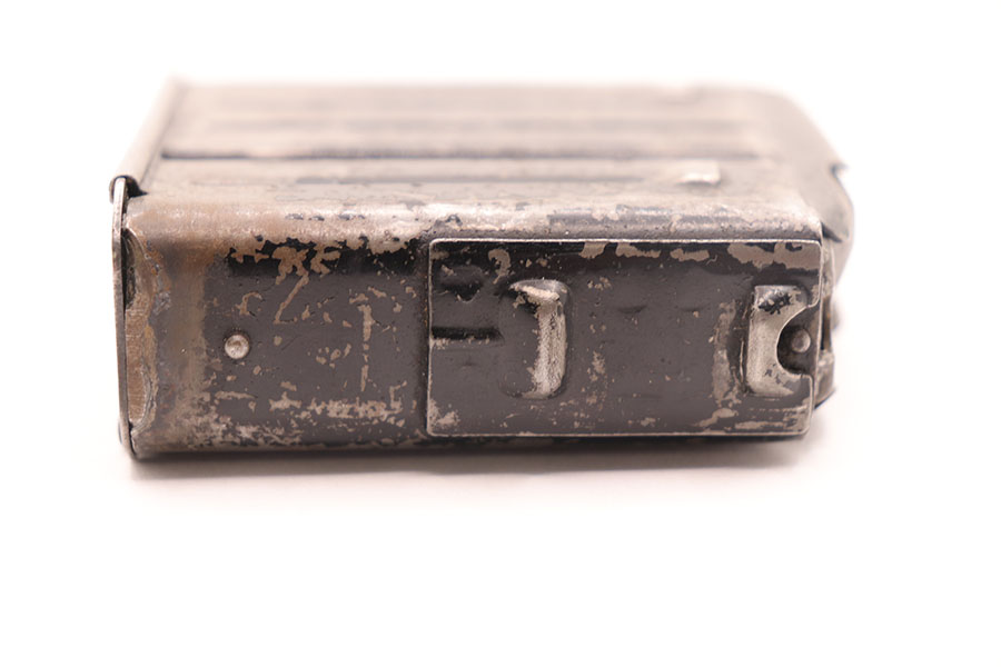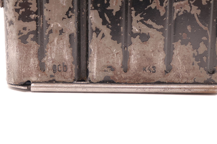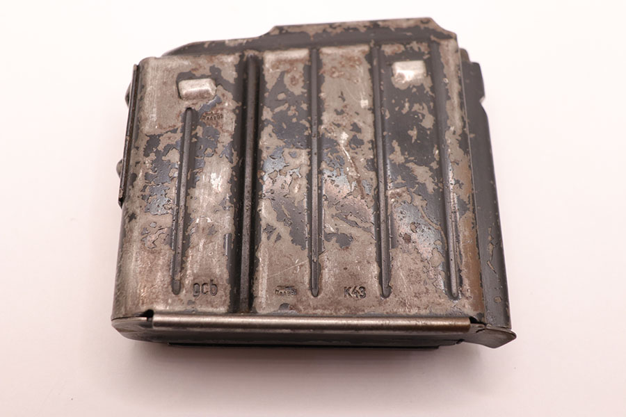 11/5/20 – This is an original WW2 production Mauser G43 / Walther K43 magazine. The magazine is marked “K43” with an “gcb” maker code and waffen eagle WaA892. It holds 10 rounds of the German standard 8mm rifle cartridge. The magazine is in good condition with noticeable wear and scratching. Most of the black paint is worn off. However, the spring is still strong and all the parts are intact and working.
