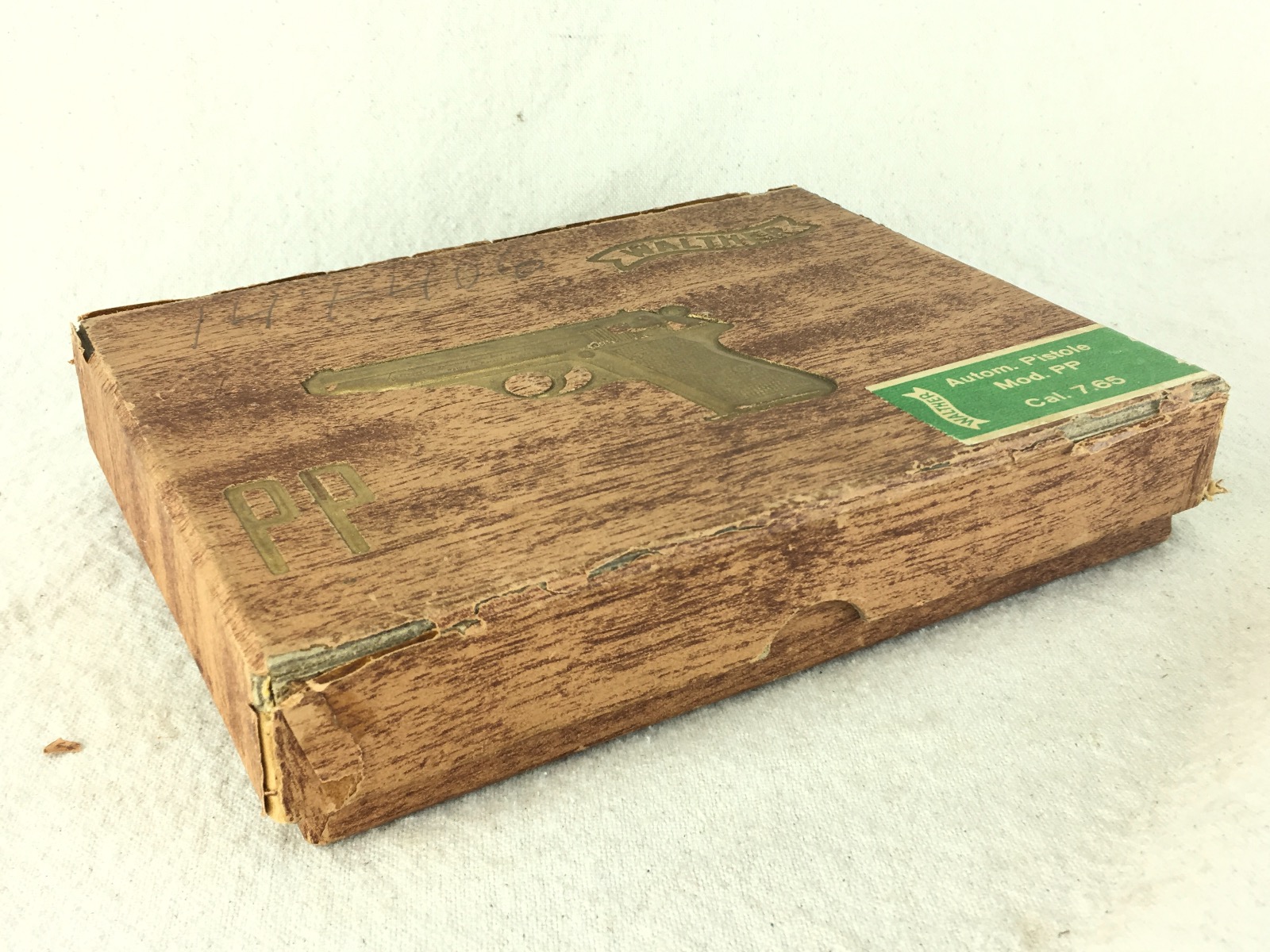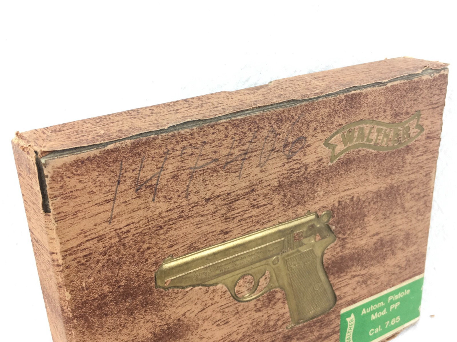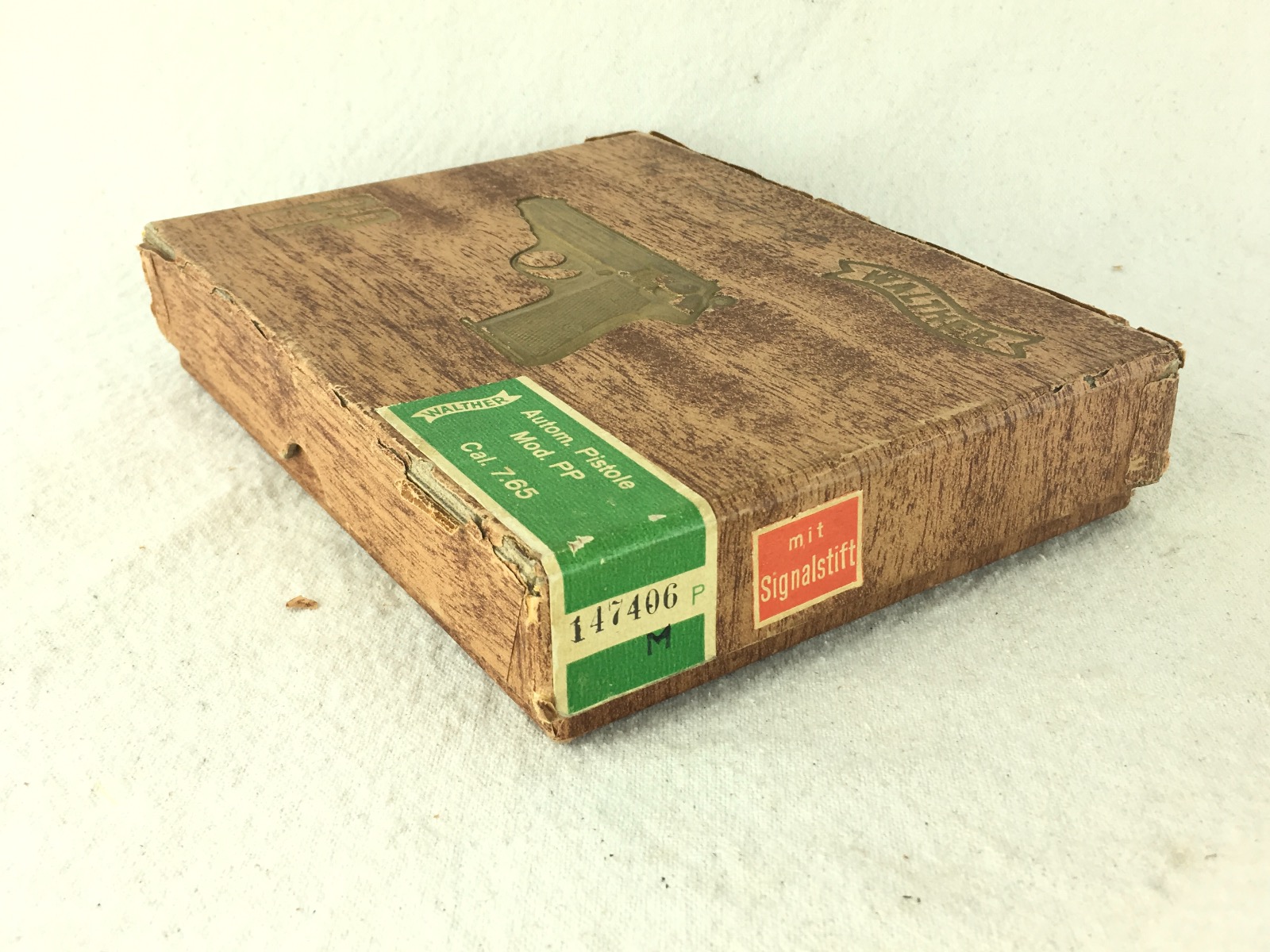 1/31/19- This is a WW2 original (1930s-40s) Walther PP box. The box has the original labels from the factory, and shows serial number 147406 as the original gun that was issued with this box. The box is completely intact, but has a small paper de-lamination at the top. Serial # also written in pencil on the front. Overall, the box has normal light edge & surface wear but no major issues and structurally excellent. There is no tape, glue or any other repairs evident. Internal divider intact and secure. Guaranteed original.