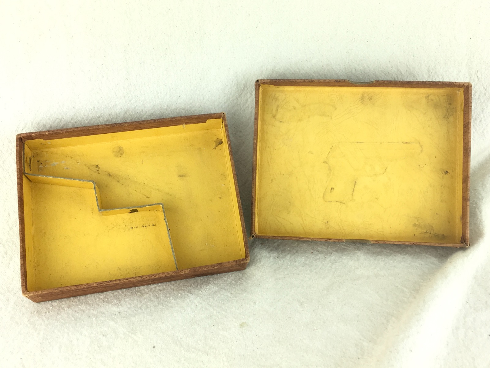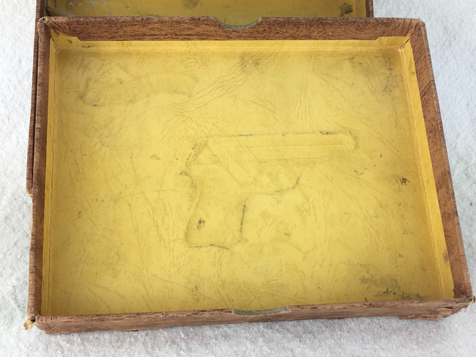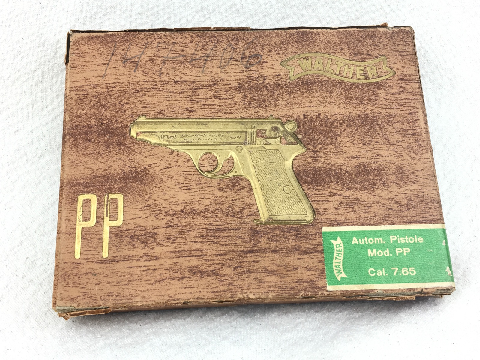 1/31/19- This is a WW2 original (1930s-40s) Walther PP box. The box has the original labels from the factory, and shows serial number 147406 as the original gun that was issued with this box. The box is completely intact, but has a small paper de-lamination at the top. Serial # also written in pencil on the front. Overall, the box has normal light edge & surface wear but no major issues and structurally excellent. There is no tape, glue or any other repairs evident. Internal divider intact and secure. Guaranteed original.