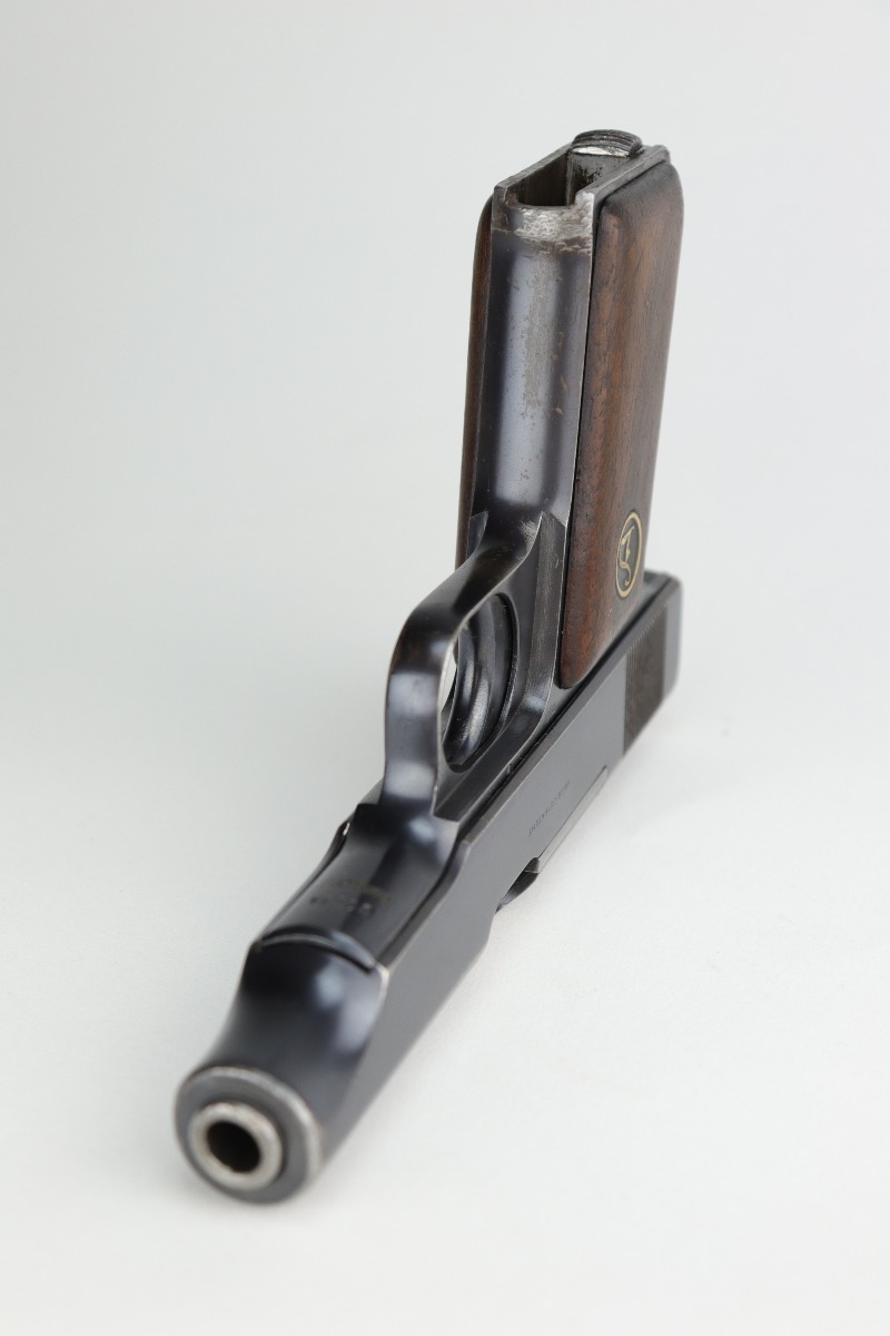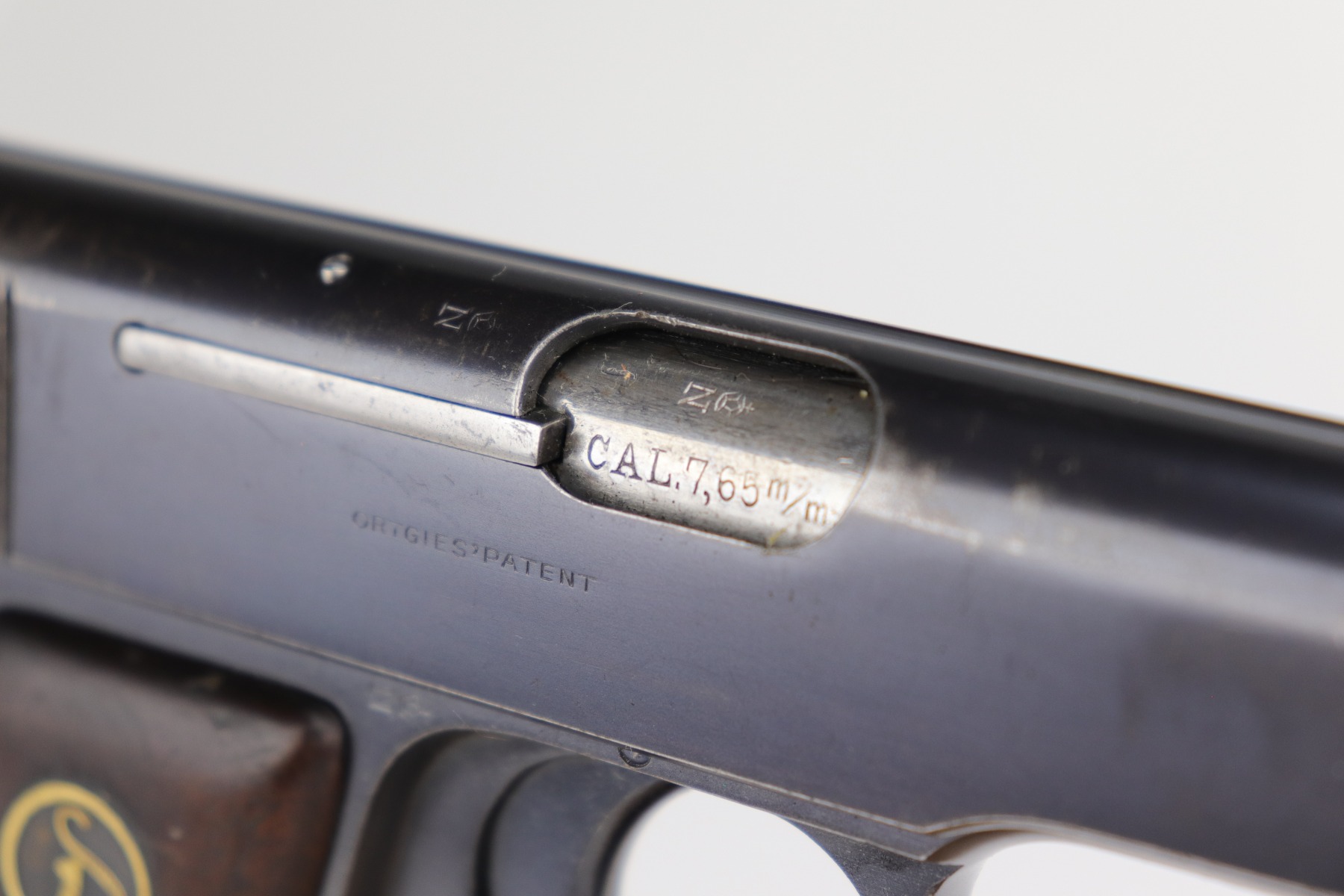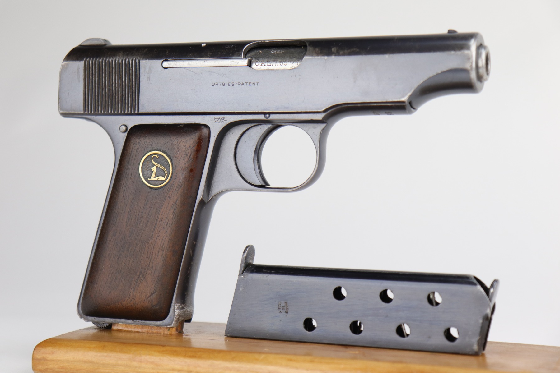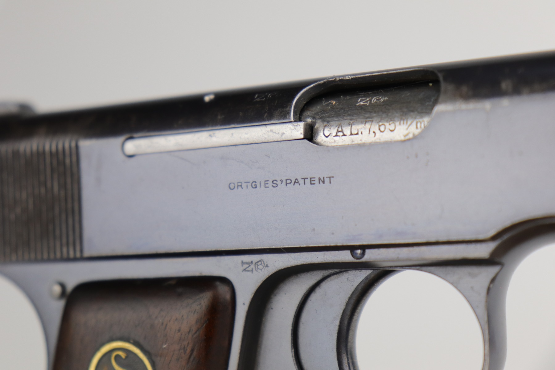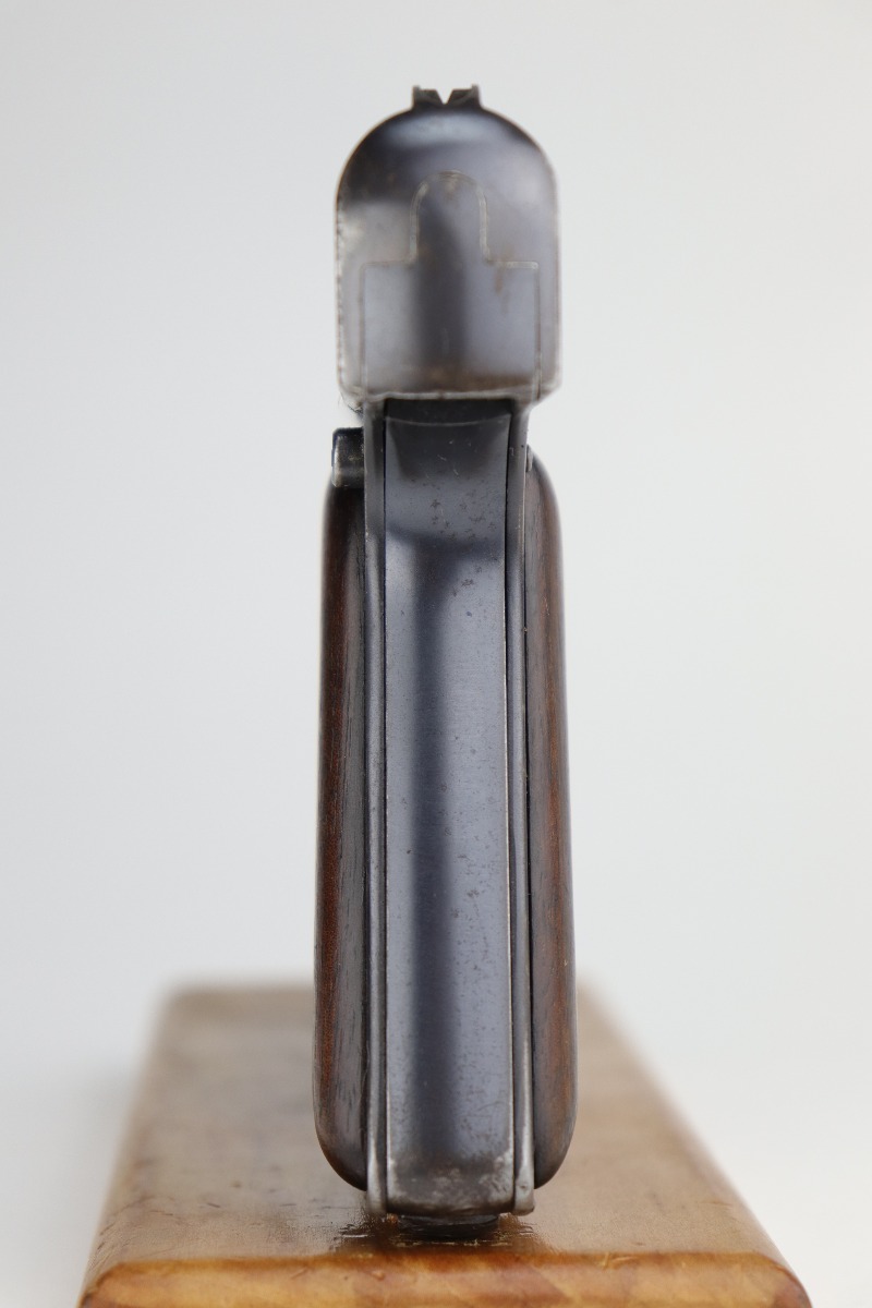 9/17/20 – This is a very nice example of an original Ortgies Pistol manufactured in the 1920’s. Germany export mark on the underside of the frame. It has retained around 93% of its original bluing. There is minor muzzle wear and wear on the high edges of the slide. There are a few spotty areas on wear and small scratches along the peak of the right side of the slide and at the rear of the slide, around the tang. There is also minor freckling on the high edge of the same area. There is wear at the base of both straps and minor dings on the front strap throughout. Also small dings on the underside of the trigger guard. Minor freckling on the back strap. It has excellent original grips and comes with a reproduction magazine. The bore is very nice – strong rifling. The gun is fully functional.