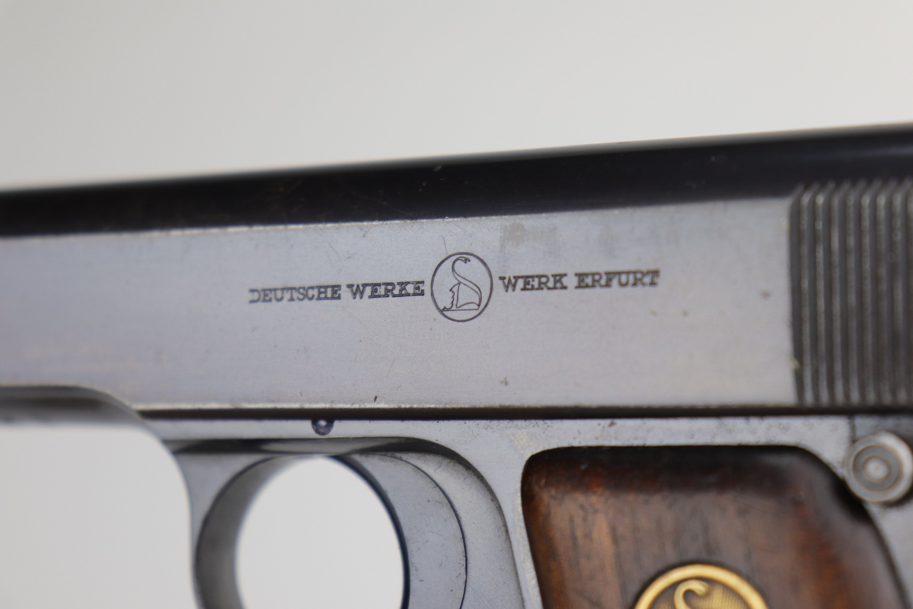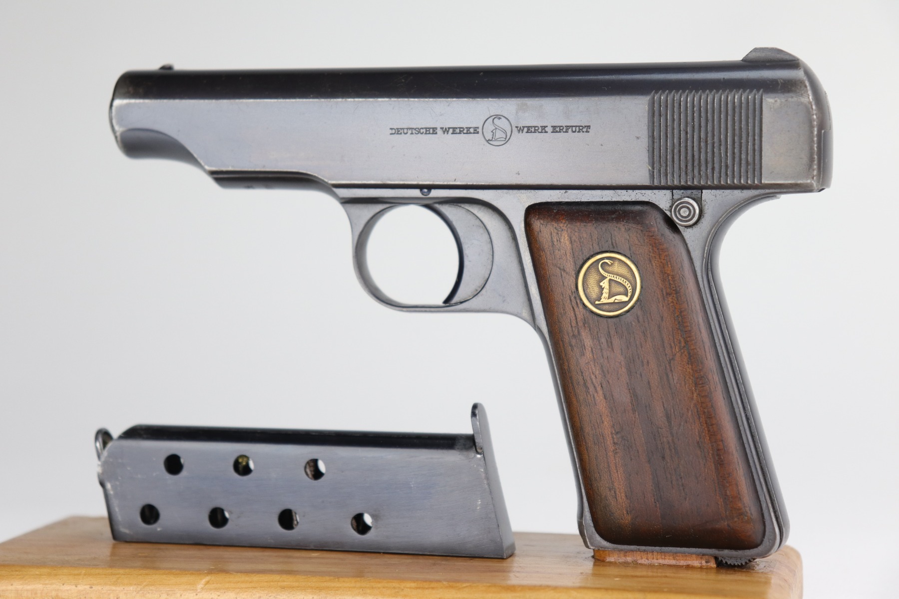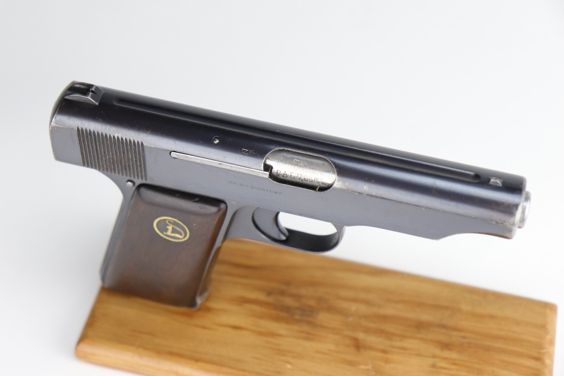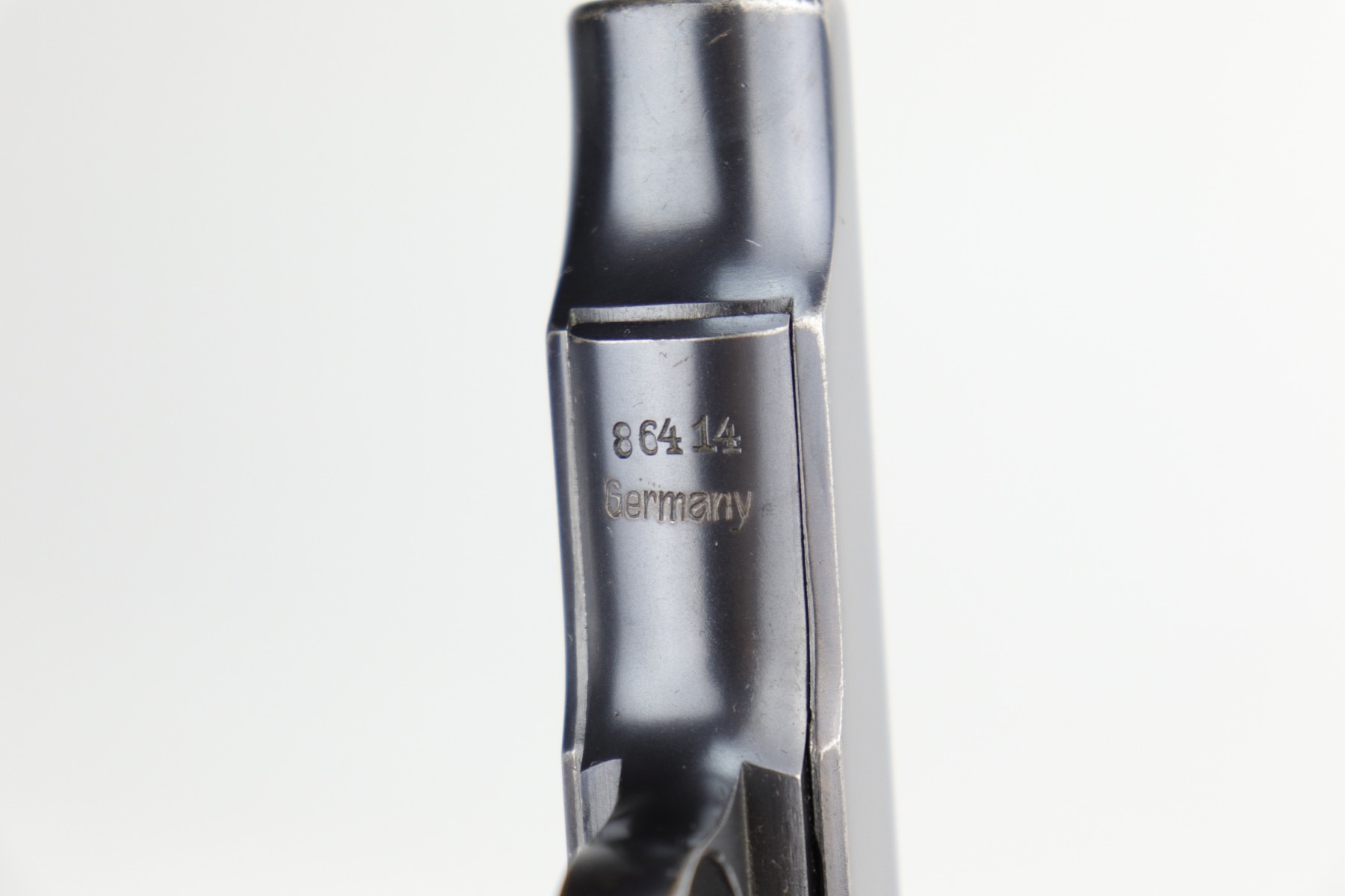 9/17/20 – This is a very nice example of an original Ortgies Pistol manufactured in the 1920’s. Germany export mark on the underside of the frame. It has retained around 93% of its original bluing. There is minor muzzle wear and wear on the high edges of the slide. There are a few spotty areas on wear and small scratches along the peak of the right side of the slide and at the rear of the slide, around the tang. There is also minor freckling on the high edge of the same area. There is wear at the base of both straps and minor dings on the front strap throughout. Also small dings on the underside of the trigger guard. Minor freckling on the back strap. It has excellent original grips and comes with a reproduction magazine. The bore is very nice – strong rifling. The gun is fully functional.