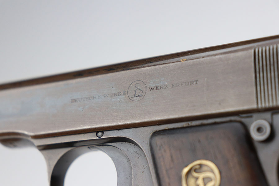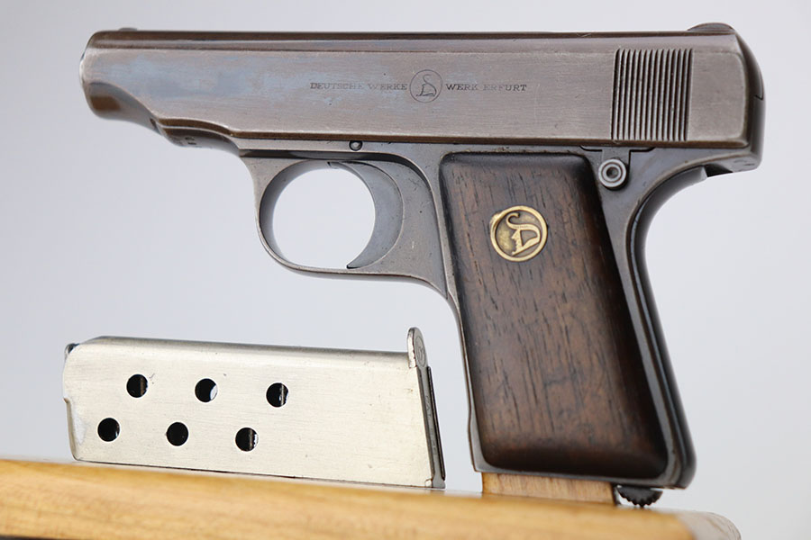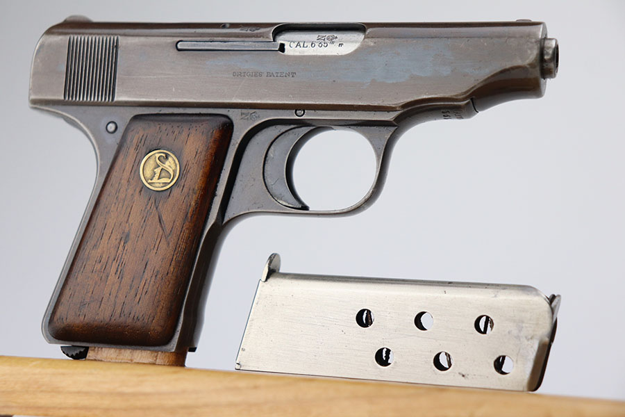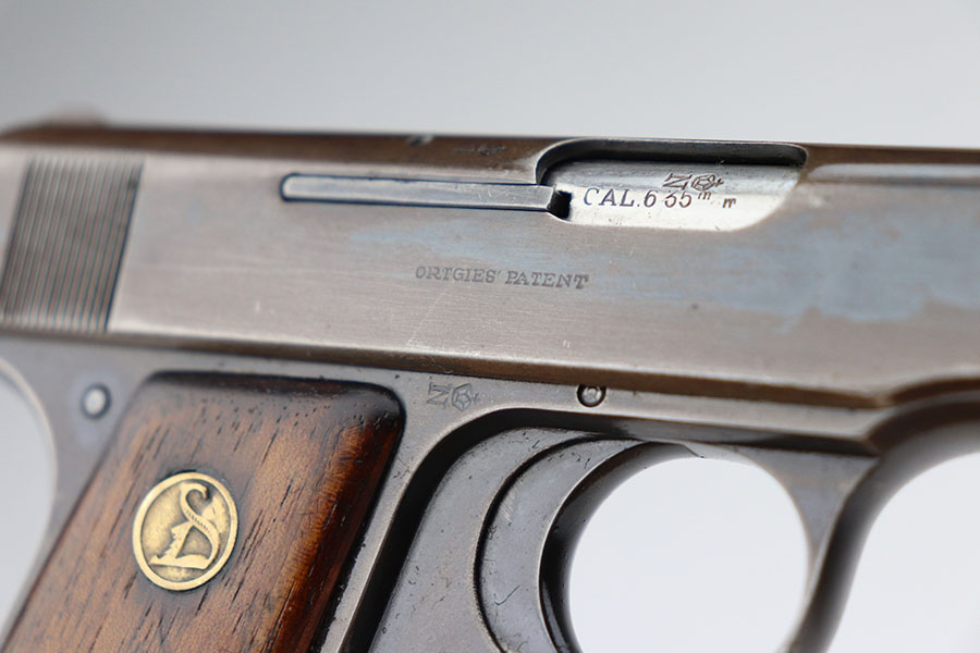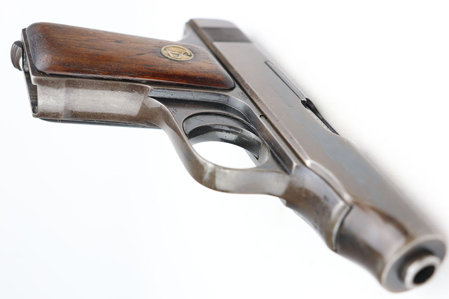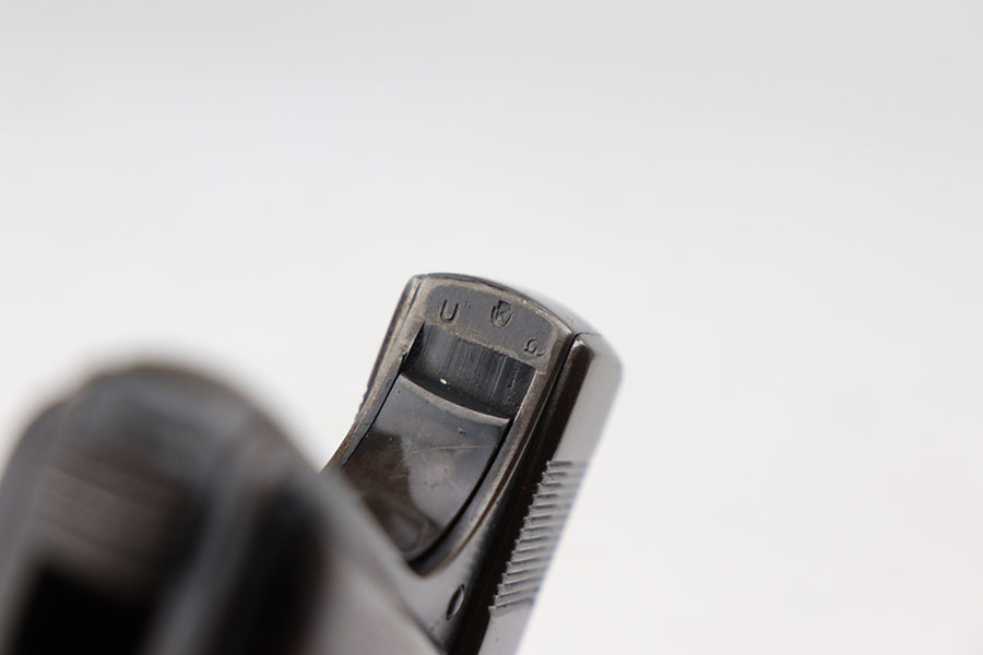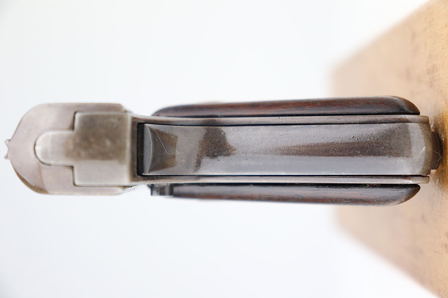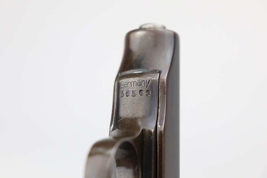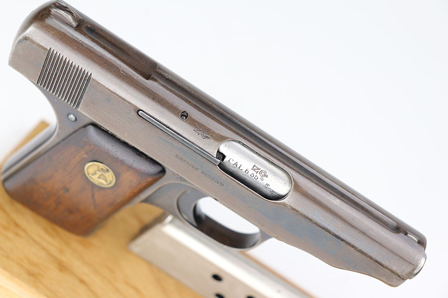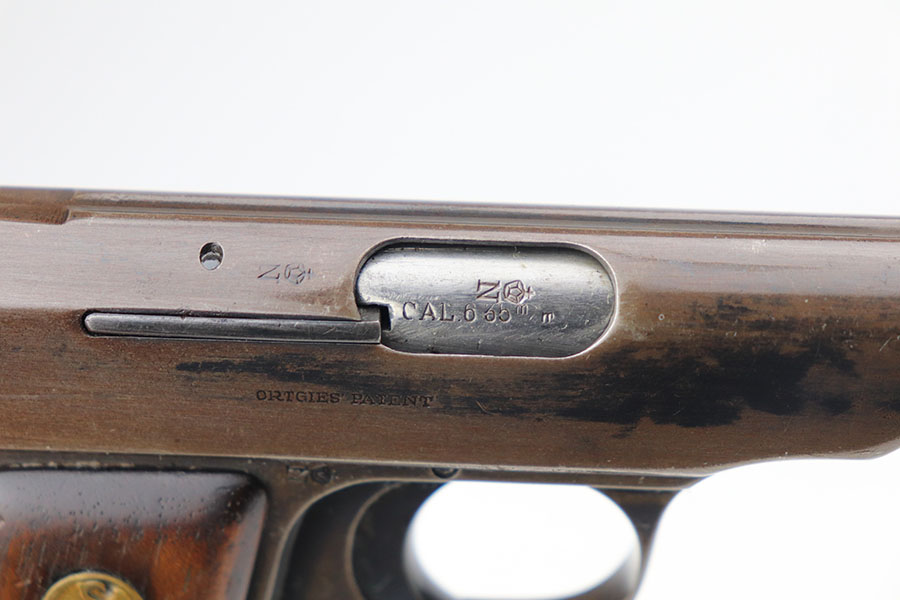 2/8/21 – This is a nice exmaple of an Ortgies Pocket Pistol, chambered in 6.35mm. There is a Germany export mark, indicating it was sold in the international commercial market. The finish is a little difficult to rate with all of the patina, but our best guess is about 50%. There is an even layer of brown patina throughout. It comes with nice grips and one magazine. The left grip panel is a little loose. The rifling in the bore is decent, but there is pitting throughout.