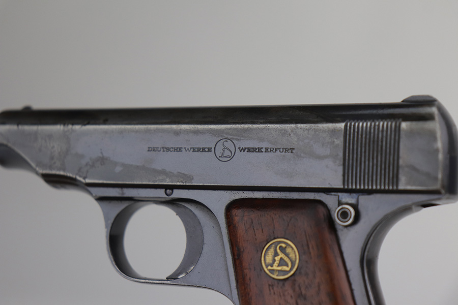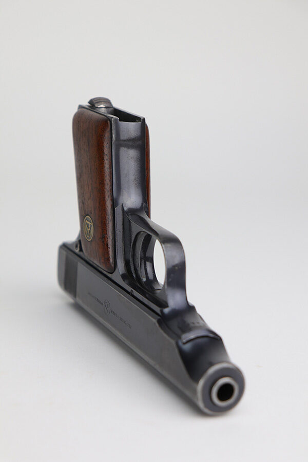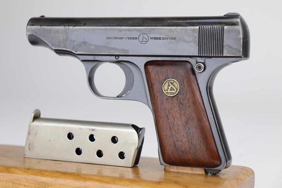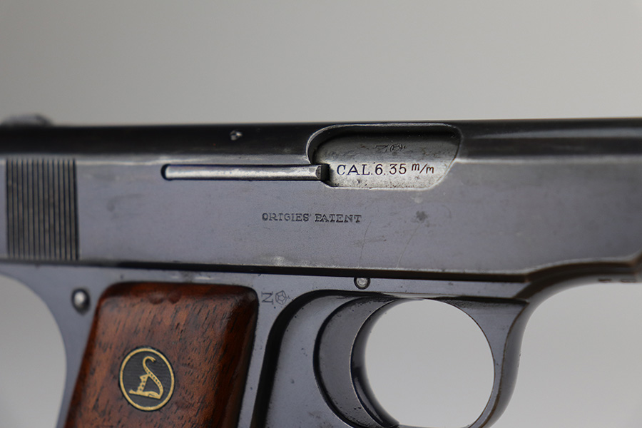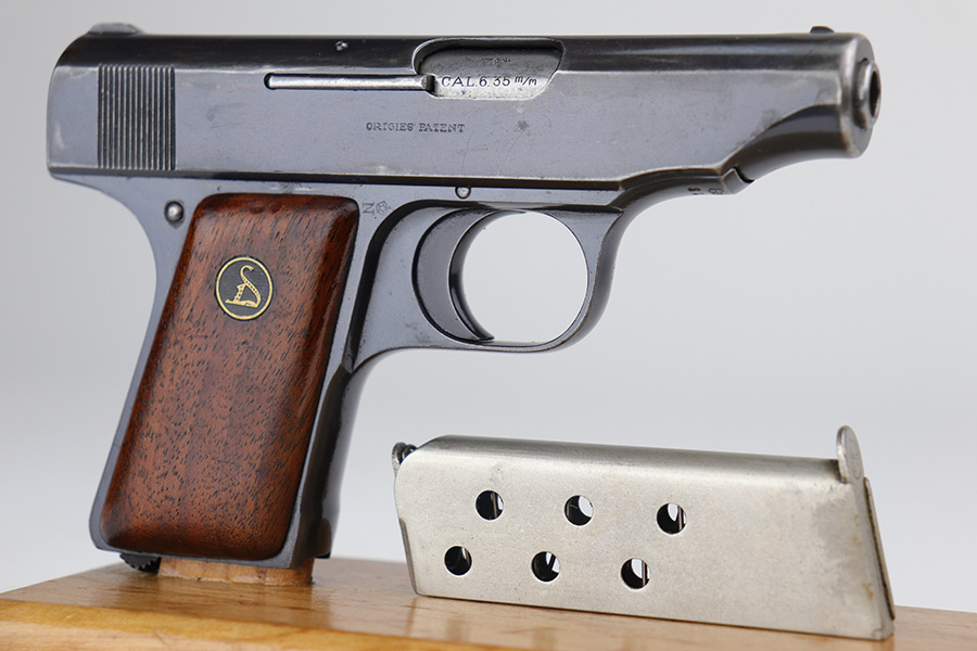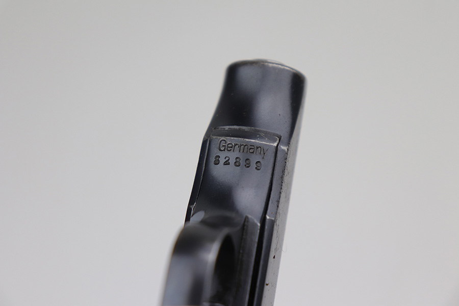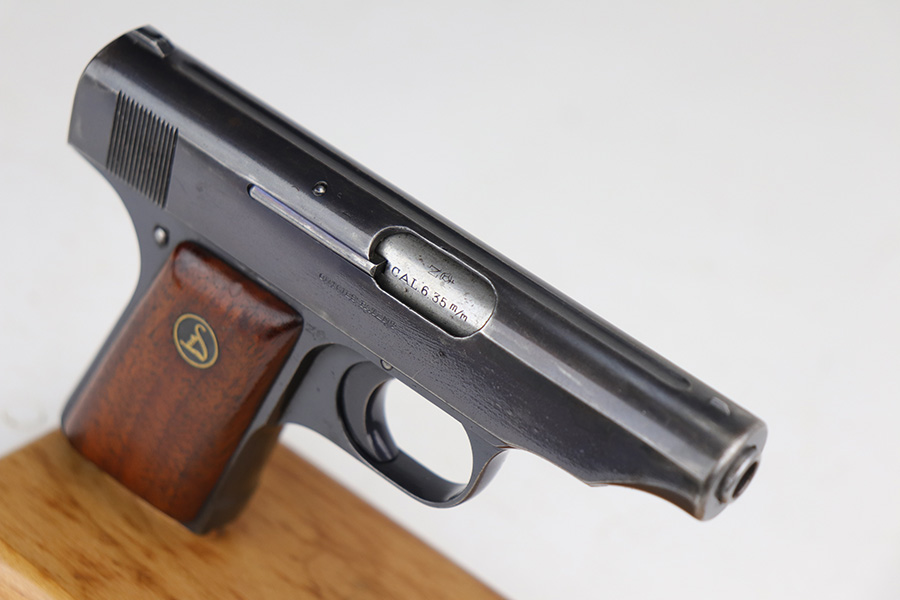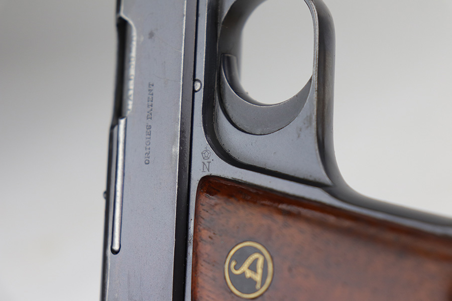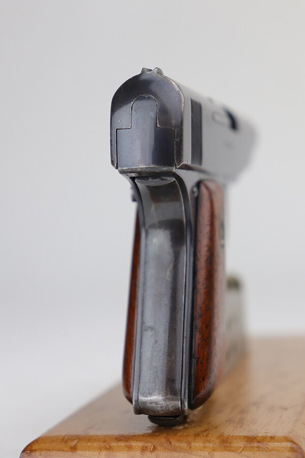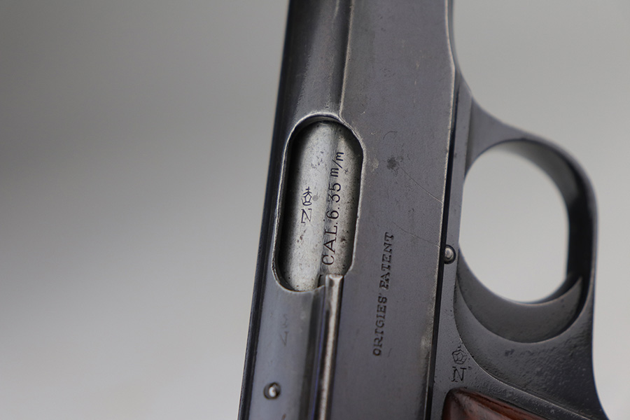 10/21/21 – This is a nice example of an Ortgies Pocket Pistol, chambered in 6.35mm. It is all matching and has the proper “Crown N” commercial proofs. There is a “Germany” export marking on the underside of the frame. It has retained roughly 70-75% of its original finish. Most of the finish loss is on the left side and top of the slide, where the finish loss is splotchy. Also on the left side of the slide, there are areas of oxidation and minor pitting. There is also spotty wear around the muzzle, on the right side of the slide, and on the back strap. Comes with excellent original wood grips and a period-correct factory satin-nickeled magazine. The rifling in the bore is a bit weak with minor oxidation and tiny pits in the grooves.