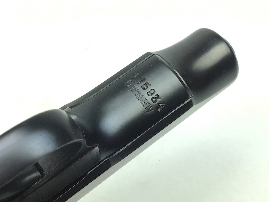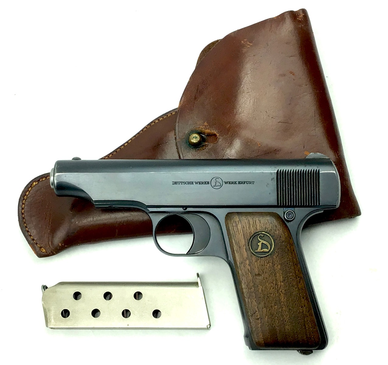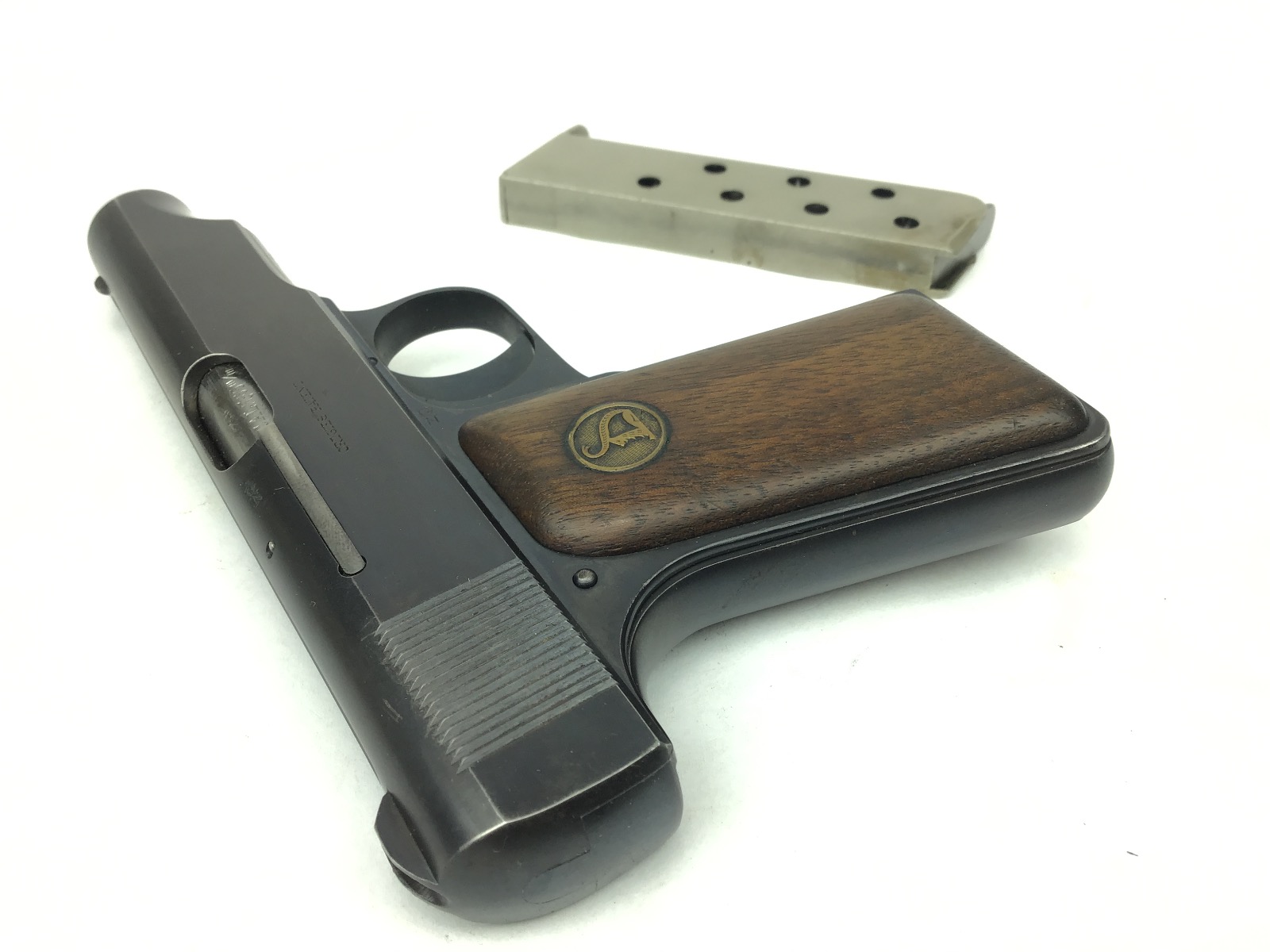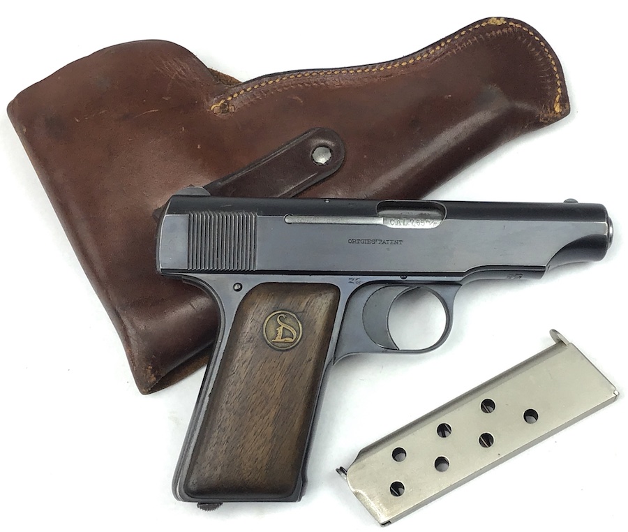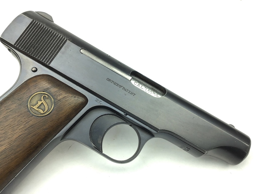 10/27/20 – This is a minty example of an Ortgies Vest Pocket Pistol, chambered in .32 ACP. (7.65mm) Includes a nice, leather flap holster. This particular gun has a Germany export mark and has a later-style slide legend and grips. It has “Crown N” proofs. It has retained about 98% of its original bluing. There is very faint high edge wear on the slide here and there. Excellent, original grips. Comes with original nickel magazine. Very clean bore with strong rifling and rates 9.5/10.