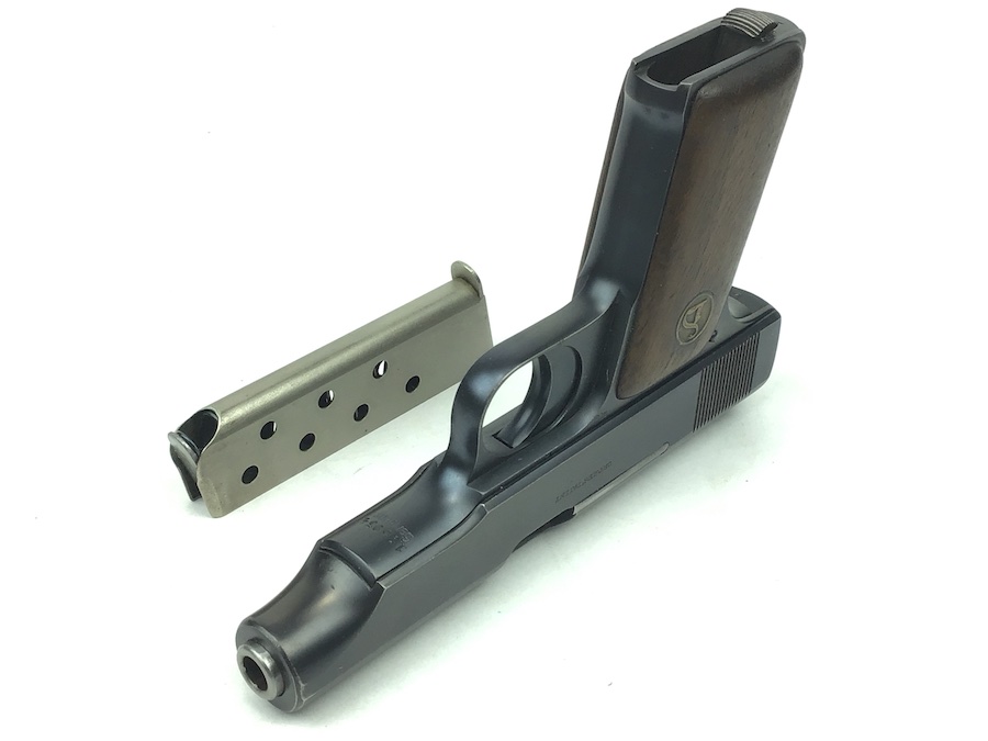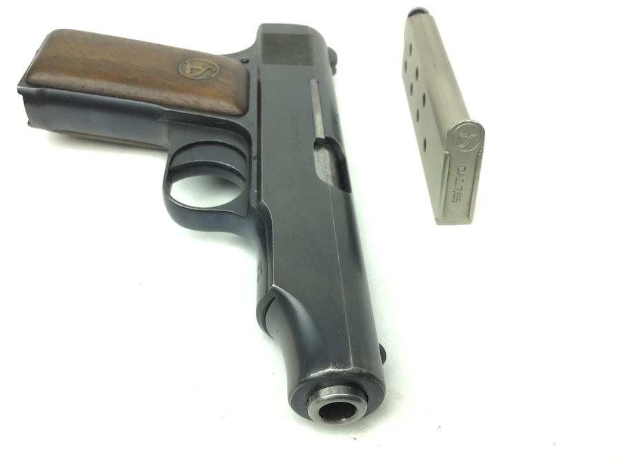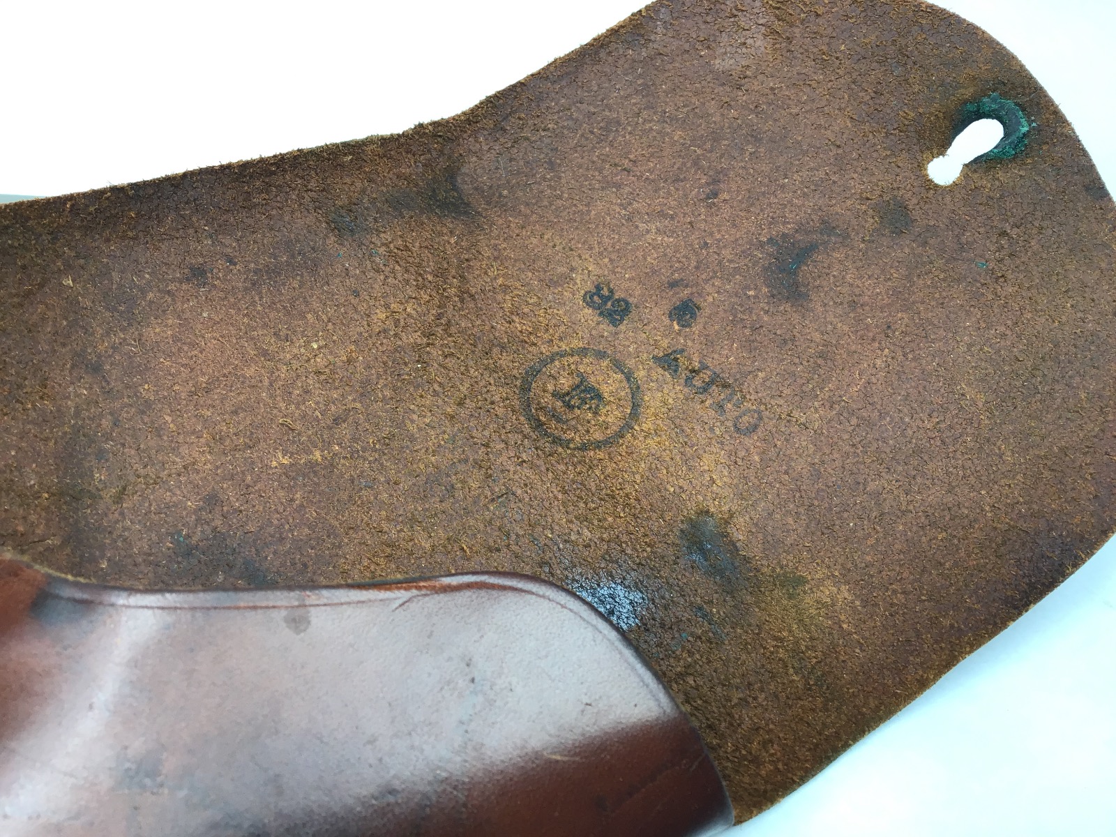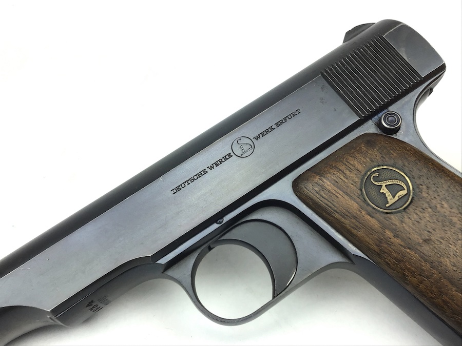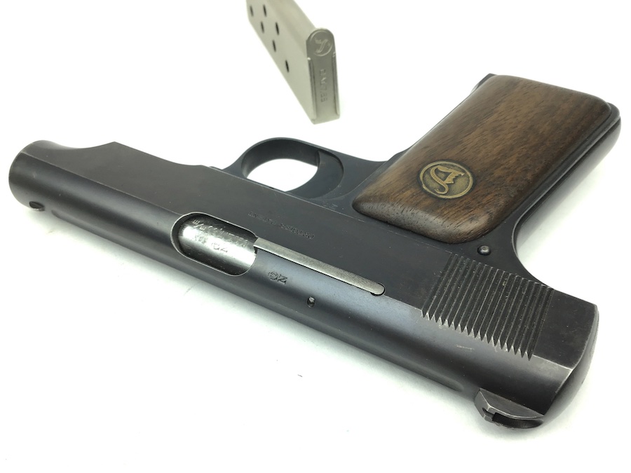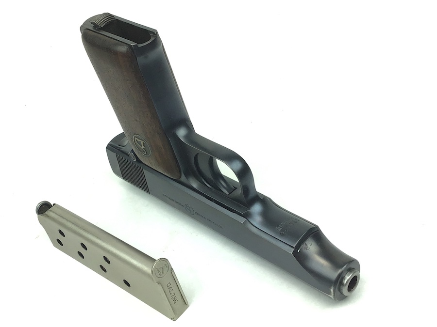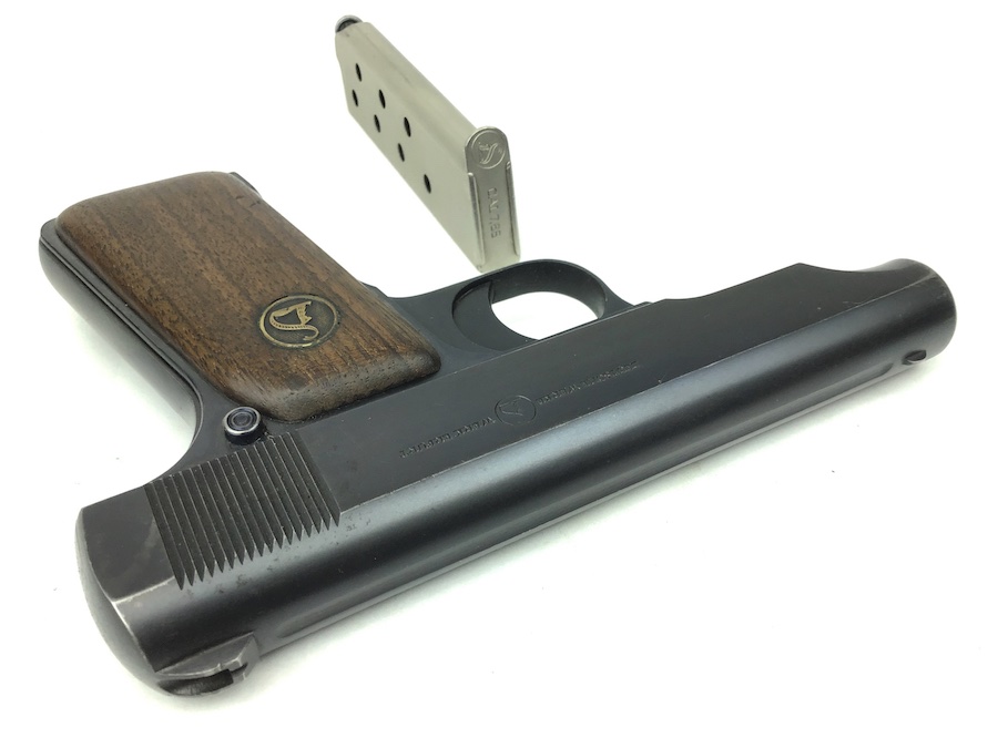 10/27/20 – This is a minty example of an Ortgies Vest Pocket Pistol, chambered in .32 ACP. (7.65mm) Includes a nice, leather flap holster. This particular gun has a Germany export mark and has a later-style slide legend and grips. It has “Crown N” proofs. It has retained about 98% of its original bluing. There is very faint high edge wear on the slide here and there. Excellent, original grips. Comes with original nickel magazine. Very clean bore with strong rifling and rates 9.5/10.