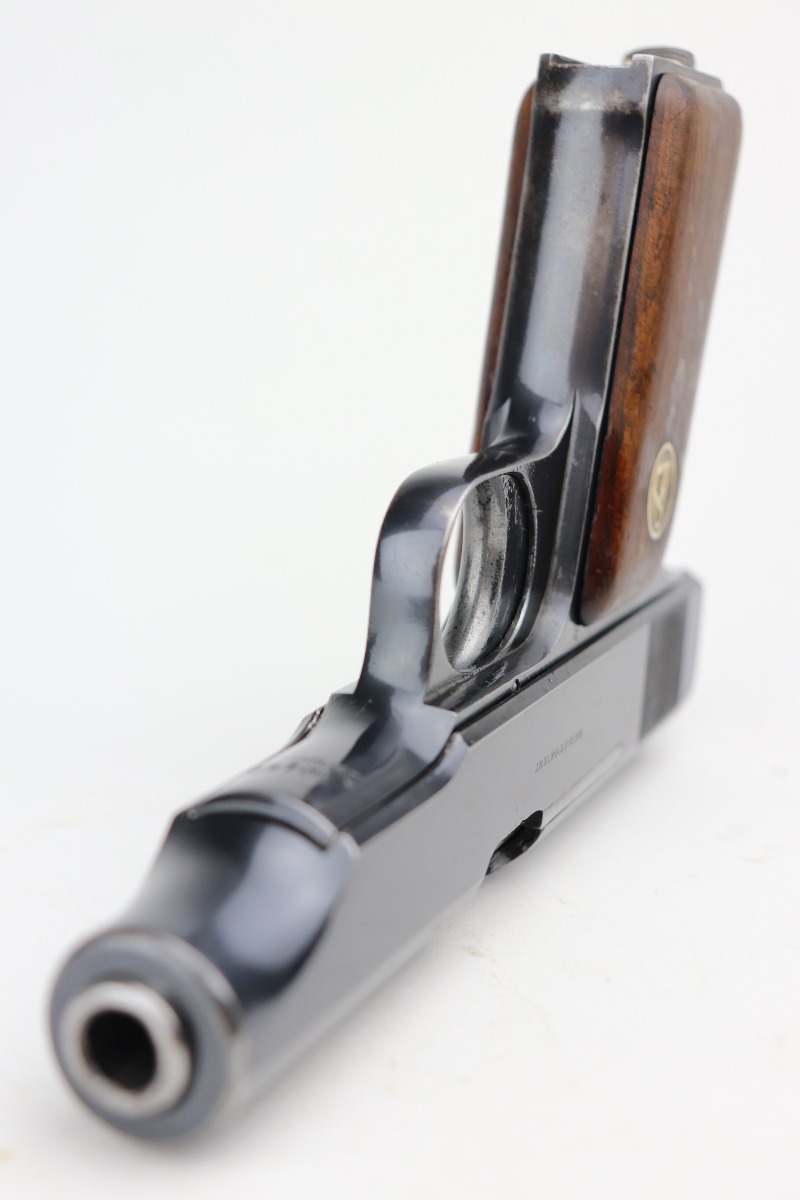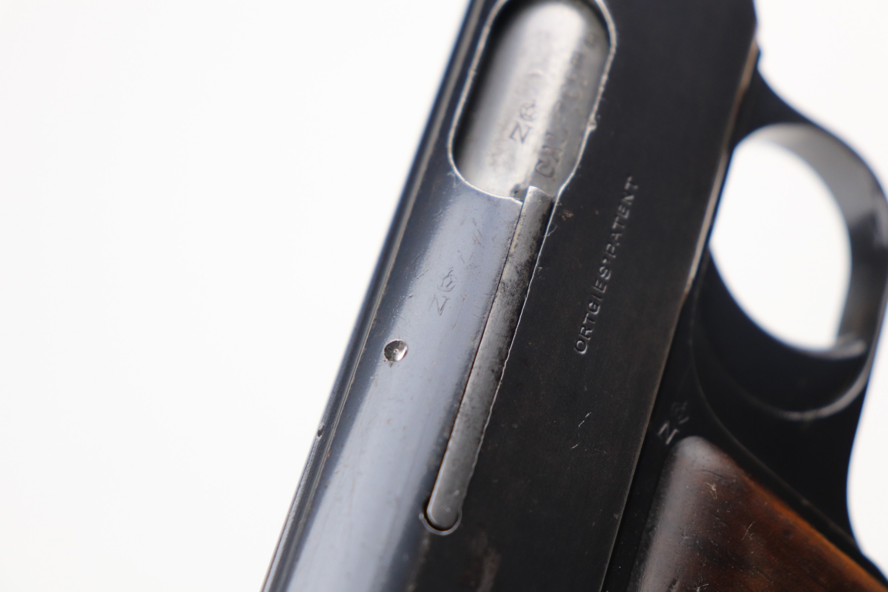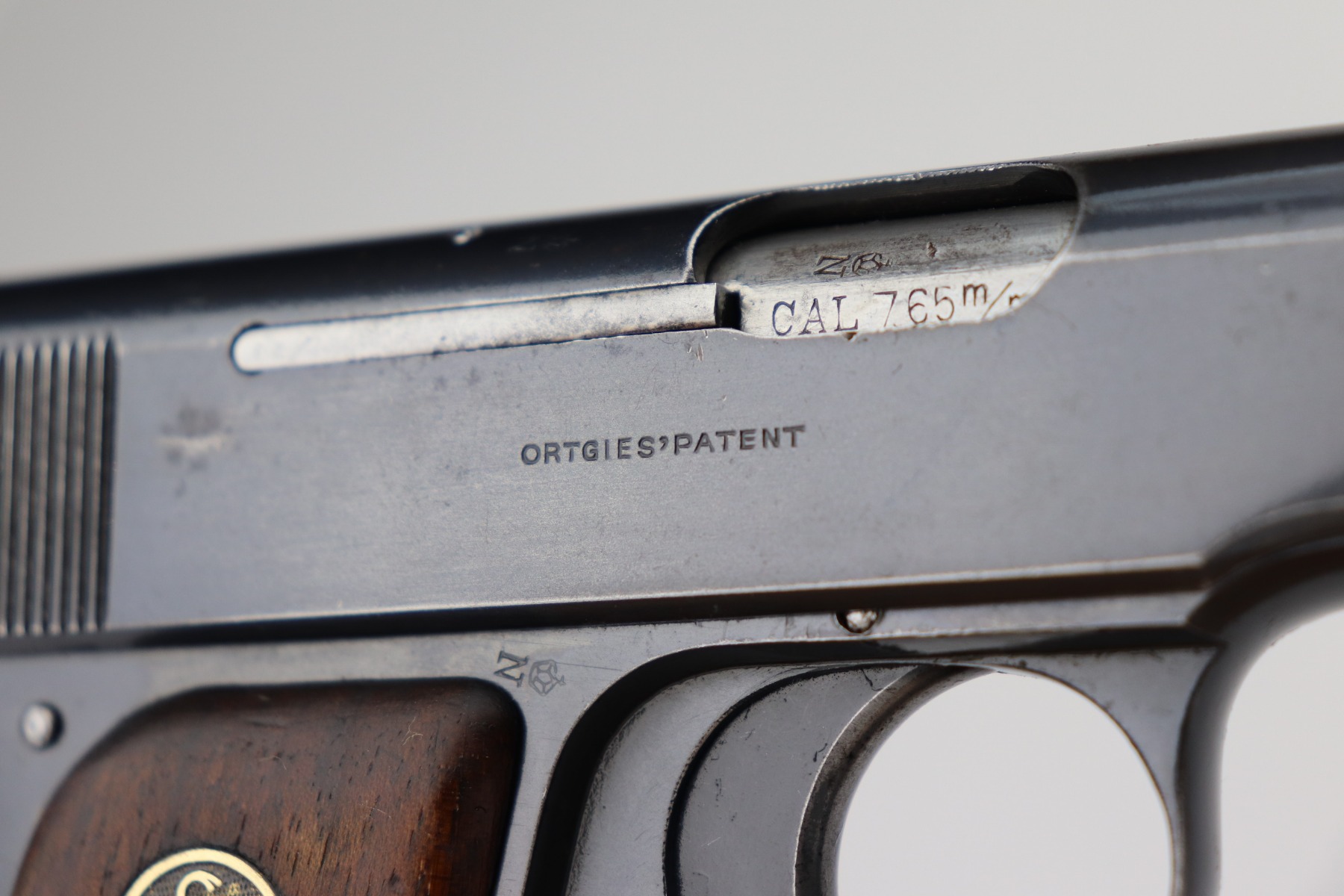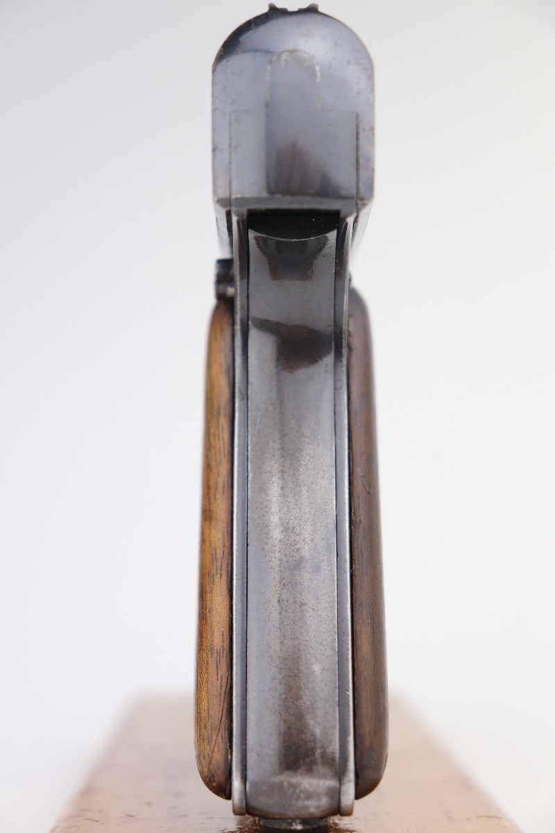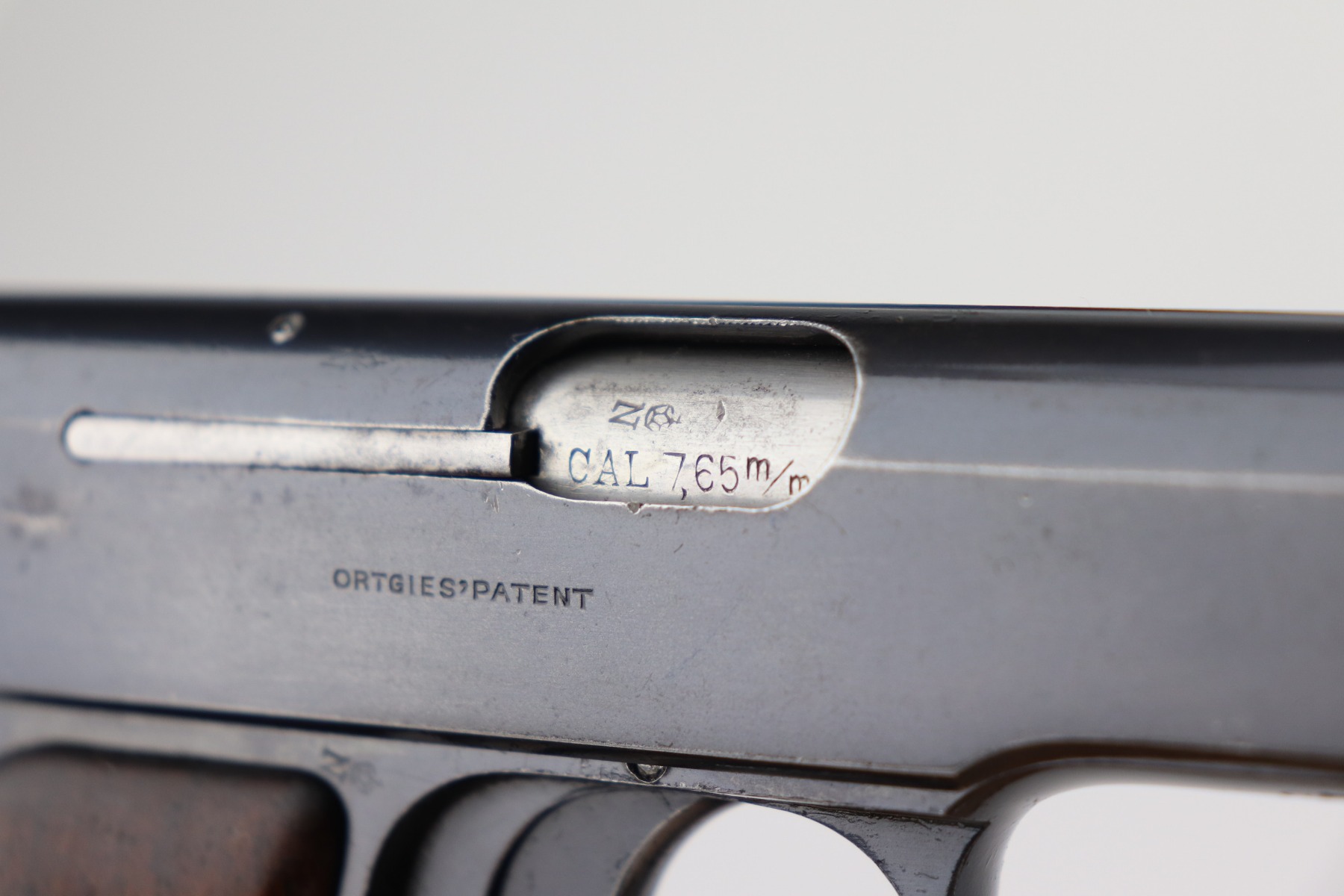 3/5/21 – This is a very nice example of an Ortgies Pistol manufactured in the 1920’s. It is all matching and has the proper “Crown N” proofs. It has retained about 92-93% of its original bluing. There is minor wear around the muzzle and high edges. Spotty wear on the straps. Spotty oxidation here and there, most noticeable on the left side of the slide and the straps. Excellent grips and a nickel magazine. The rifling in the bore is a bit weak, and there is oxidation throughout.