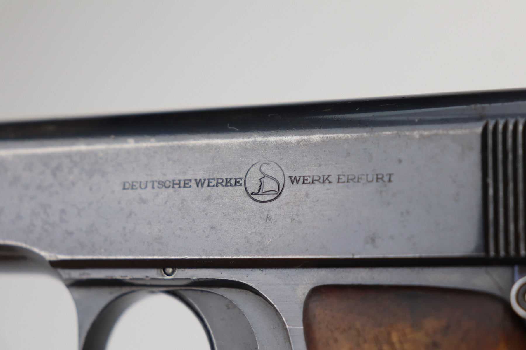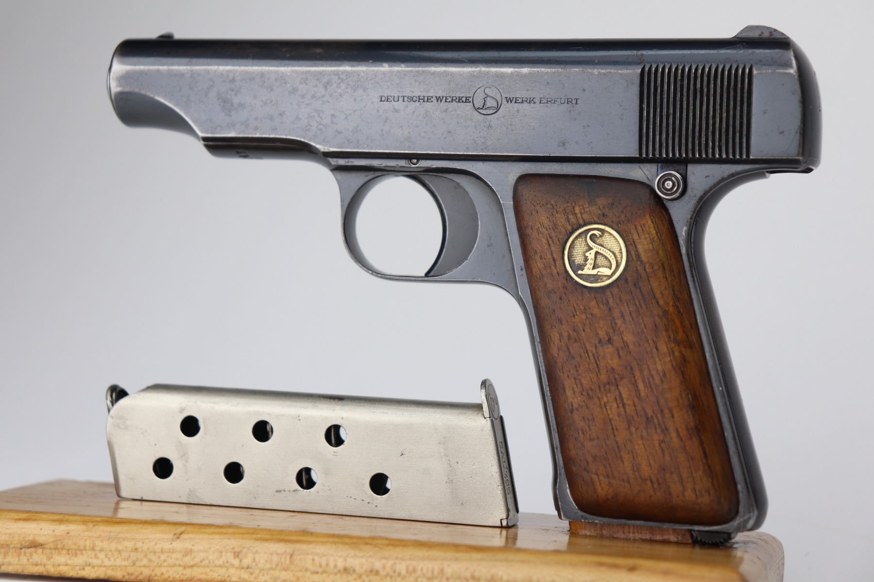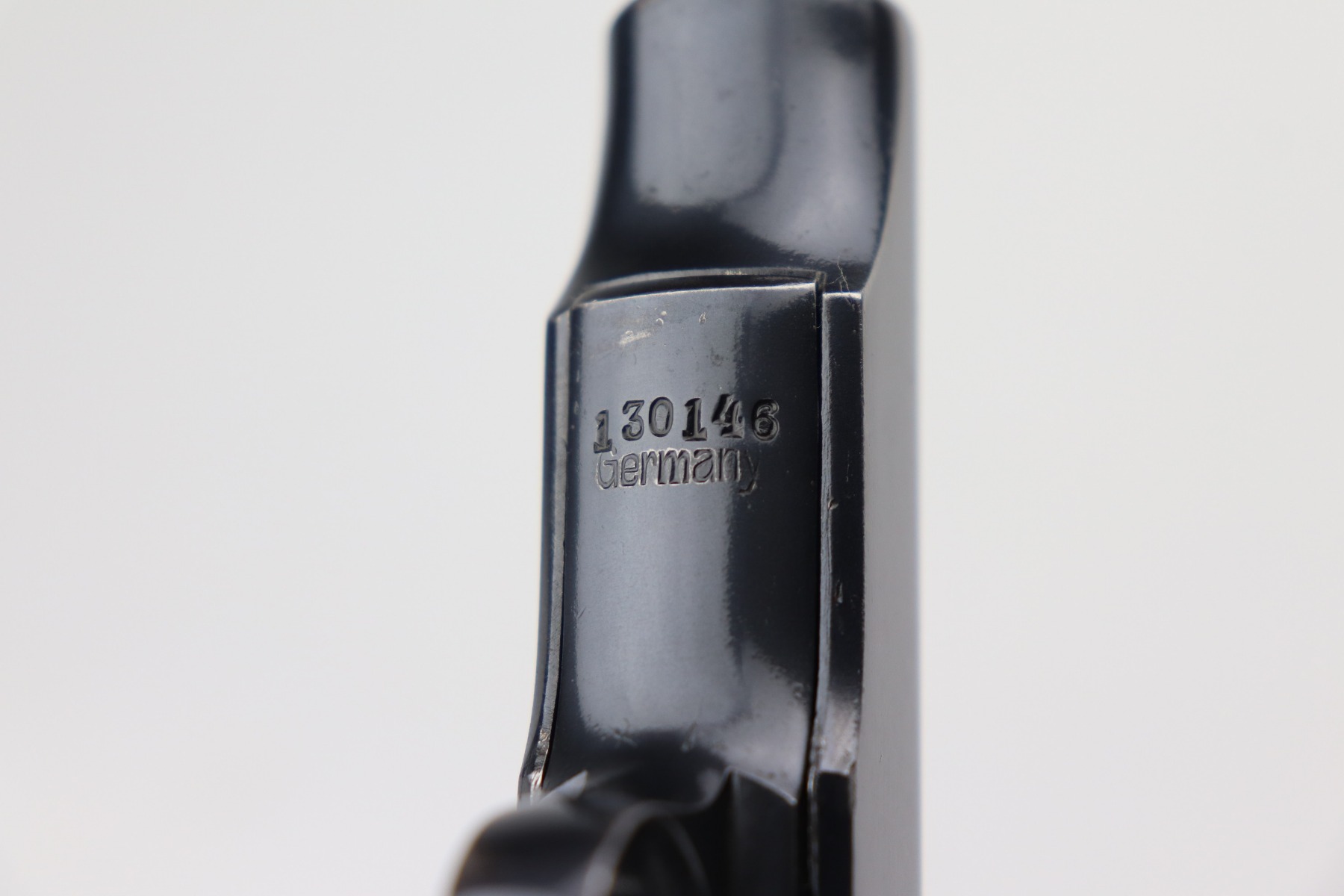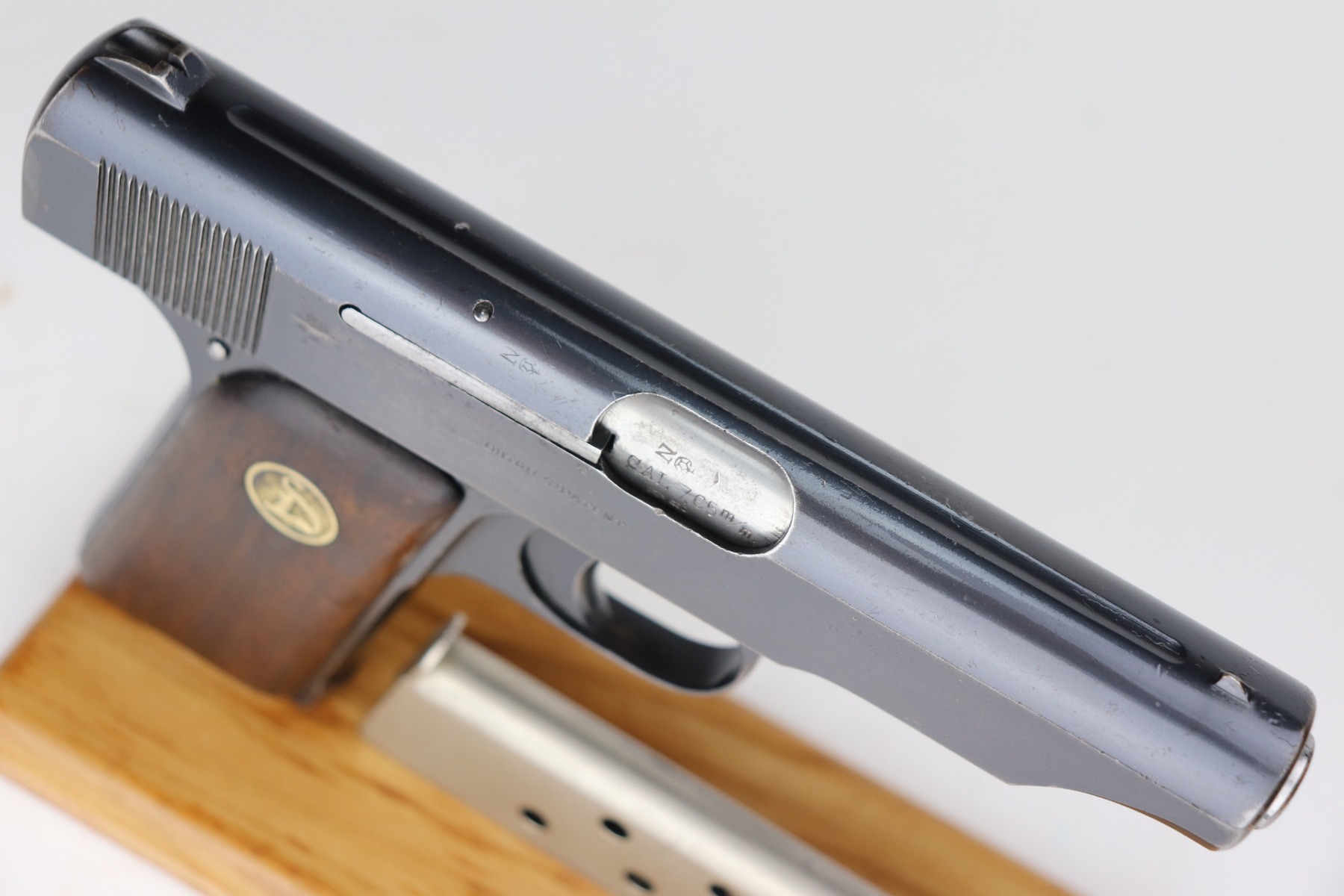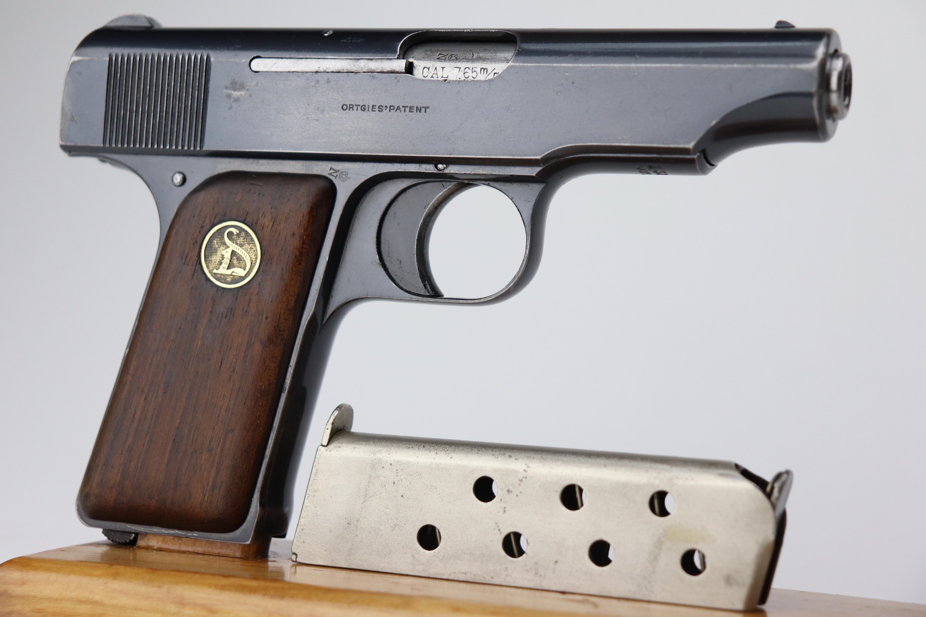 3/5/21 – This is a very nice example of an Ortgies Pistol manufactured in the 1920’s. It is all matching and has the proper “Crown N” proofs. It has retained about 92-93% of its original bluing. There is minor wear around the muzzle and high edges. Spotty wear on the straps. Spotty oxidation here and there, most noticeable on the left side of the slide and the straps. Excellent grips and a nickel magazine. The rifling in the bore is a bit weak, and there is oxidation throughout.