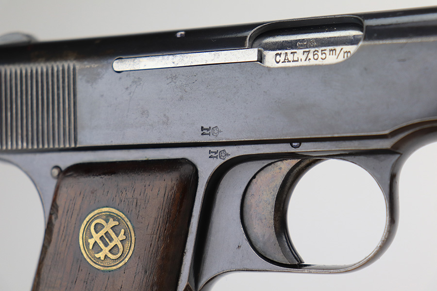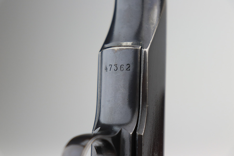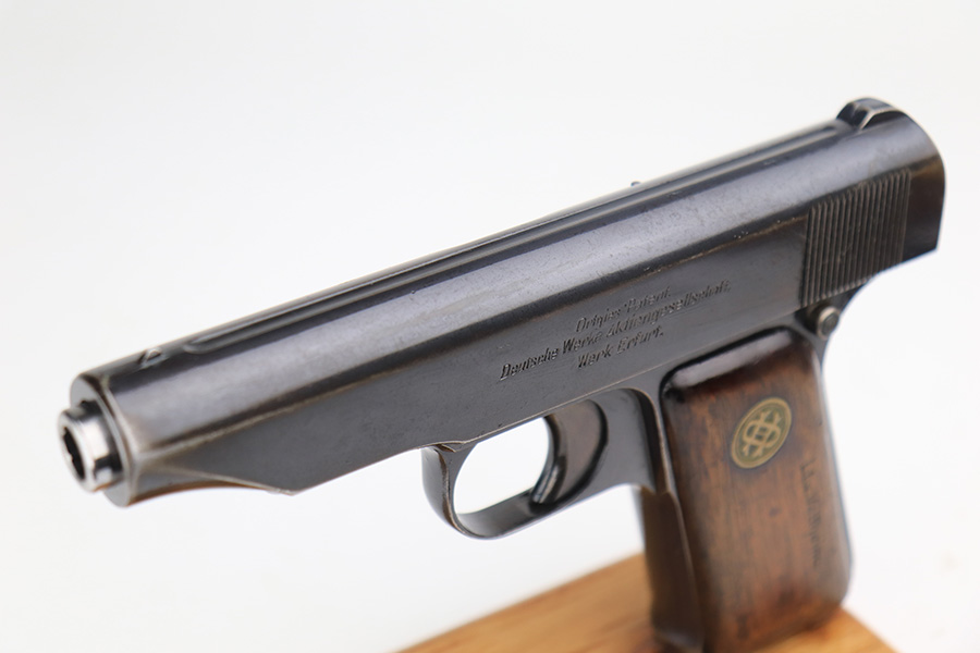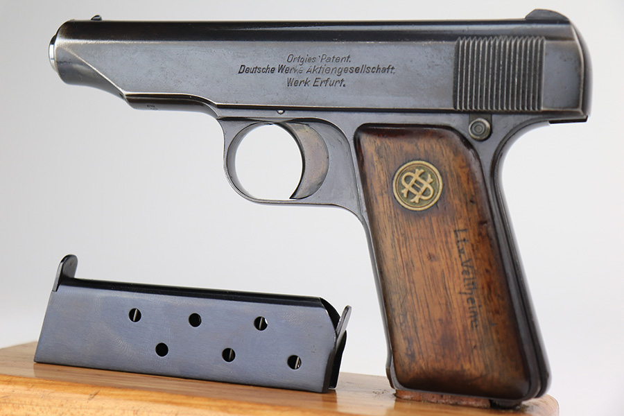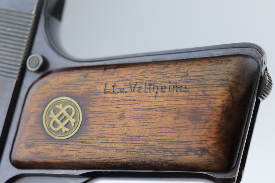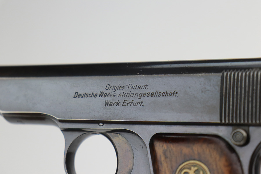 3/10/22 – This is a very nice example of an Erfurt Ortgies semi auto pistol sold in the commercial market in the 1920’s. The gun is all matching and has the proper “Crown N” commercial proofs. No “Germany” export mark. There is a name, “Lt.v. Veltheim” scratched lightly into the left grip panel. The gun has retained about 93% of its original bluing. Most of the finish loss is concentrated around the high edges of the slide and around the muzzle. There are some areas of minor pin-pricking on back strap and back right of the slide. A few tiny scratches on the front strap. Comes with nice period-correct grips (minor bruising here and there) and one post-war magazine. The bore has good rifling with some areas of very minor pin-pricking here and there.