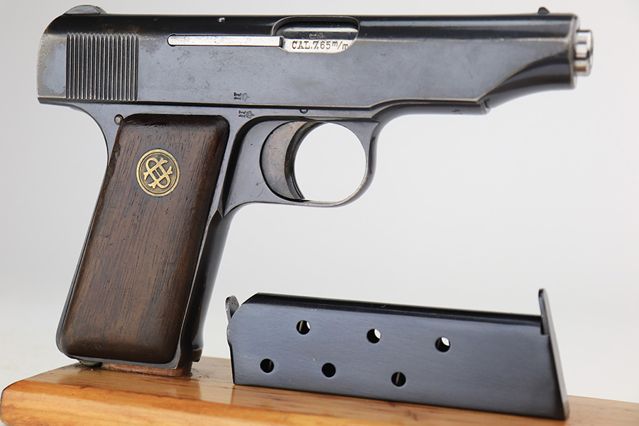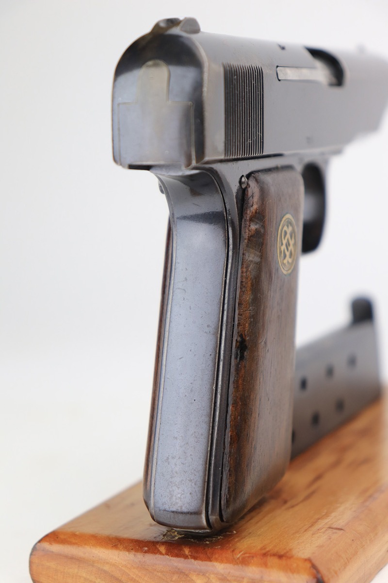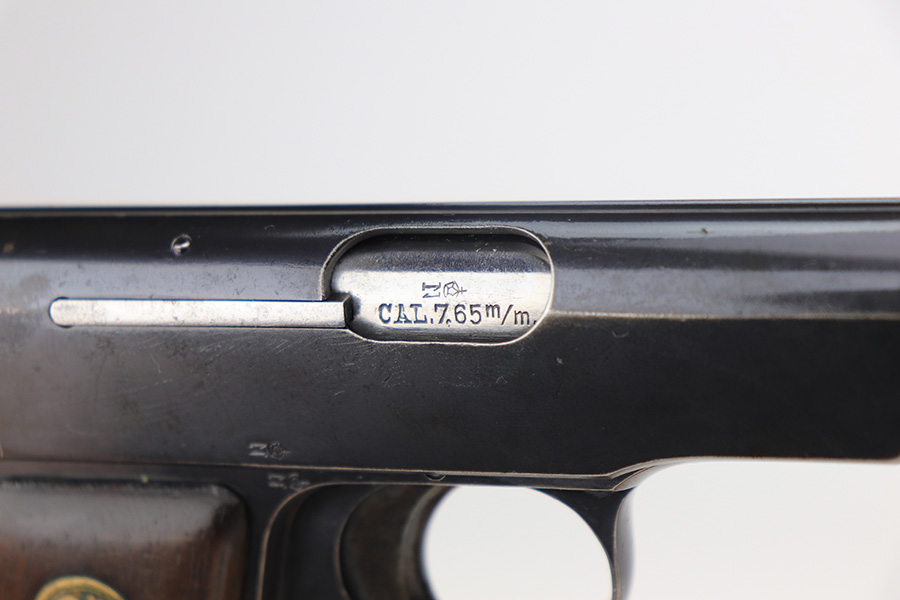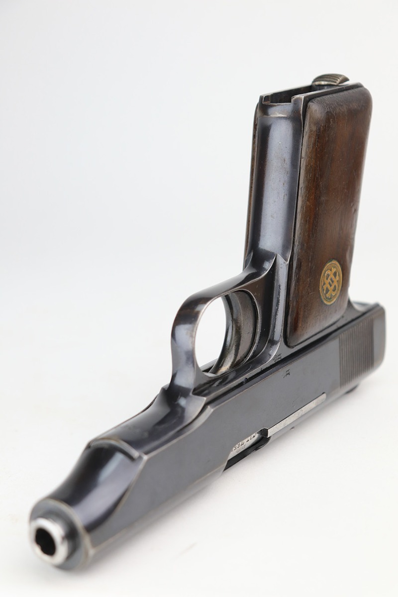 3/10/22 – This is a very nice example of an Erfurt Ortgies semi auto pistol sold in the commercial market in the 1920’s. The gun is all matching and has the proper “Crown N” commercial proofs. No “Germany” export mark. There is a name, “Lt.v. Veltheim” scratched lightly into the left grip panel. The gun has retained about 93% of its original bluing. Most of the finish loss is concentrated around the high edges of the slide and around the muzzle. There are some areas of minor pin-pricking on back strap and back right of the slide. A few tiny scratches on the front strap. Comes with nice period-correct grips (minor bruising here and there) and one post-war magazine. The bore has good rifling with some areas of very minor pin-pricking here and there.
