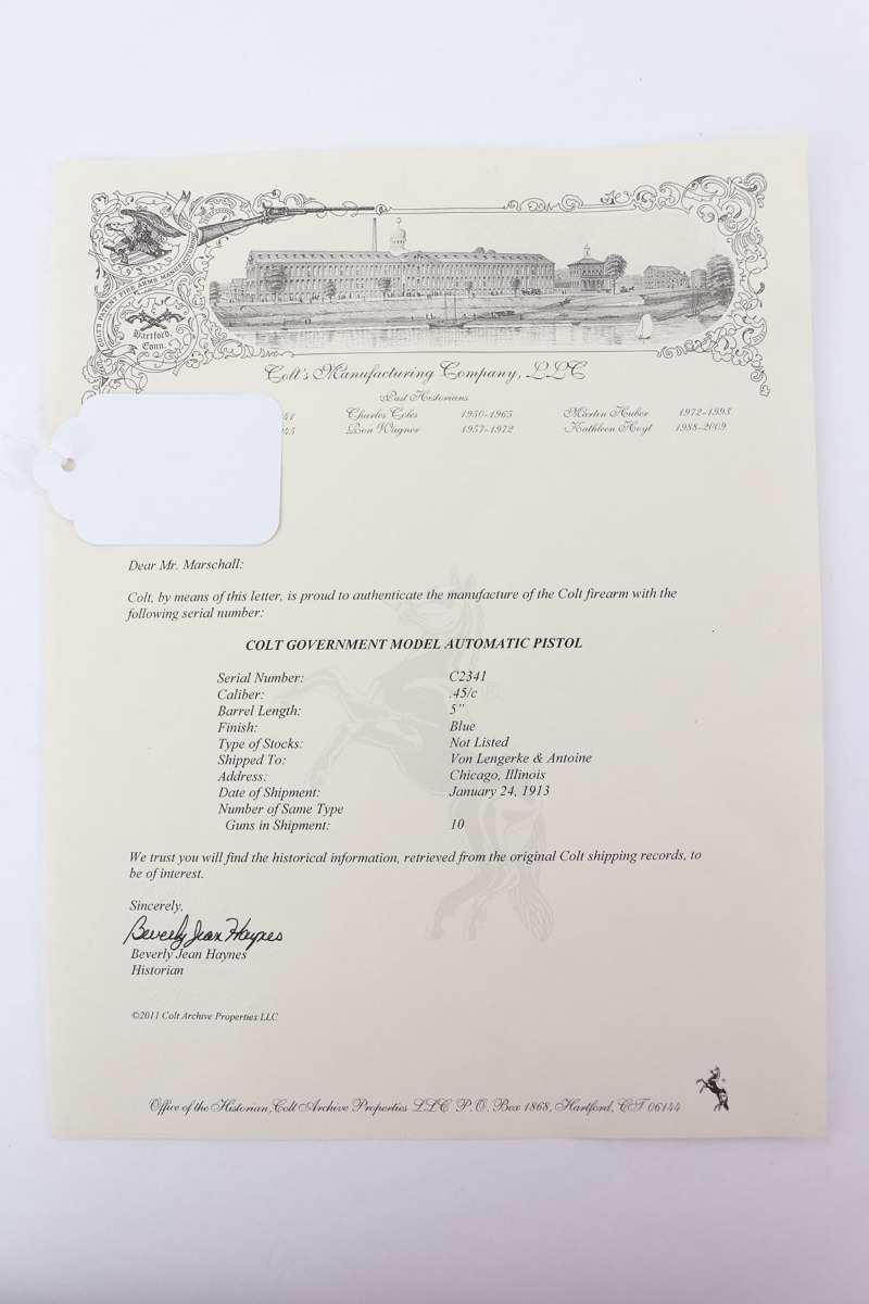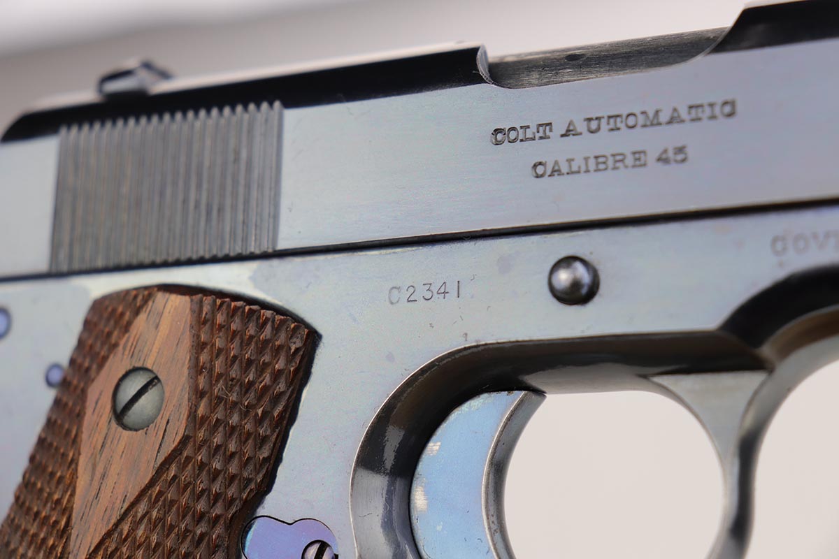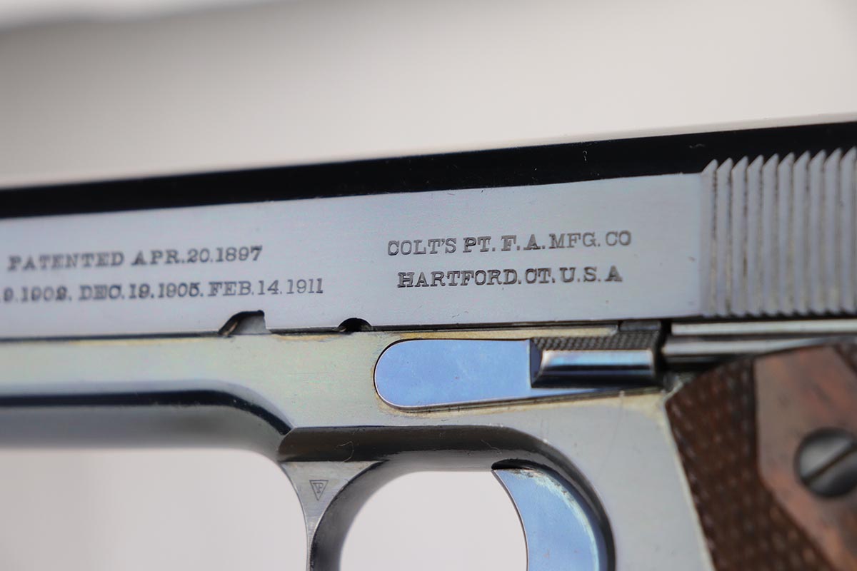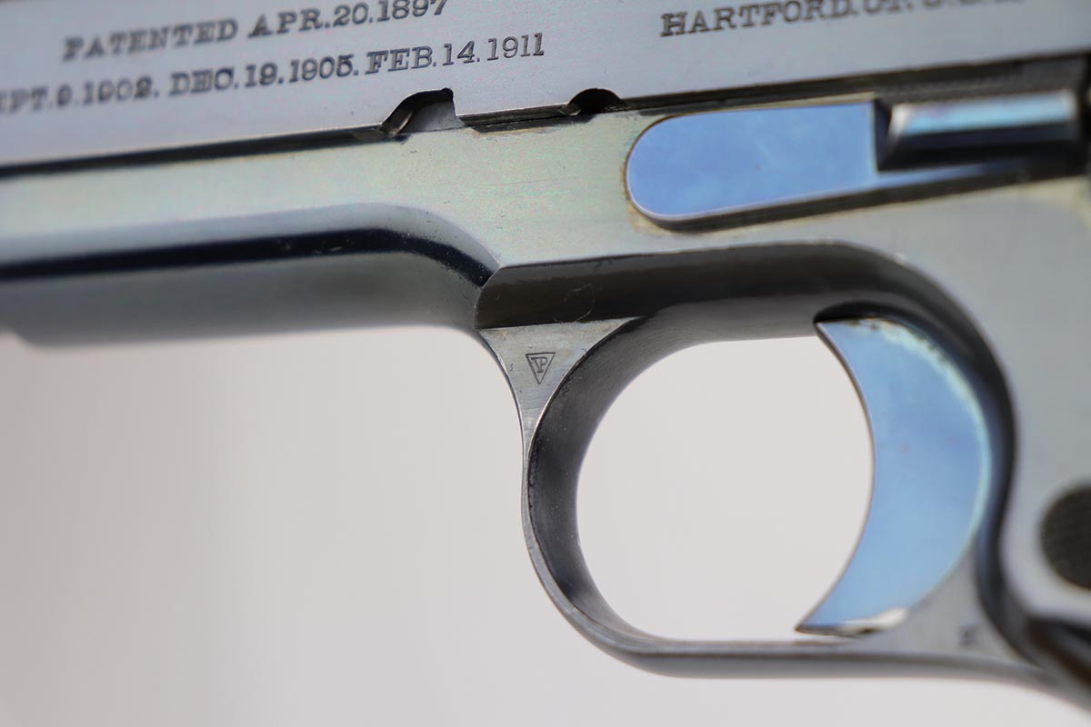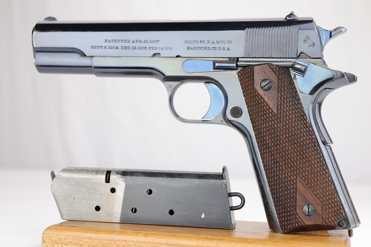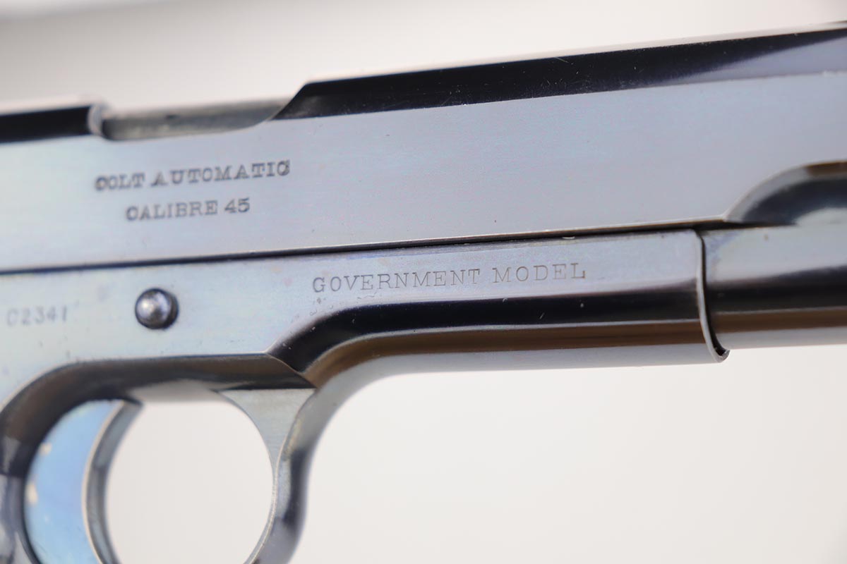 11/4/19 – This is an exceptional, high condition, Colt Government Model 1911 that was manufactured in late 1912 or very early 1913. The pistol has the highly desirable high polish, almost mirror blue commercial finish with standard checkered walnut grips and the highly desirable and very fragile, heat blued, trigger, hammer, slide lock, safety lock and rear sight that was applied to Colt Government Model pistols until mid-1913. This beautiful early Colt is accompanied by a Colt factory letter dated April 2011, indicating it as being sent to Von Lengerke & Antonine, Chicago Illinois in January 1913, in a 10 gun shipment. Some charts date the serial to 1912, others to 1913, but obviously it shipped in January. Could have been built in December of previous year though. It retains all the original early features such as the early oval tapered front sight with the round top 1913 style rear, the type III magazine catch lock installed about serial number C380, the correct short hammer with sharp rear edge and fine checkering, first style checkered slide stop with the checkered thin thumb piece safety lock, and the early inward punched lip on the recoil spring plug. It has the all blued finish on the barrel with the rough milled finish on the chamber area, with the high polished blue on the remaining front end of the barrel. There is a capital letter “C” stamped on the back side of the barrel lug and the rear of the hood of the barrel with a “5” on the underside in front of the lug. The top of the frame is stamped with “Q” and “S” inspection marks in front and behind the disconnector hole. The right side of the slide is roll stamped “COLT AUTOMATIC/CALIBER 45” in two lines below the ejection port. The left side of the slide is roll stamped with the correct two-line, Colt patent dates followed by the Colt Hartford two-line address block. The circled Rampant Colt is roll stamped on the left side of the slide behind the slide serrations. This beautiful pistol is complete with a standard two-tone magazine with the lanyard loop on the base. It is also accompanied by a short article on these early Colt’s and the painstaking, high polish mirror and heat blued finishes applied to these early pistols. The bluing is beautiful, especially in the profile view, but there is some thinning on the straps. Minty bore and fantastic grips. No trades or discounts on this item as I’d prefer to put it in the safe. Check required or additional CC fees would need to be added as they’d cost us $600 on this listing.