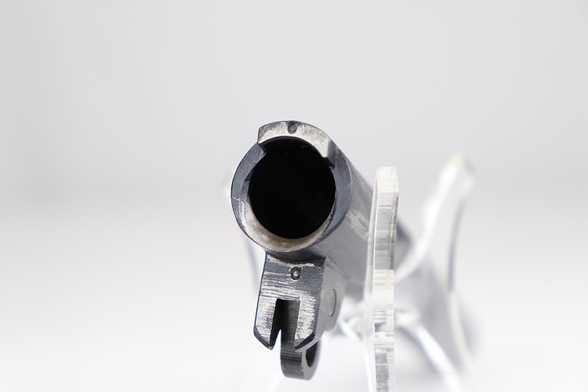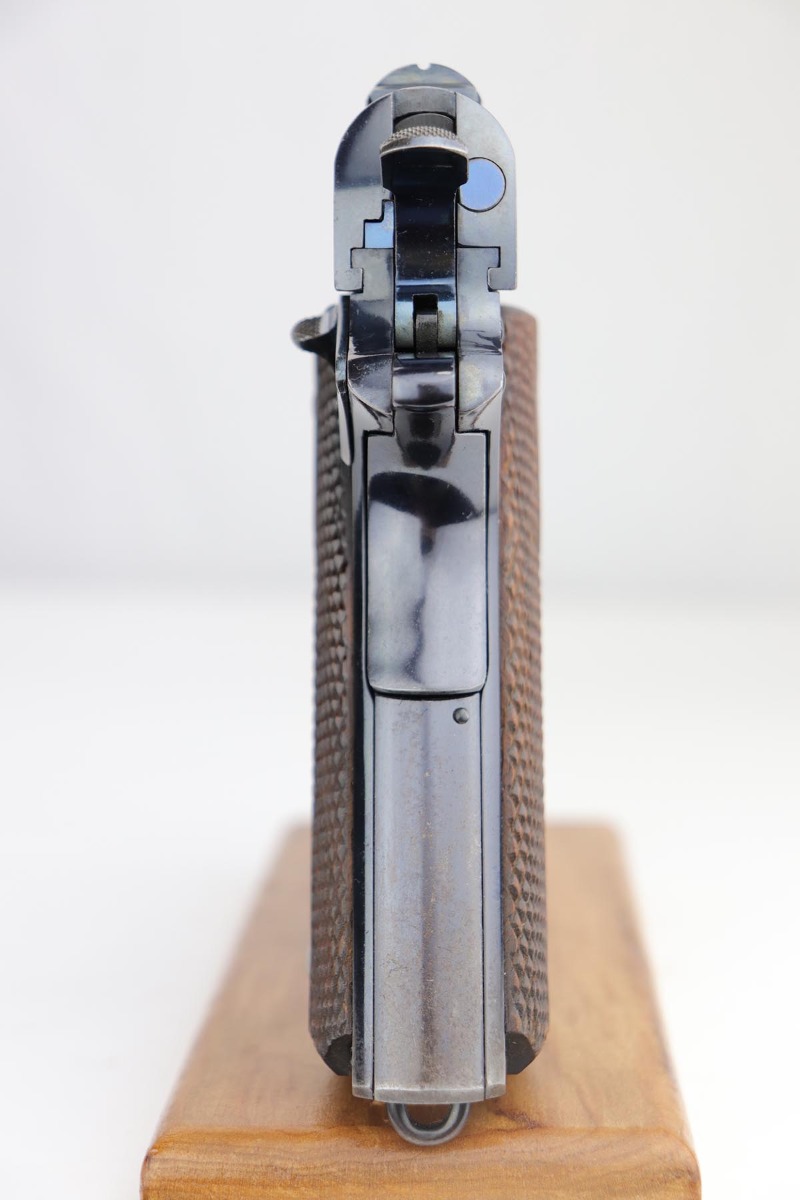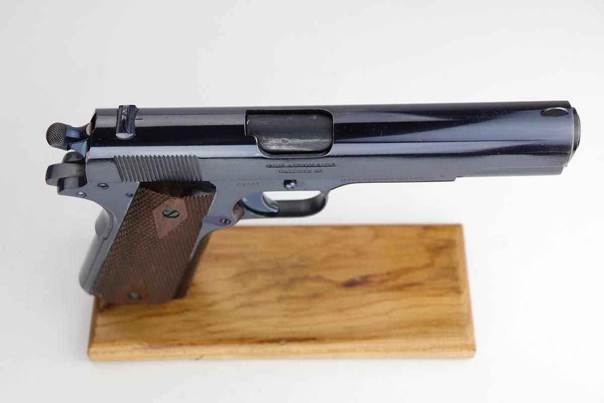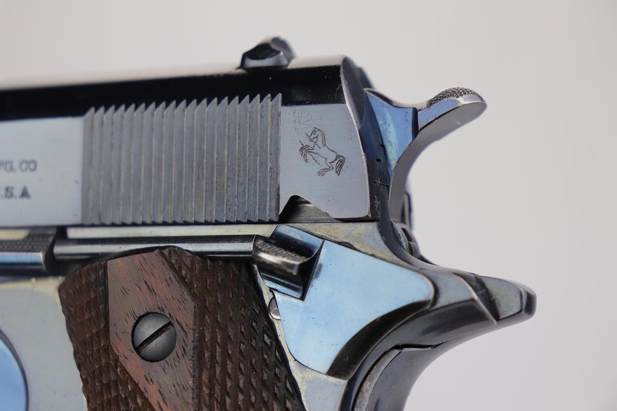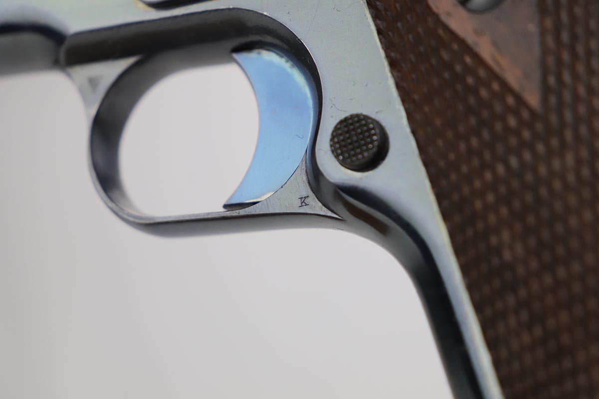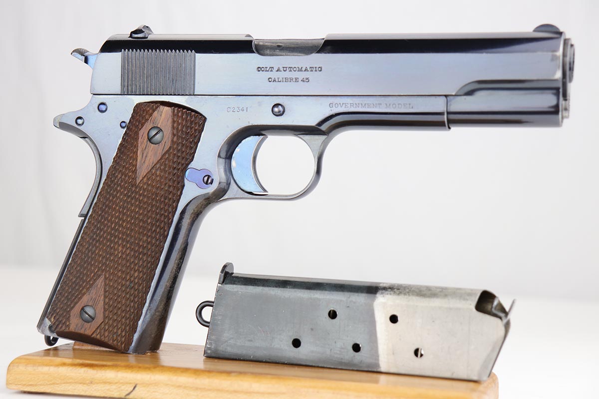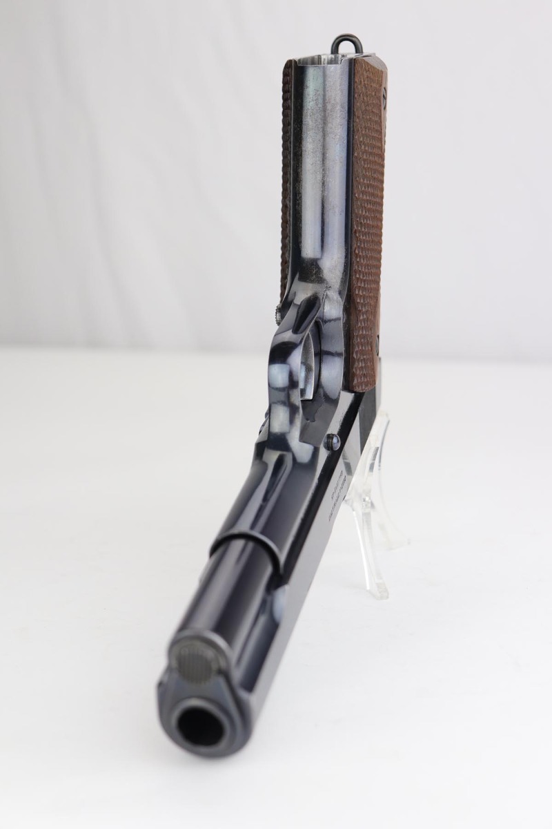 11/4/19 – This is an exceptional, high condition, Colt Government Model 1911 that was manufactured in late 1912 or very early 1913. The pistol has the highly desirable high polish, almost mirror blue commercial finish with standard checkered walnut grips and the highly desirable and very fragile, heat blued, trigger, hammer, slide lock, safety lock and rear sight that was applied to Colt Government Model pistols until mid-1913. This beautiful early Colt is accompanied by a Colt factory letter dated April 2011, indicating it as being sent to Von Lengerke & Antonine, Chicago Illinois in January 1913, in a 10 gun shipment. Some charts date the serial to 1912, others to 1913, but obviously it shipped in January. Could have been built in December of previous year though. It retains all the original early features such as the early oval tapered front sight with the round top 1913 style rear, the type III magazine catch lock installed about serial number C380, the correct short hammer with sharp rear edge and fine checkering, first style checkered slide stop with the checkered thin thumb piece safety lock, and the early inward punched lip on the recoil spring plug. It has the all blued finish on the barrel with the rough milled finish on the chamber area, with the high polished blue on the remaining front end of the barrel. There is a capital letter “C” stamped on the back side of the barrel lug and the rear of the hood of the barrel with a “5” on the underside in front of the lug. The top of the frame is stamped with “Q” and “S” inspection marks in front and behind the disconnector hole. The right side of the slide is roll stamped “COLT AUTOMATIC/CALIBER 45” in two lines below the ejection port. The left side of the slide is roll stamped with the correct two-line, Colt patent dates followed by the Colt Hartford two-line address block. The circled Rampant Colt is roll stamped on the left side of the slide behind the slide serrations. This beautiful pistol is complete with a standard two-tone magazine with the lanyard loop on the base. It is also accompanied by a short article on these early Colt’s and the painstaking, high polish mirror and heat blued finishes applied to these early pistols. The bluing is beautiful, especially in the profile view, but there is some thinning on the straps. Minty bore and fantastic grips. No trades or discounts on this item as I’d prefer to put it in the safe. Check required or additional CC fees would need to be added as they’d cost us $600 on this listing.