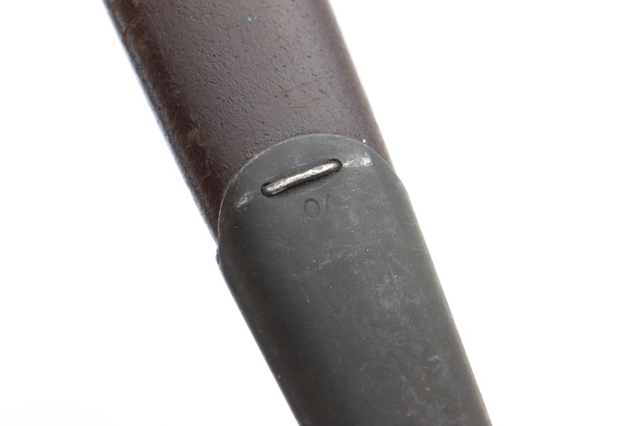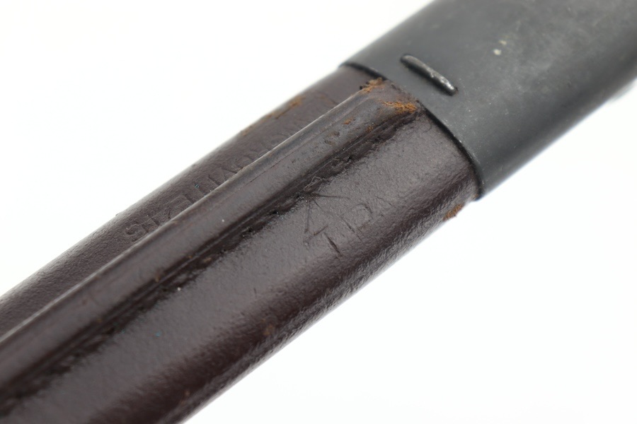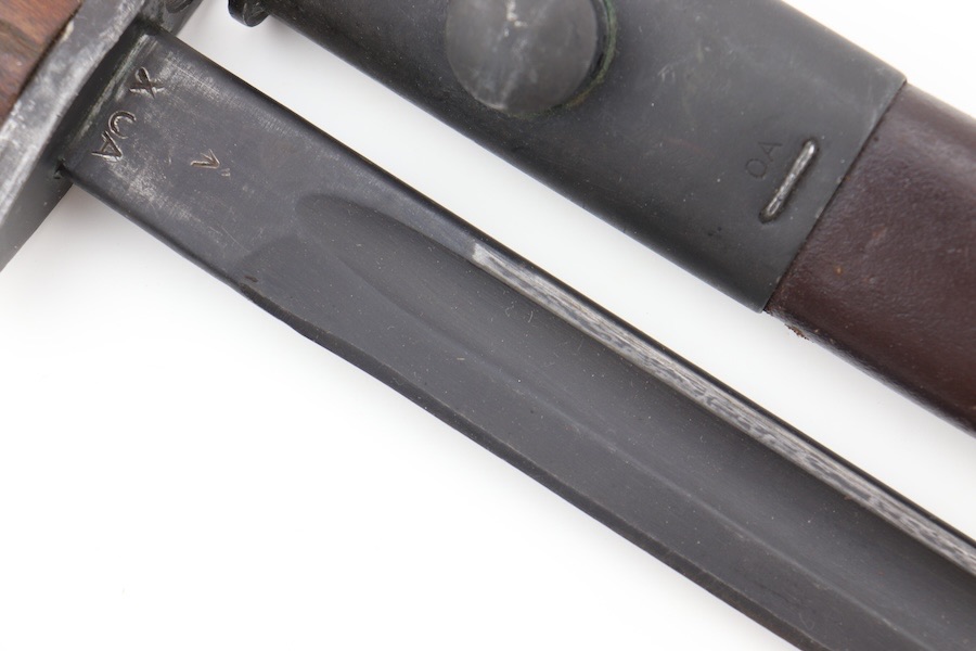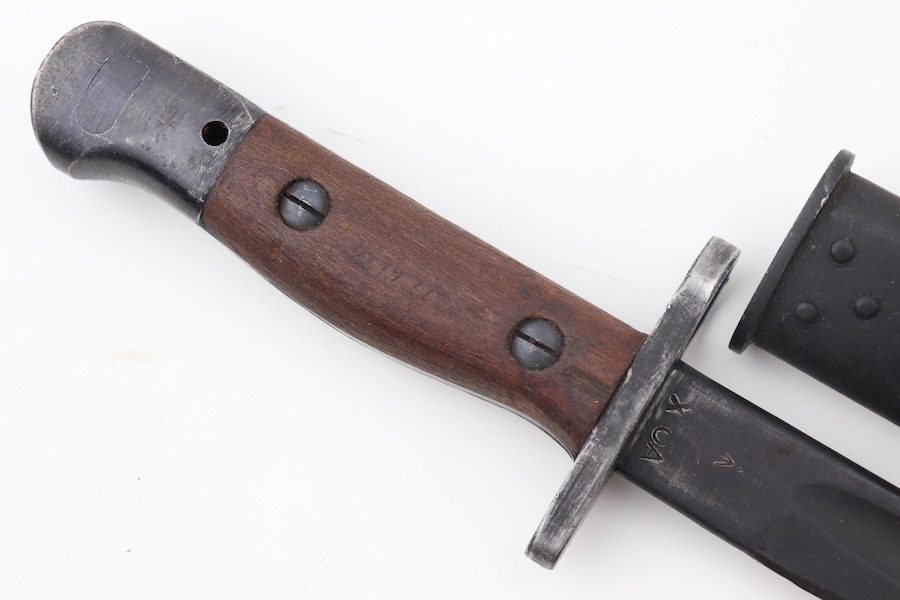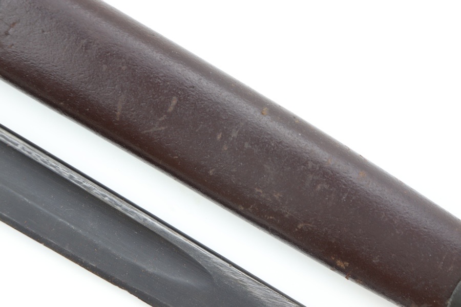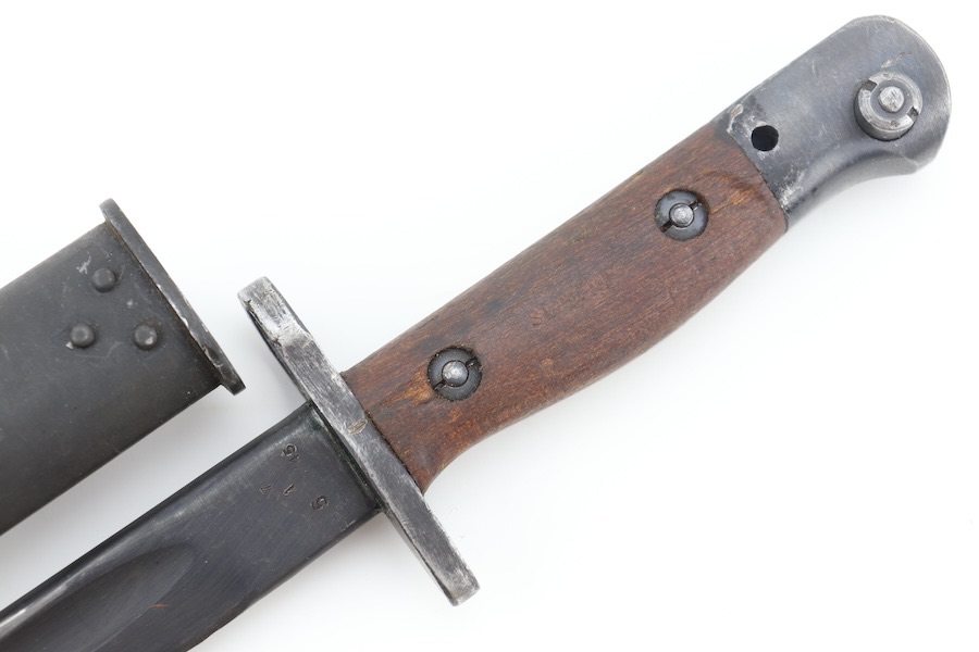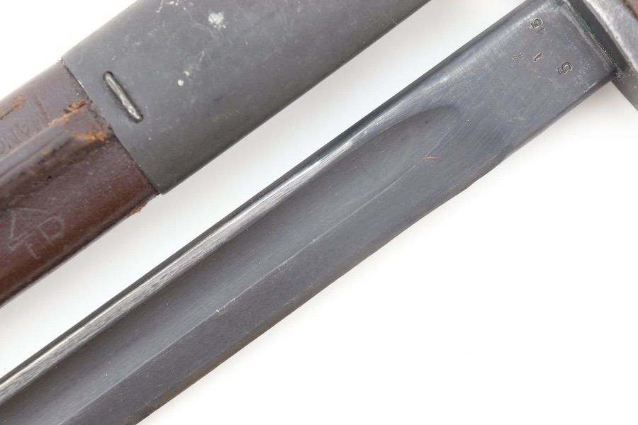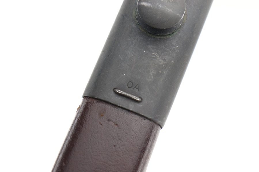 3/13/24 – This is an original Australian Owen Mk1 bayonet with the scabbard. The scabbard has a few light surface scuffs in the leather, but the original press stamps are crisp and legible, they read “Mangrovite’45”. The blade retains most of its original bluing finish but does show some light scabbard wear just below the spine on both sides. The edge has not been sharpened. The ricasso is stamped “1907 5 45” “XOA.” The wood grips have. There are a few light handling marks, but they are otherwise excellent and correctly marked Slaz44. Overall an excellent condition example of a fairly rare bayonet.