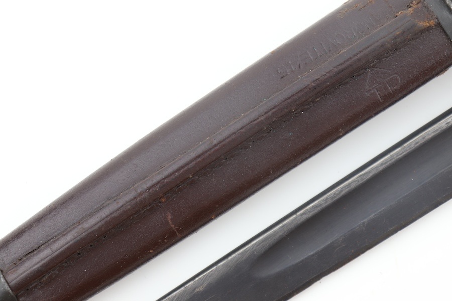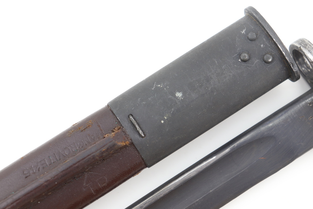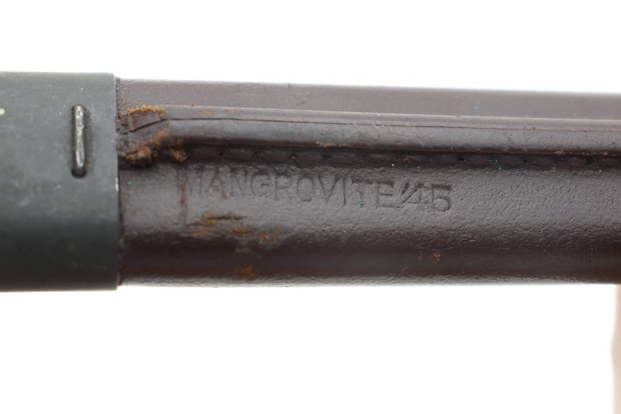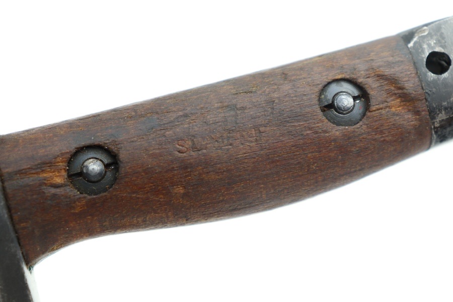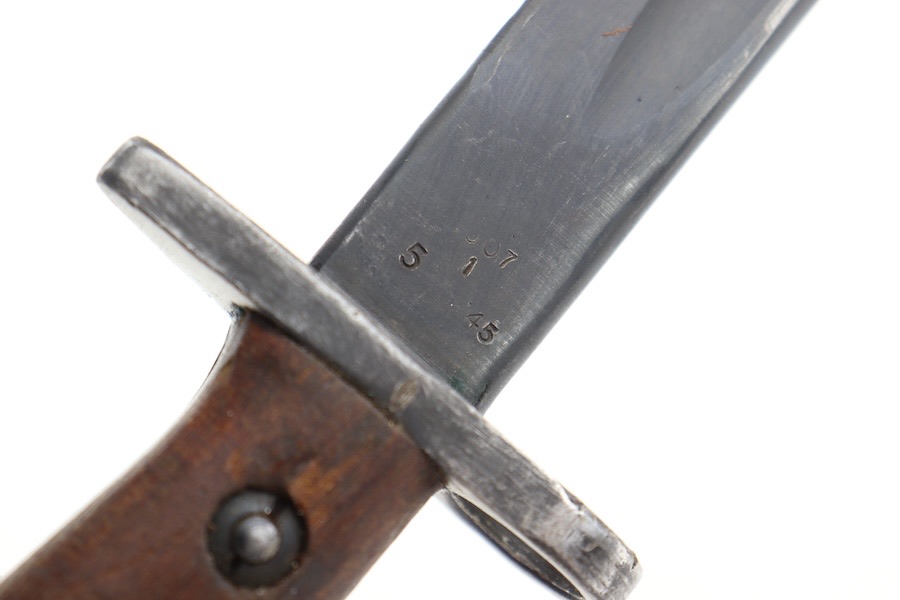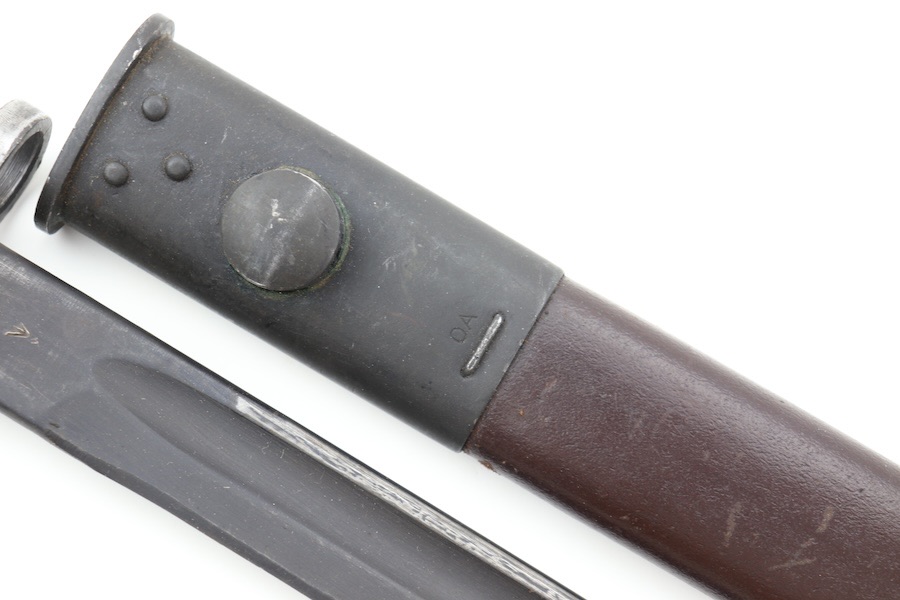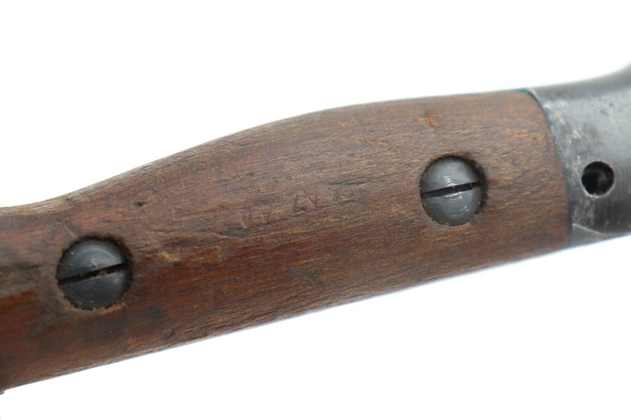3/13/24 – This is an original Australian Owen Mk1 bayonet with the scabbard. The scabbard has a few light surface scuffs in the leather, but the original press stamps are crisp and legible, they read “Mangrovite’45”. The blade retains most of its original bluing finish but does show some light scabbard wear just below the spine on both sides. The edge has not been sharpened. The ricasso is stamped “1907 5 45” “XOA.” The wood grips have. There are a few light handling marks, but they are otherwise excellent and correctly marked Slaz44. Overall an excellent condition example of a fairly rare bayonet.