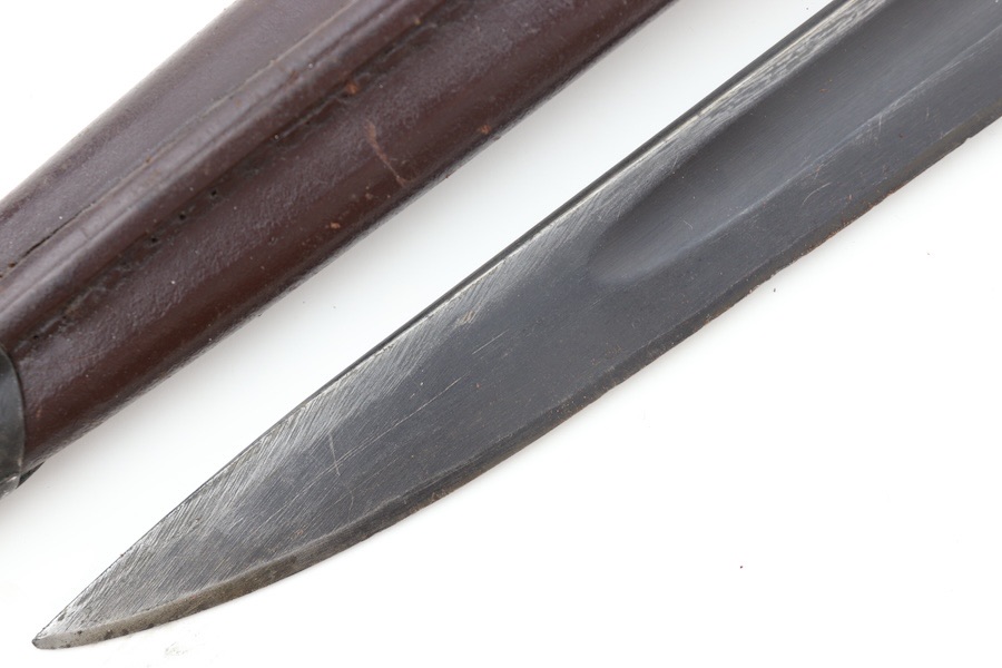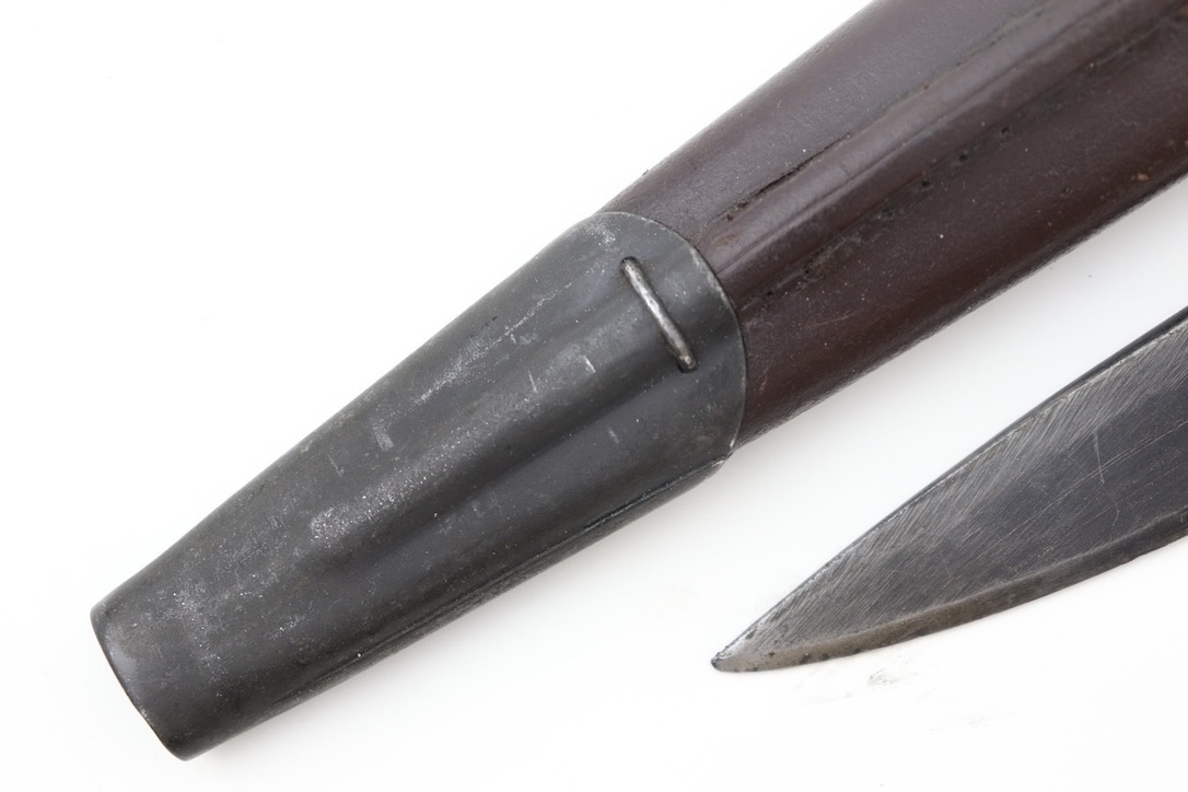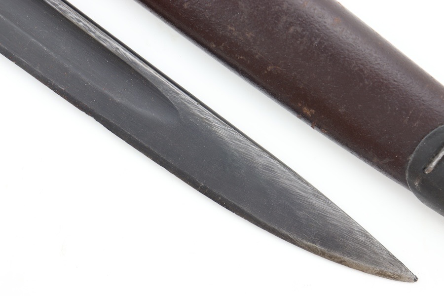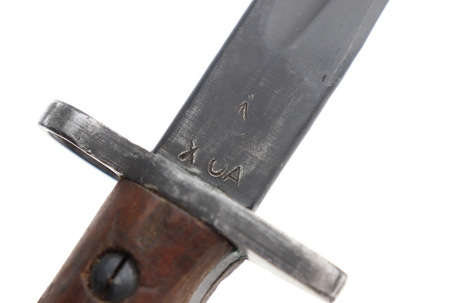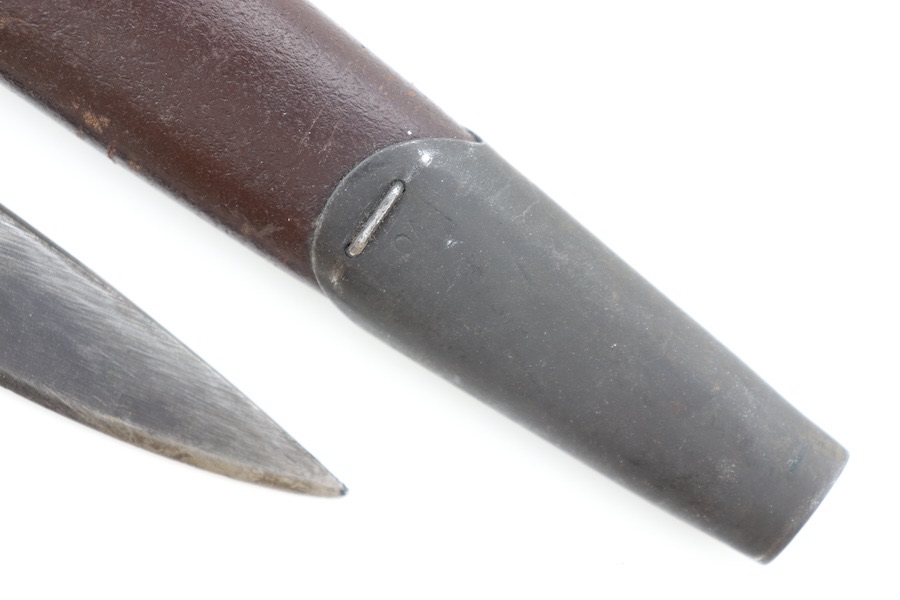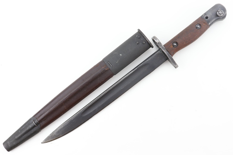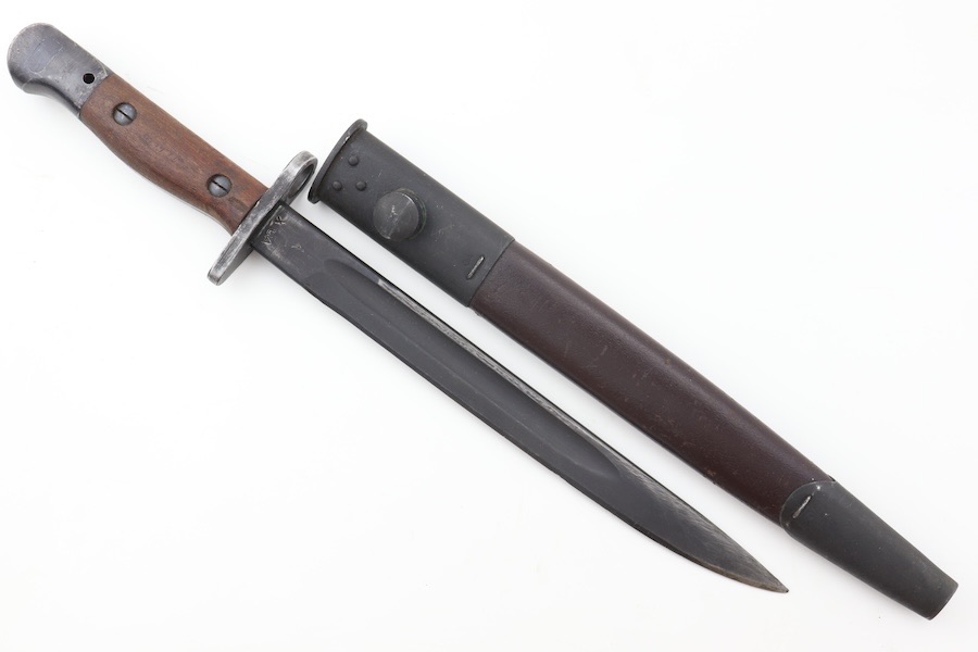 3/13/24 – This is an original Australian Owen Mk1 bayonet with the scabbard. The scabbard has a few light surface scuffs in the leather, but the original press stamps are crisp and legible, they read “Mangrovite’45”. The blade retains most of its original bluing finish but does show some light scabbard wear just below the spine on both sides. The edge has not been sharpened. The ricasso is stamped “1907 5 45” “XOA.” The wood grips have. There are a few light handling marks, but they are otherwise excellent and correctly marked Slaz44. Overall an excellent condition example of a fairly rare bayonet.