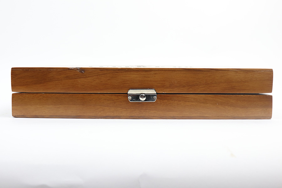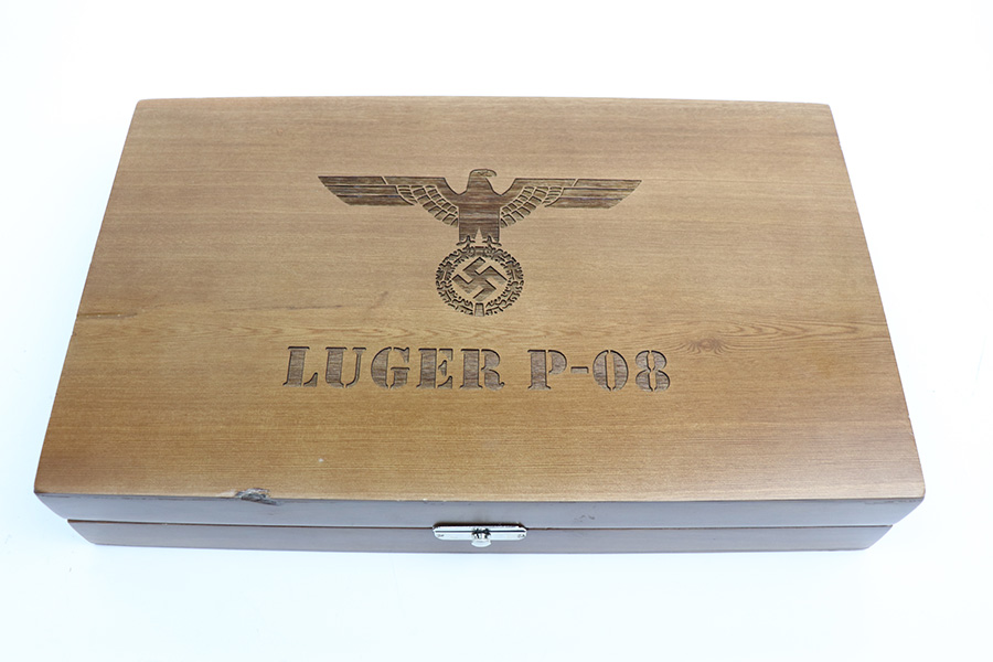 8/17/21 – This display case is a handmade wooden box with an identifying etched top and cushioned slotted interior perfect for storing and displaying a P.08 pistol. There is space inside for the pistol and an extra magazine or a space to store the magazine separate from the pistol.