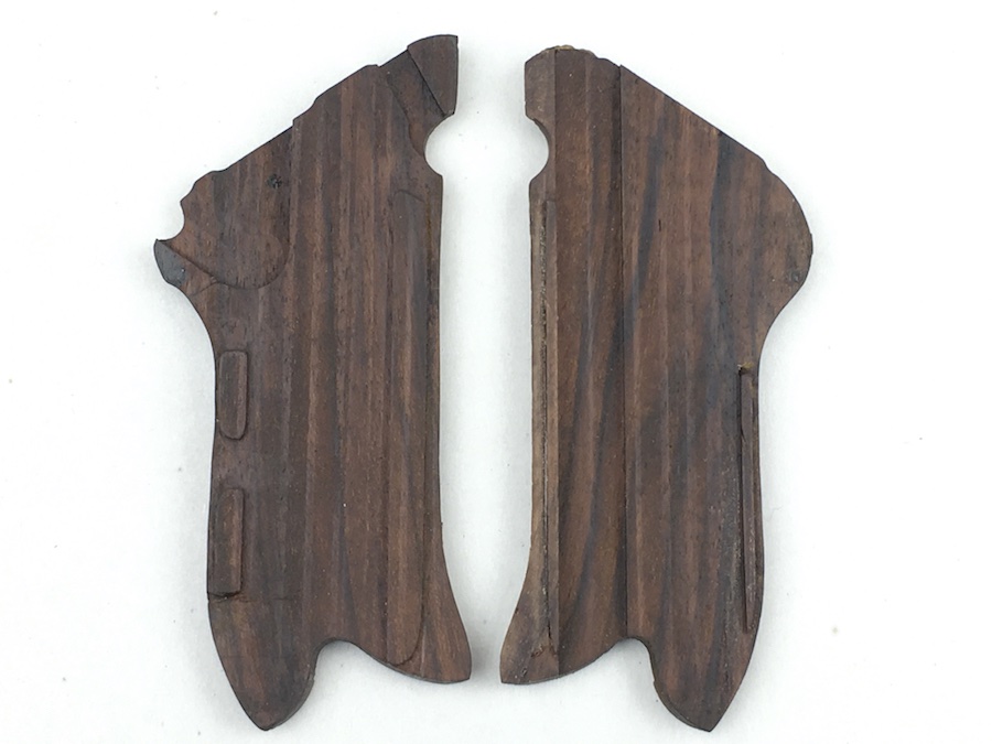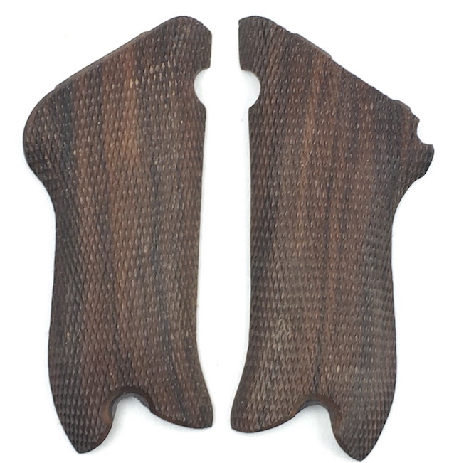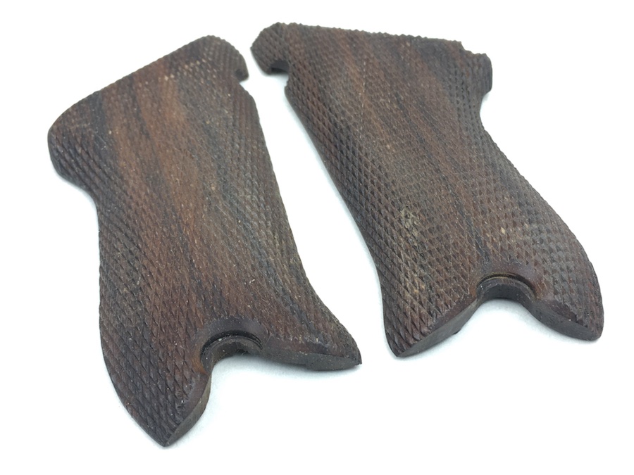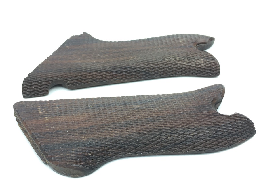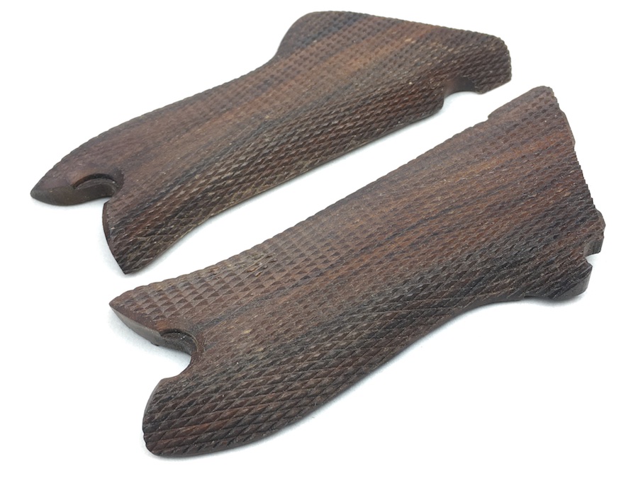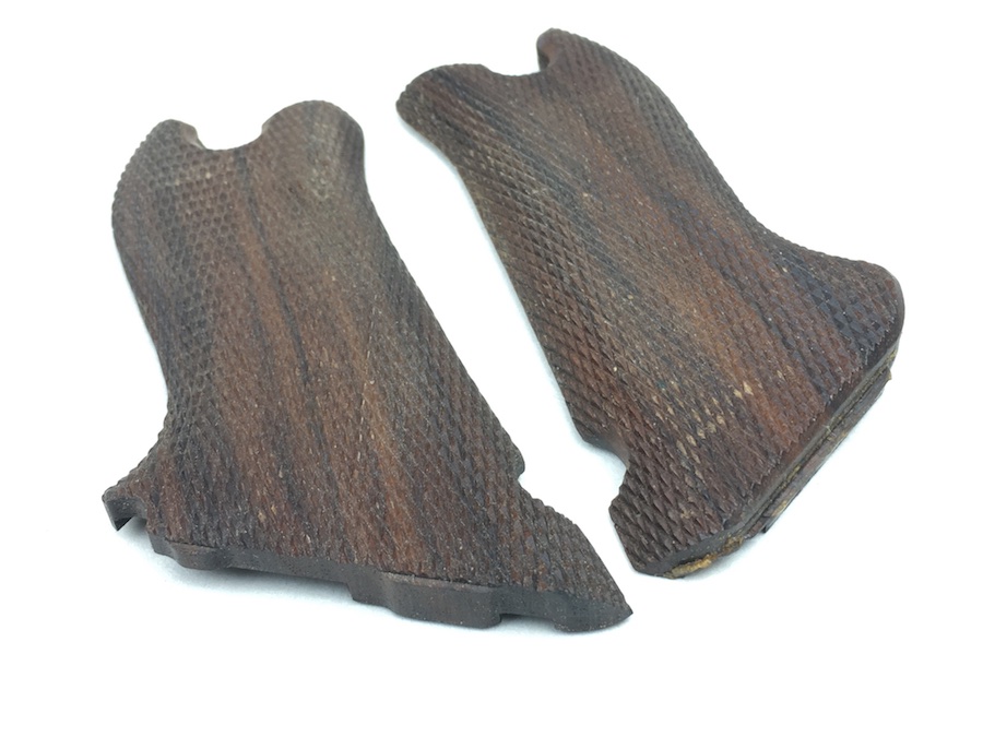 10/22/19 – This is an original pair of WW2 era Luger grips. They are unmarked. The exterior of the grips have a strong diamond pattern with a beautiful wood grain pattern. This is a correct and proper WW2 era style. There are no cracks or chips. Very nice set. Guaranteed original.