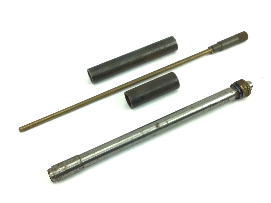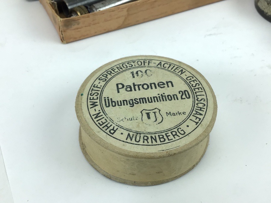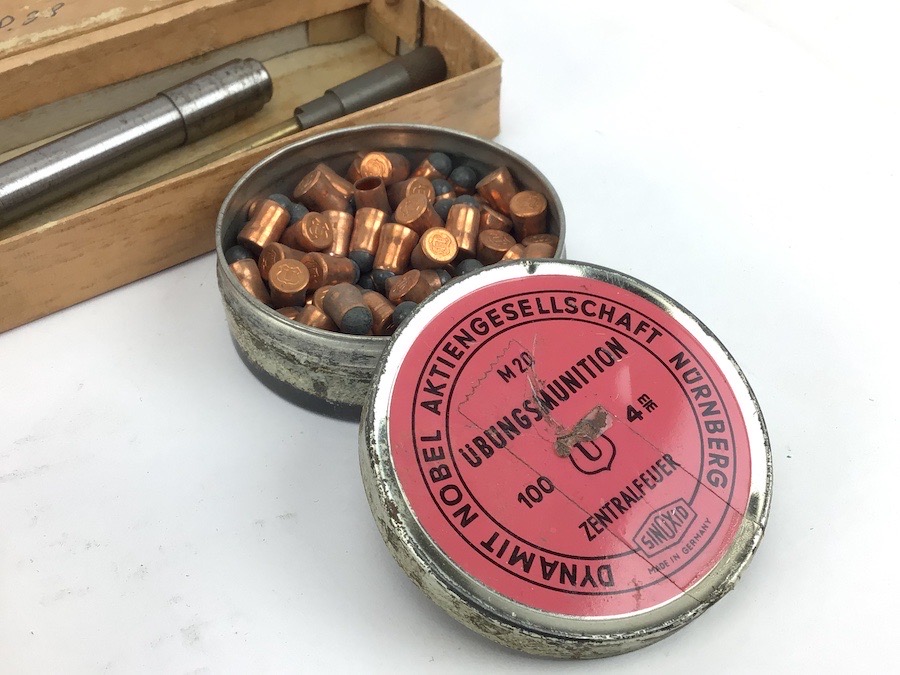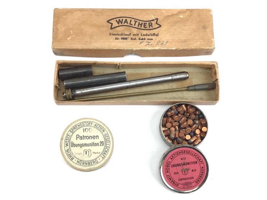 1/16/23 – Original and great condition. P.38 9mm to 4mm conversion barrel / kit with approximately 150 rounds of 4mm ammunition. The box was originally for a PPK kit, but this kit is for a P.38. Barrel bore has good rifling and rates about a 7 of 10. Includes only the parts shown.