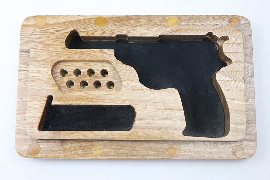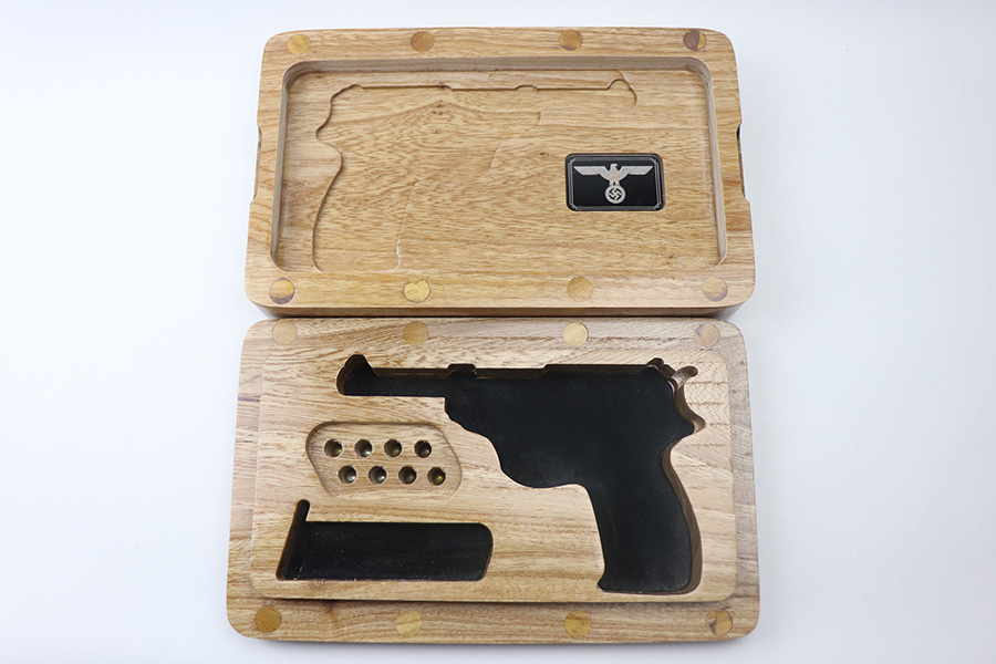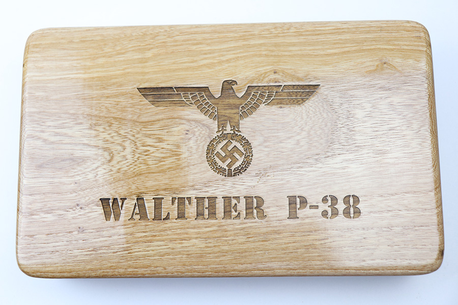 5/21/21 – This display case is a handmade wooden box with an identifying etched top and cushioned slotted interior perfect for storing and displaying a P.38 pistol. There is space inside for the pistol, 8 rounds, and an extra magazine or a space to store the magazine separate from the pistol.