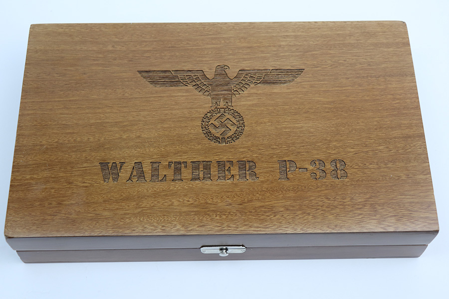 8/17/21 – This display case is a handmade wooden box with an identifying etched top and cushioned slotted interior perfect for storing and displaying a P.38 pistol. There is space inside for the pistol and an extra magazine or a space to store the magazine separate from the pistol.