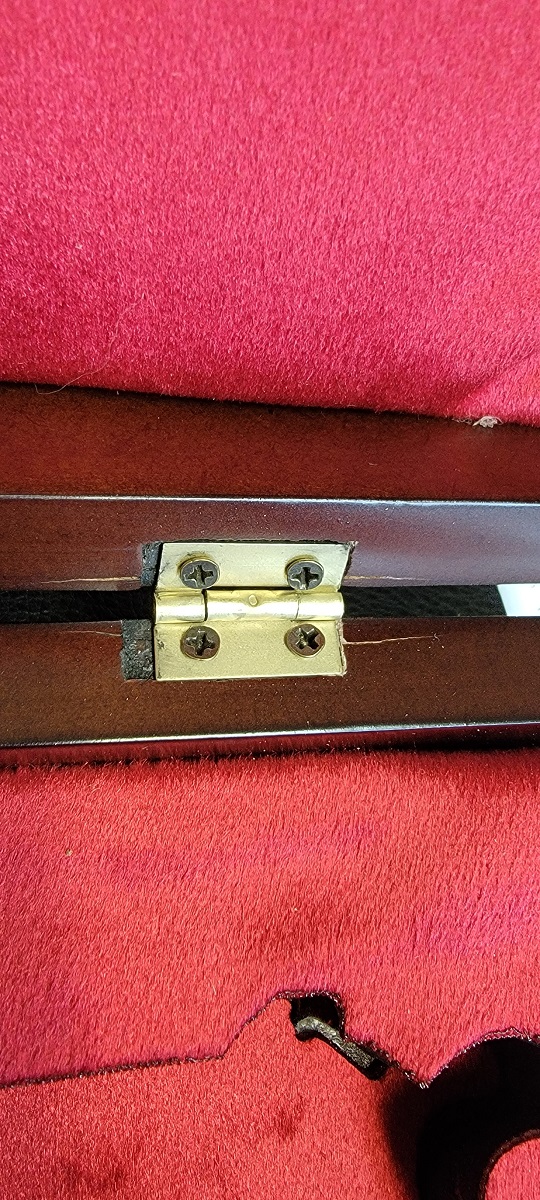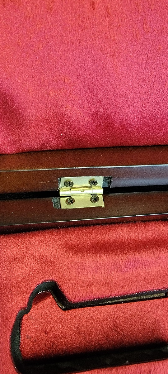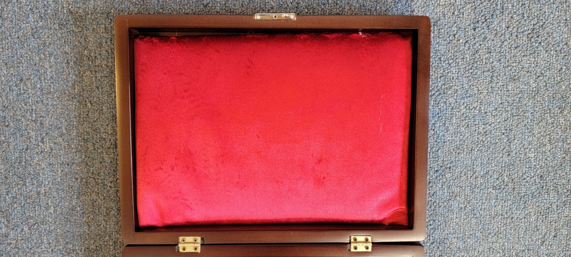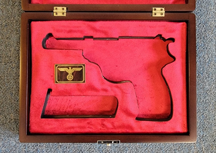 4/6/23 – This display case is a handmade wooden box with an identifying etched top and cushioned slotted interior perfect for storing and displaying a P.38 pistol. There is space inside for the pistol and an extra magazine or a space to store the magazine separate from the pistol. Note there are a few hairline cracks around the hinges on the interior wood.