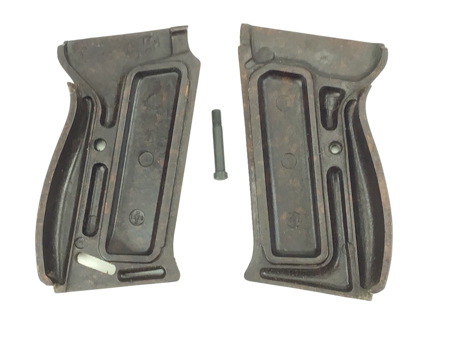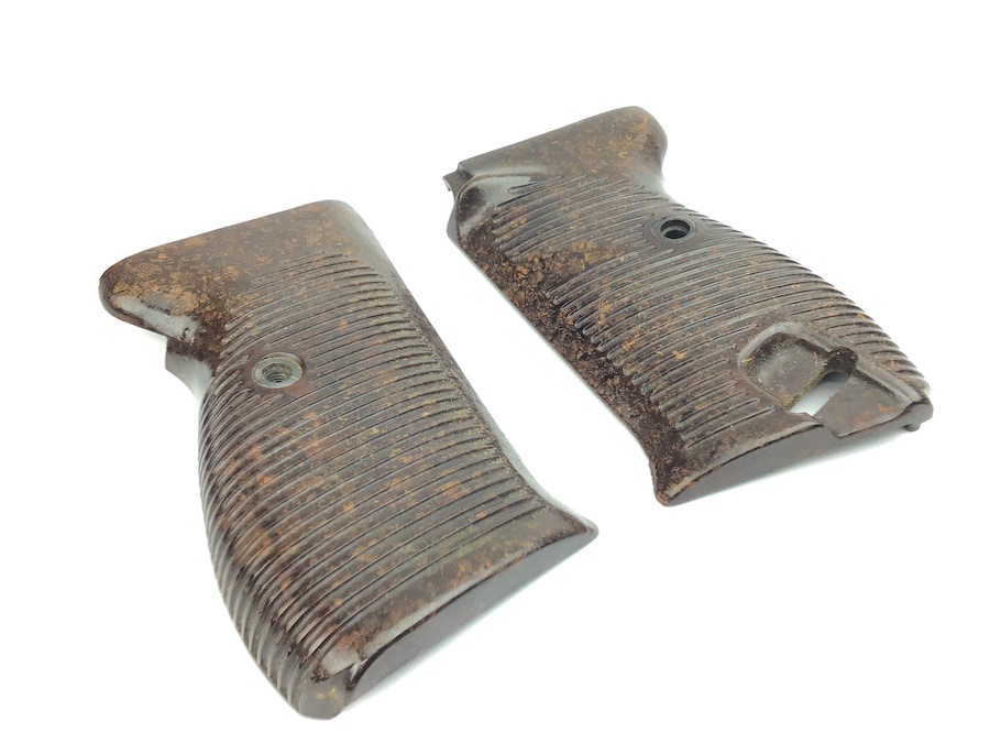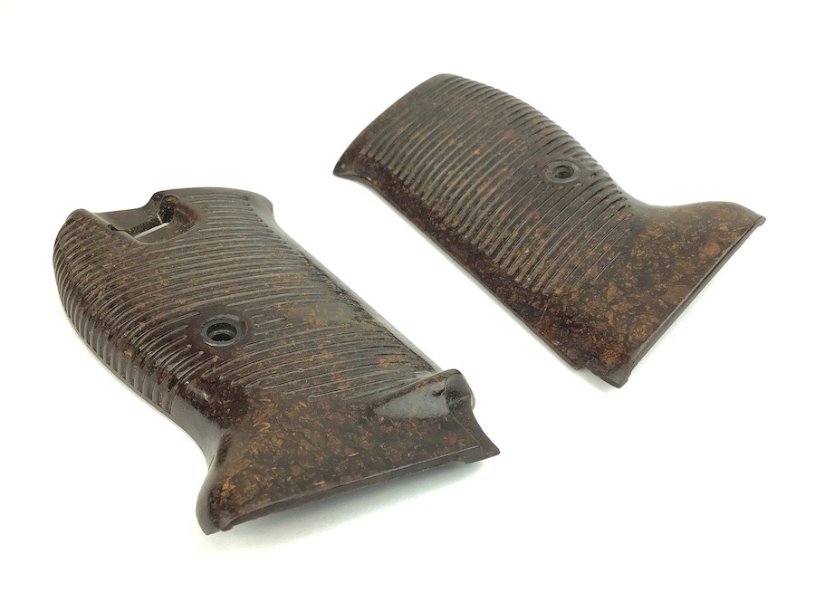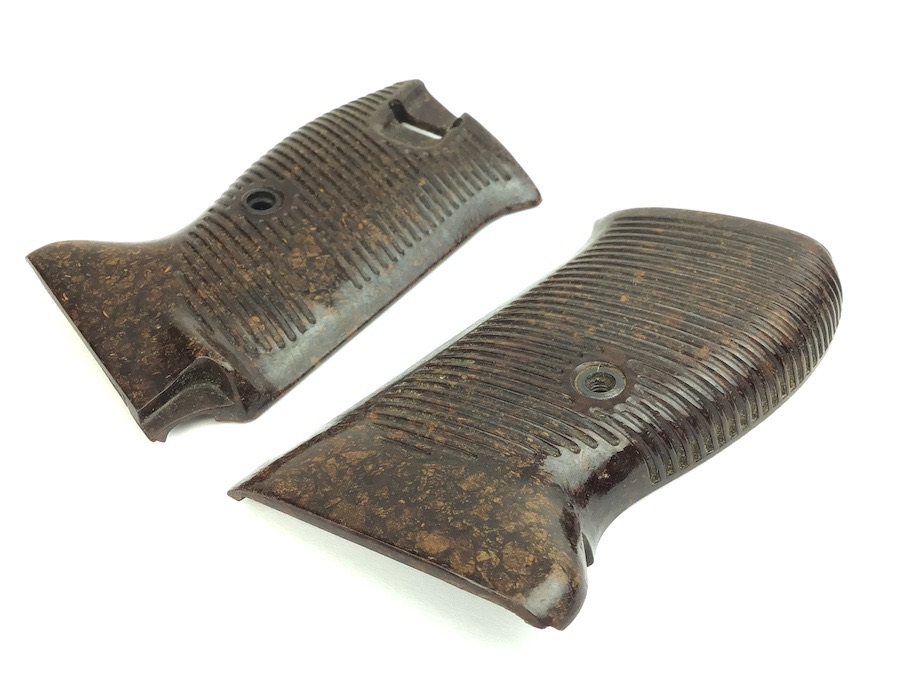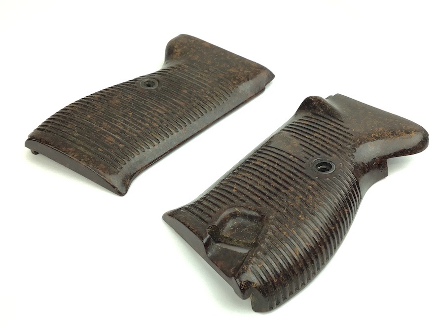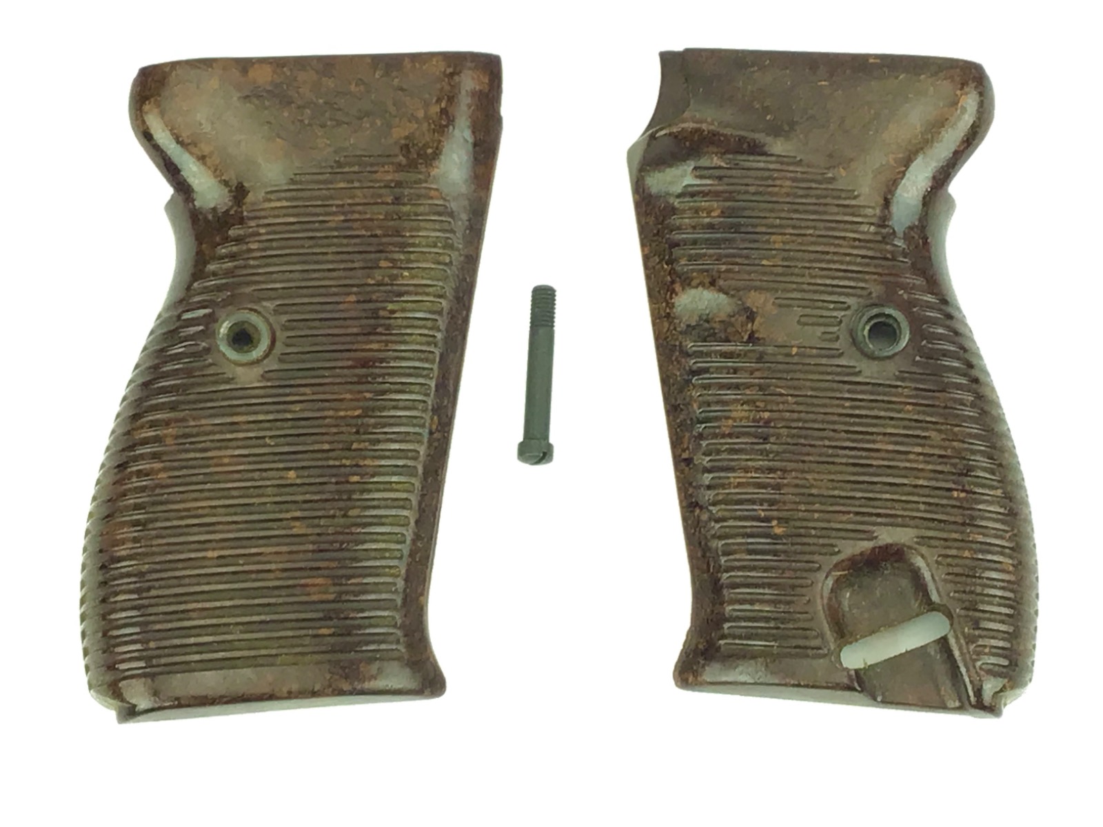 6/8/22 – Original and great condition. WWII era P.38 grips and screw. Excellent bakelite with no cracks or chips. Coloring is very unique with reddish / brown swirls. Great pair of grips.