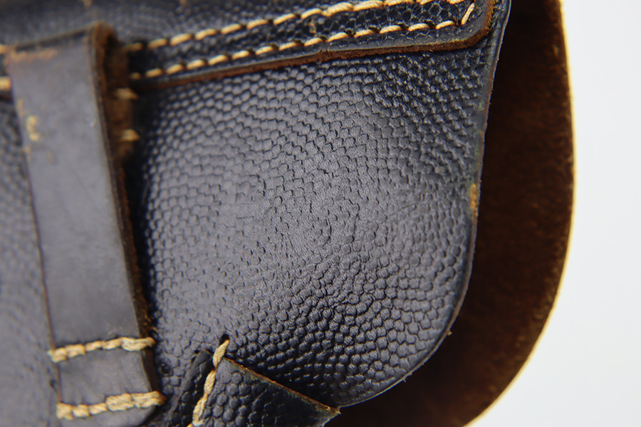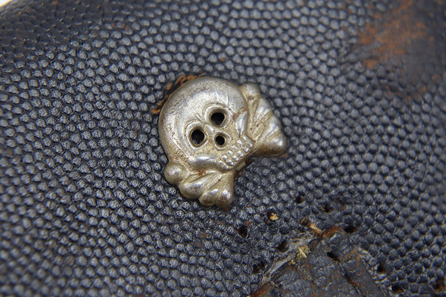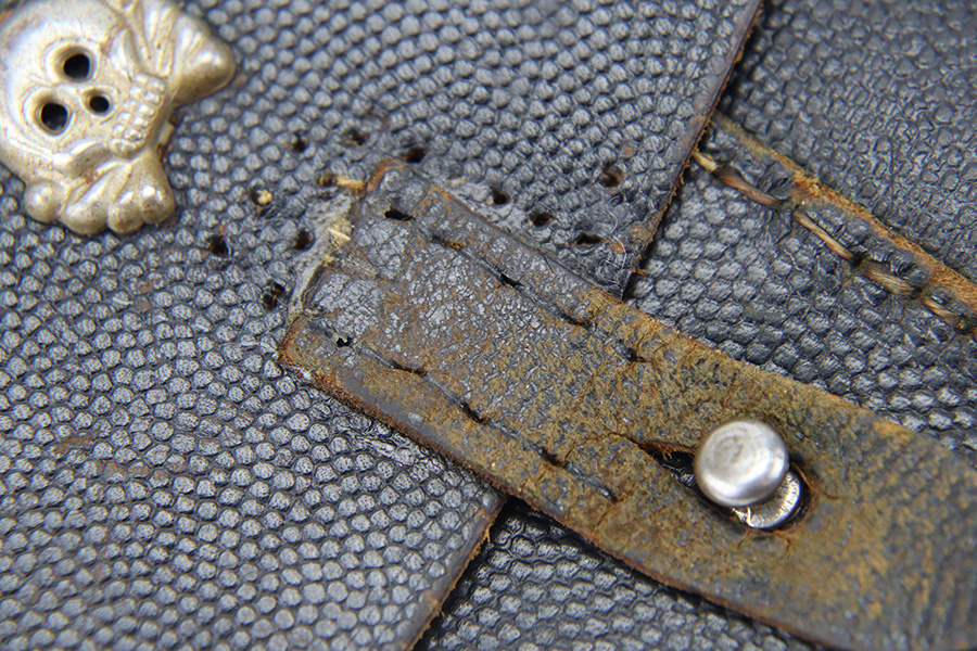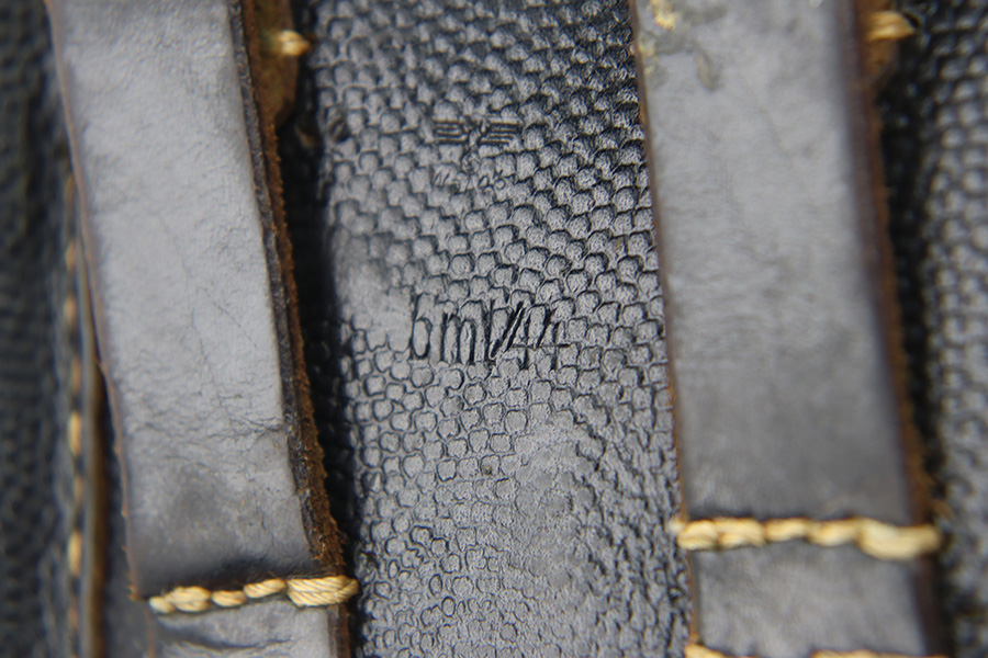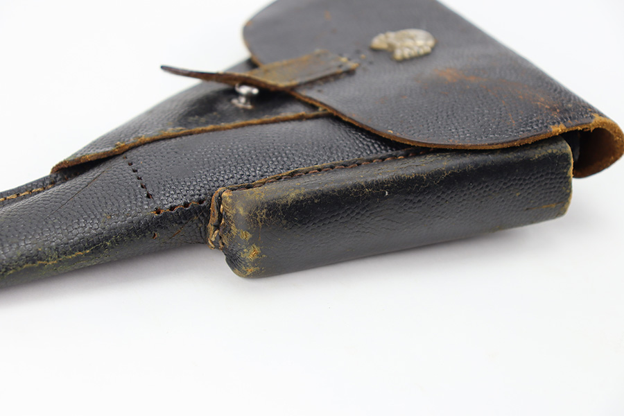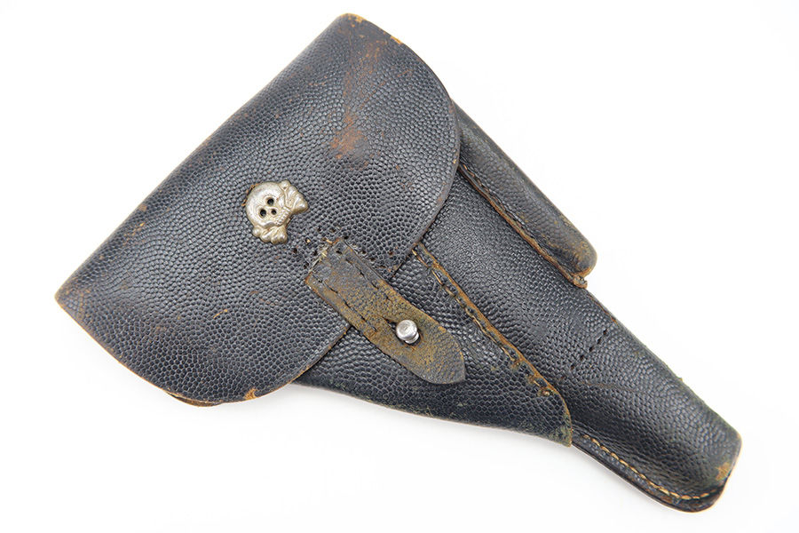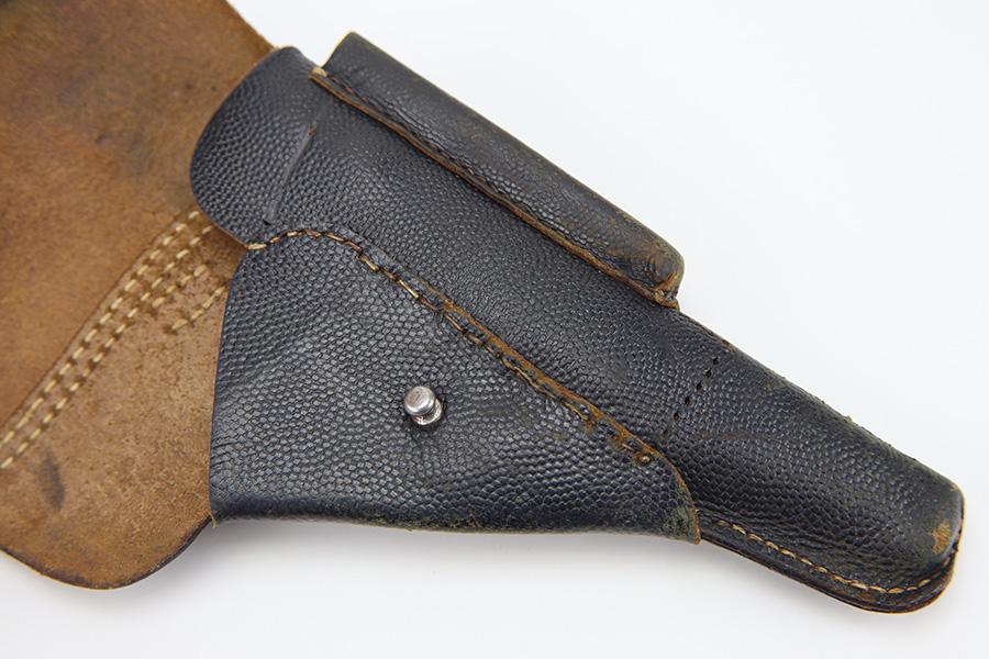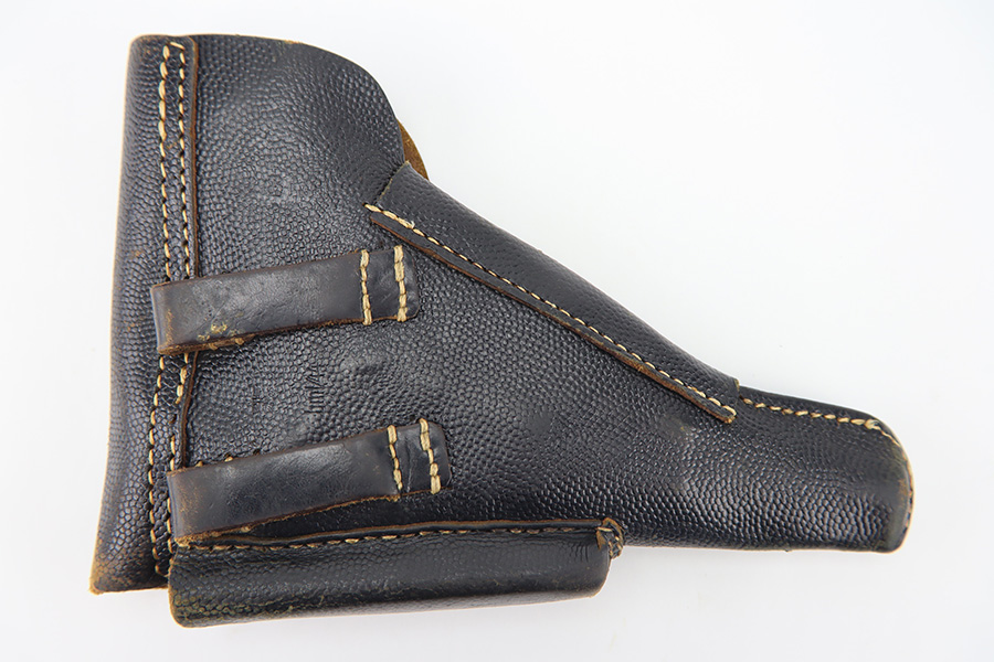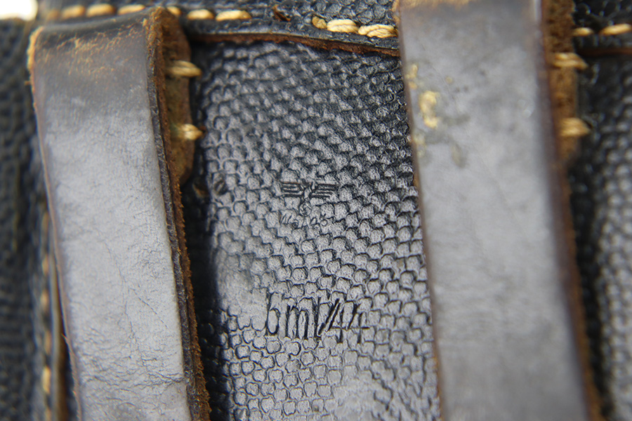 11/16/23 – This is a fairly unusual late WW2 modified P.38 holster for use with a FN M1922 pistol. This is evidenced by the magazine pouch, which has been removed from the front of the holster, and added to the side of the holster as shown. Due to these modifications, there’s extra added stitching and stitching holes on the front leather and side flap. The closure strap also looks to be re-stitched. The back leather is maker stamped, 1944 dated, and waffen military proof stamped. There’s also a Death’s Head skull embellishment added to the front leather. This appears to be original but we’re not sure.