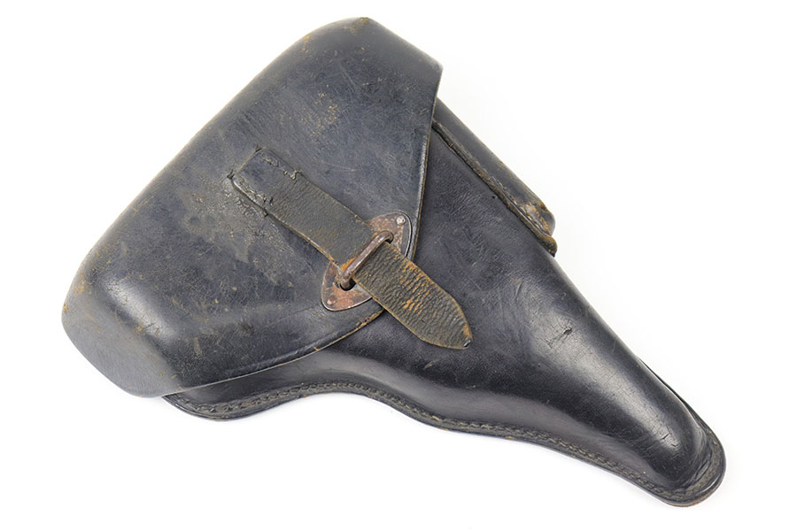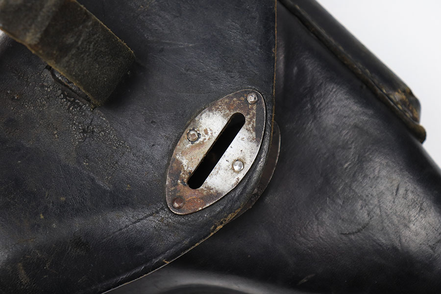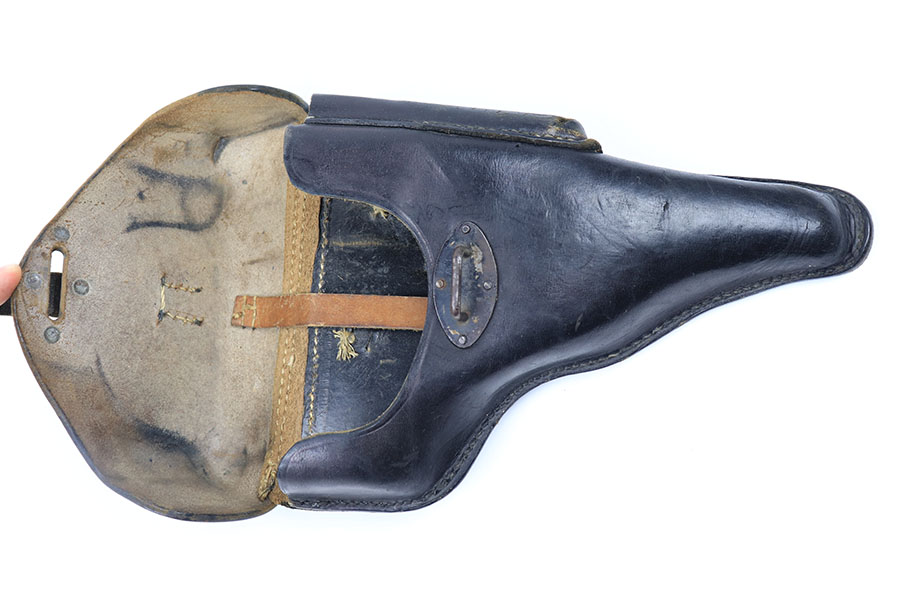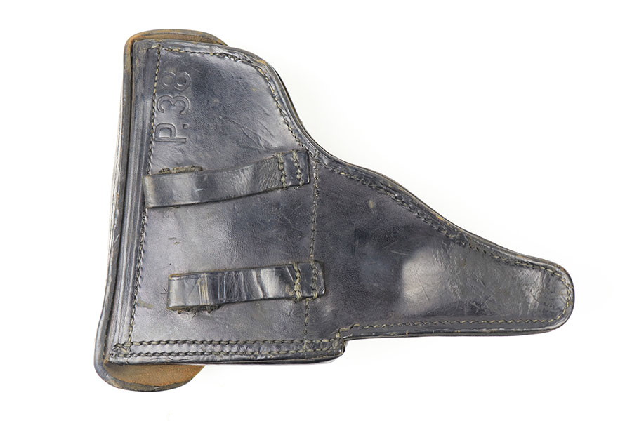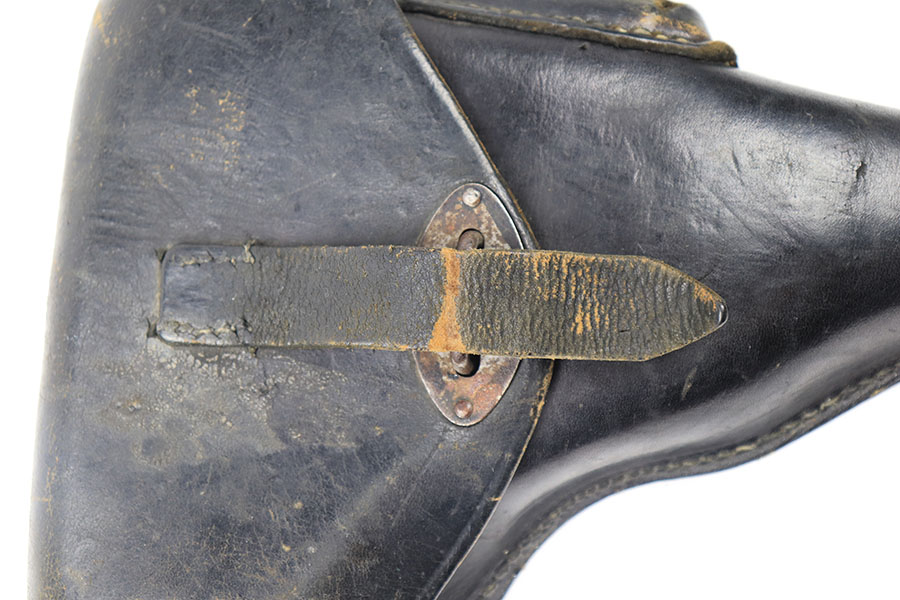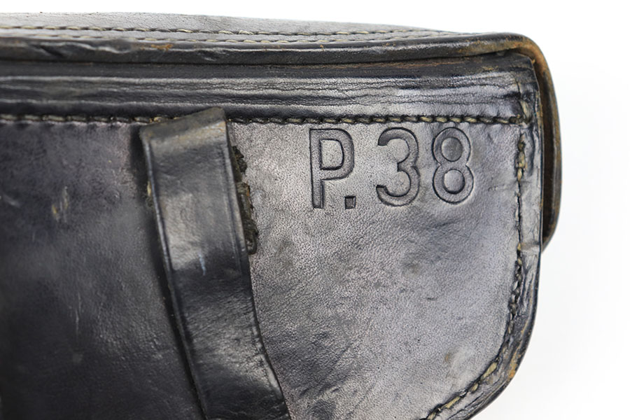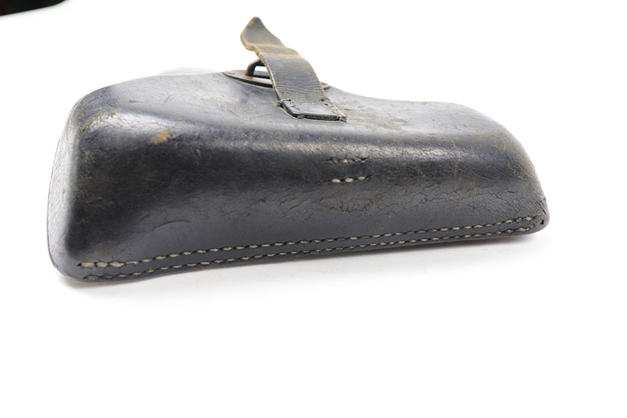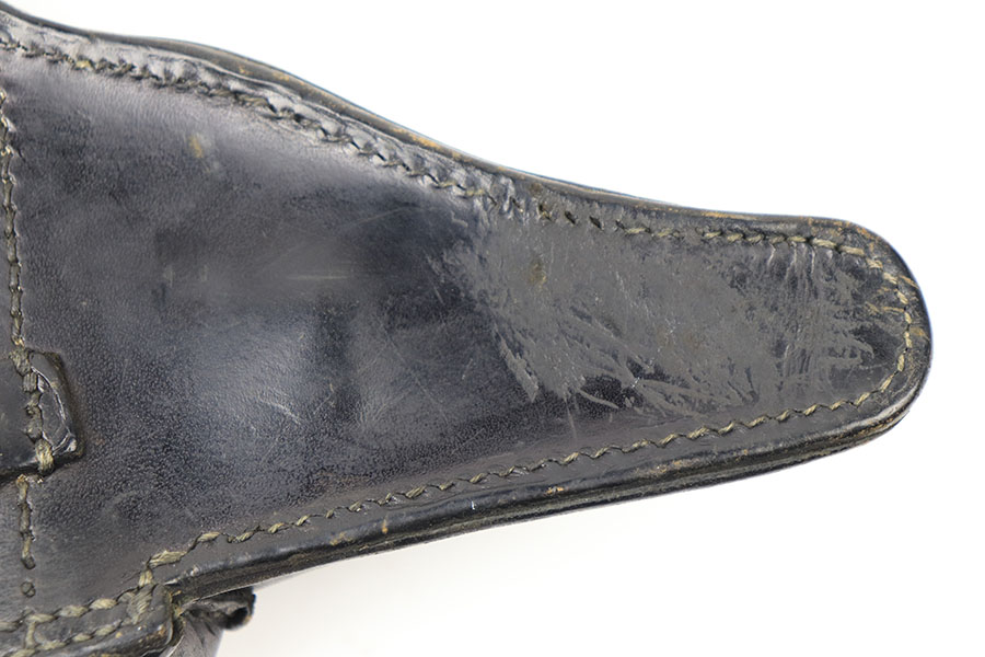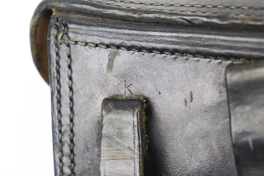 7/8/21 – This is an original WW2 era P.38 holster. The holster is stamped on the back leather with a faint maker marking that appears to be “nkk”. The stamp is uneven and faint, which was also likely how the waffen and date stamps were, as they probably faded out of the leather over time. The price is reduced accordingly. The closure strap has some mild surface wear and there is some scuffing on the back toe of leather, but overall the leather is in good condition and in tact, as is the stitching.