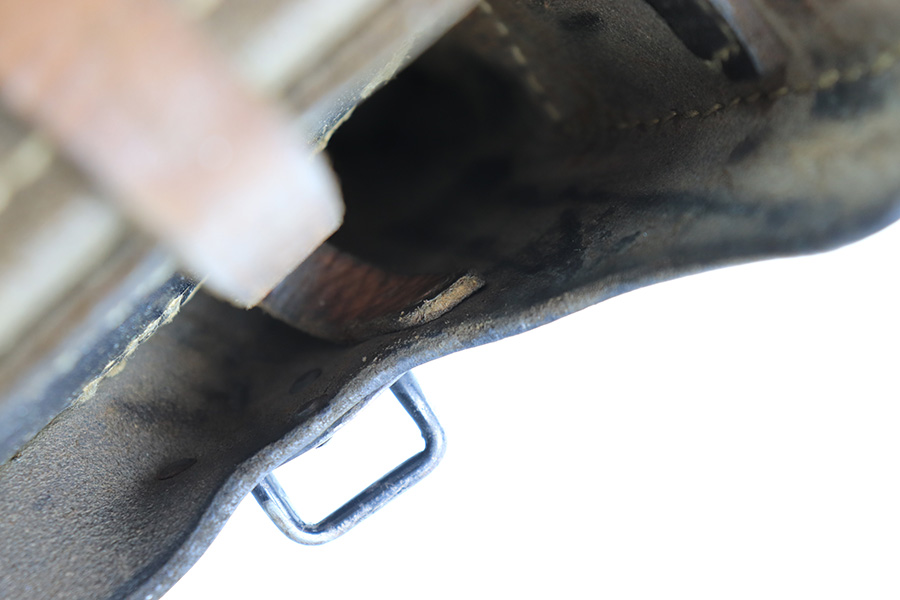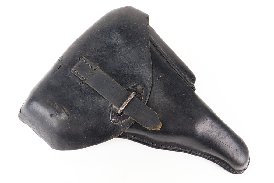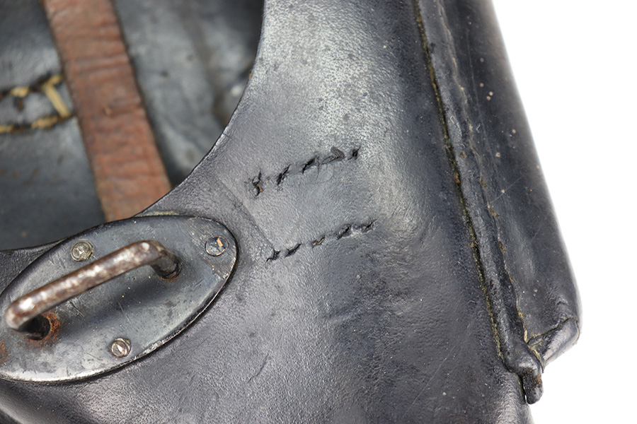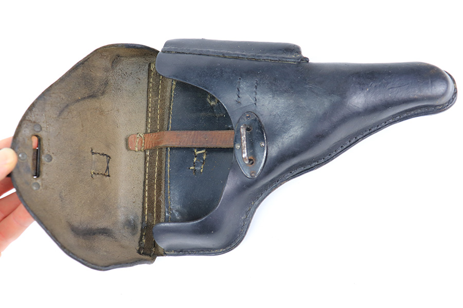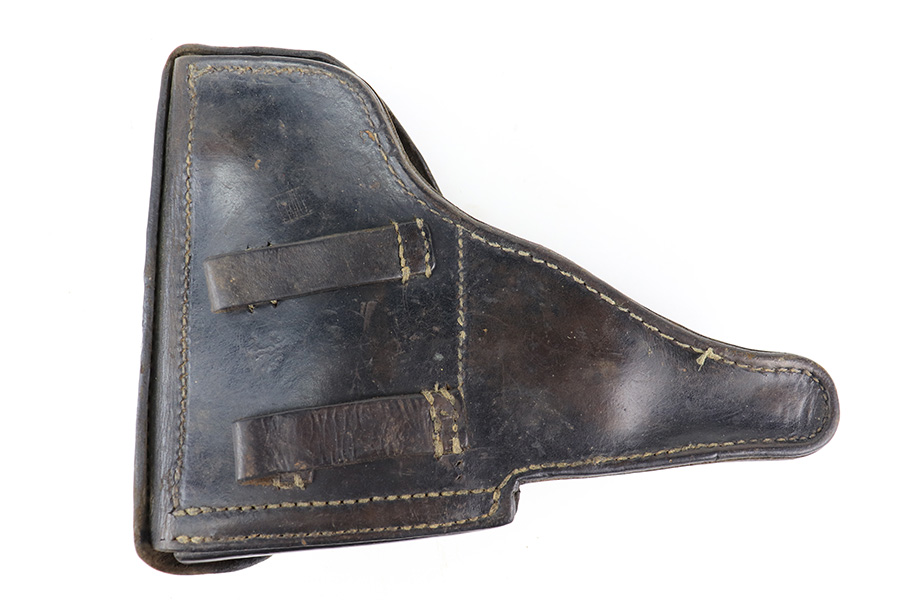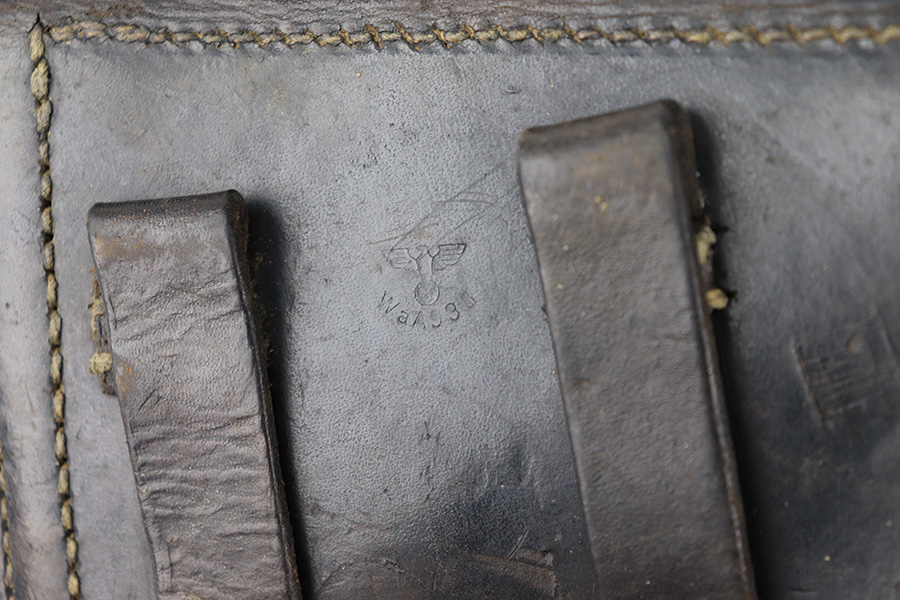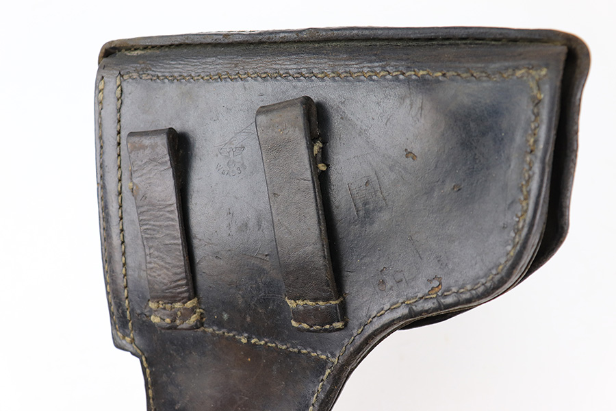 3/18/22 – This is an original WW2 production P.38 holster. The holster is somewhat scarce because there is no maker, date, or P.38 stamp on the back leather. The only visible stamp is a waffen proof. Research finds this is a style of holster made by Christof Neuner, most likely in 1942. The holster is in good overall condition with nice leather that has normal pliability and a fairly clean interior. The biggest take-away is the closure strap has been re-attached at the base, so there’s two lines of missing stitching next to the metal hardware, as shown. The rest of the stitching is intact and original. Priced accordingly.