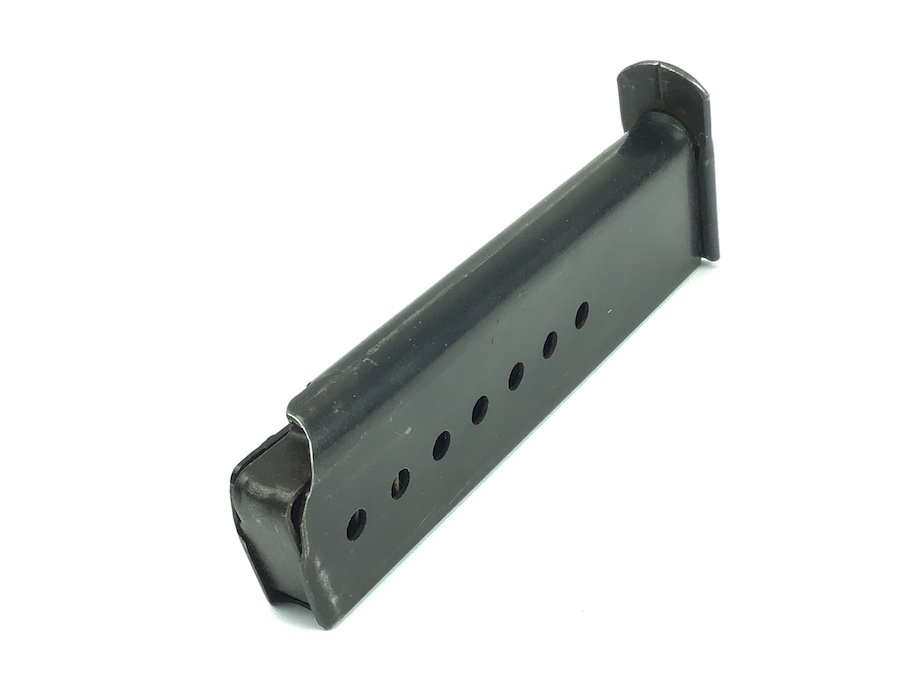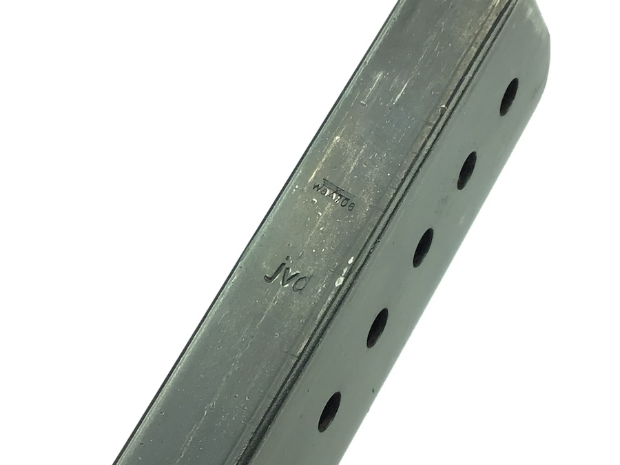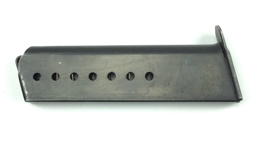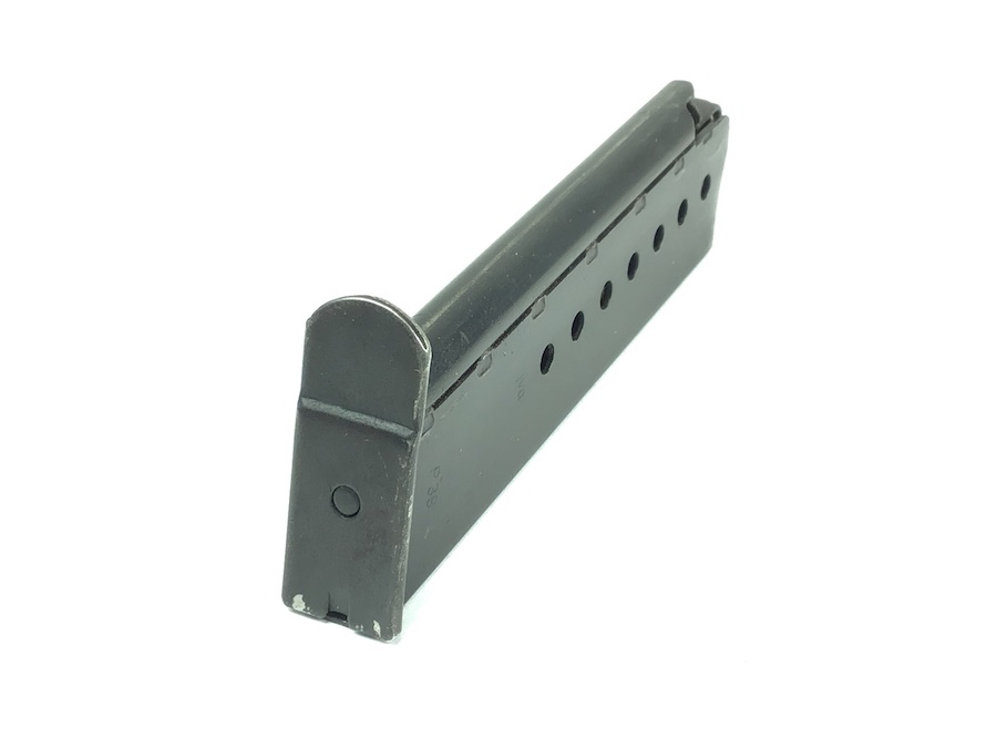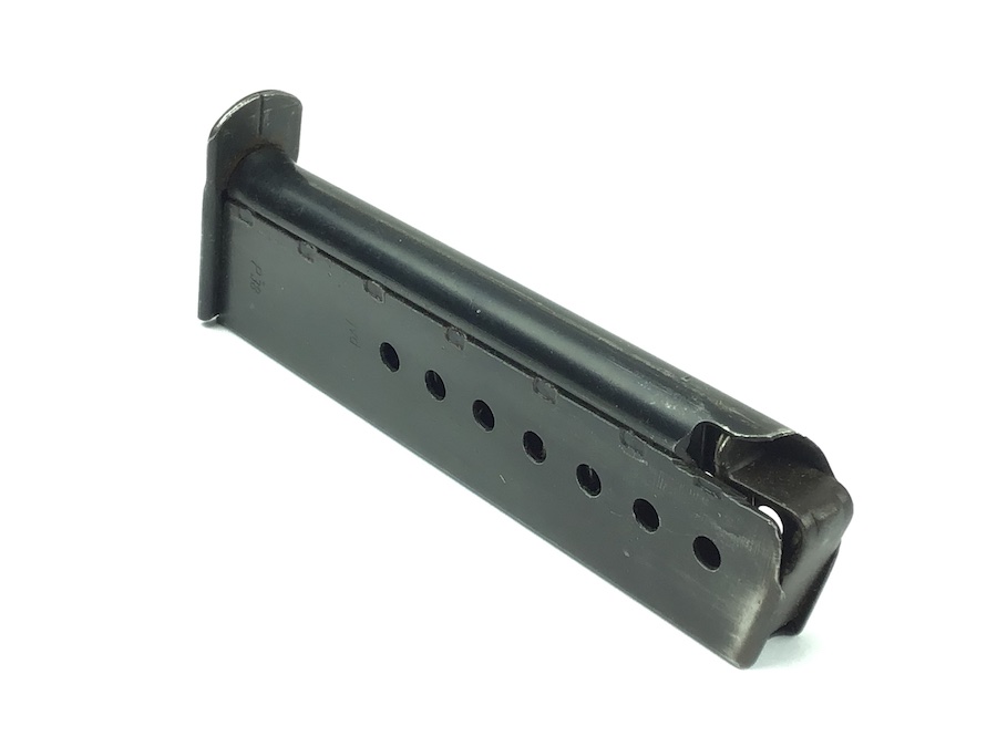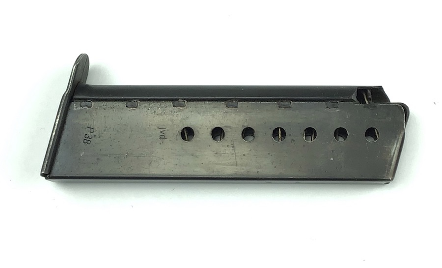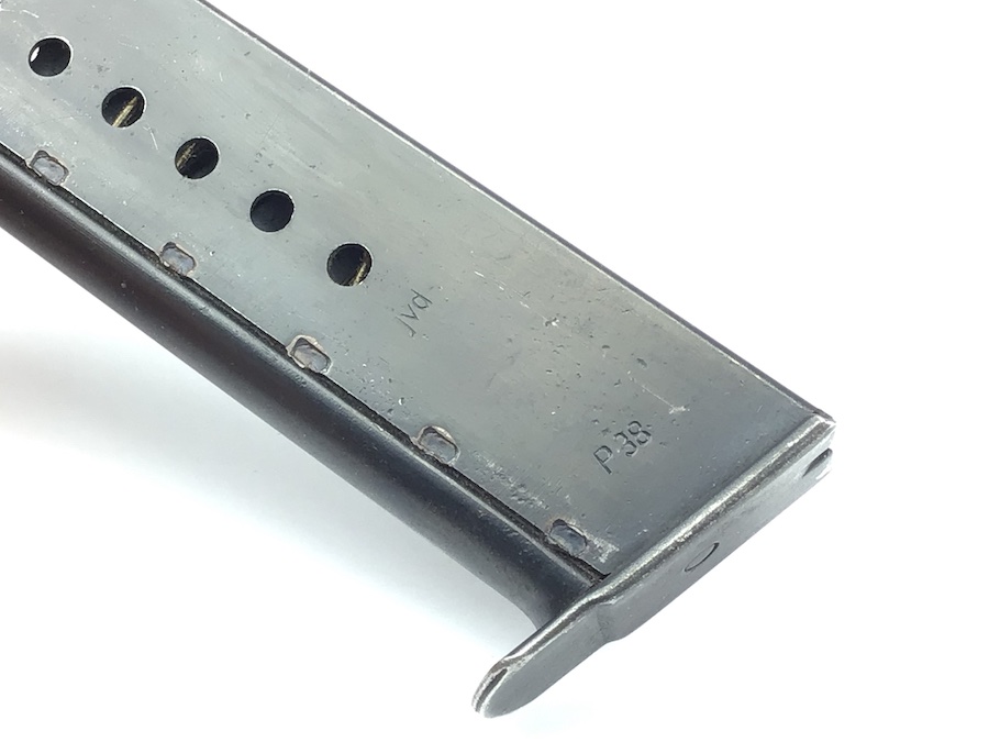 12/18/20 – This is an original late WW2 variation P.38 magazine. The left side of the frame is “jvd” and P.38 stamped. The spine is stamped “jvd” and Waffenamt E/WaA706. There are no other markings. The spring is excellent and fully functional. The original blued finish has minor wear with no rust or pitting. This magazine variation was issued with Spreewerk and Mauser pistols from 1944.