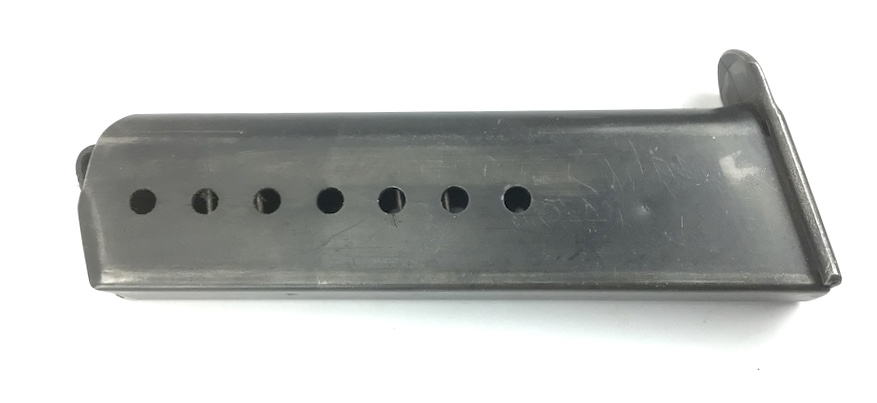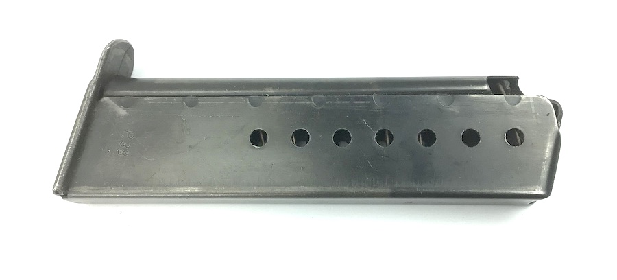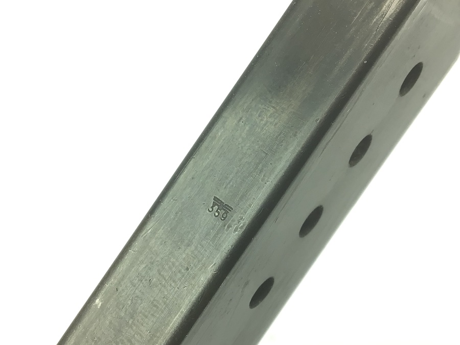 3/31/21 – This is an original WW2 variation P.38 magazine. The left side of the frame is stamped “P.38”. The spine is stamped with the eagle 359 proof stamp. There are no other markings. The spring is excellent and fully functional. The original blued finish has minimal wear with no pitting or corrosion. These magazines were provided with the total number of 90,000 pistols produced from May 1942 until February 1943.
