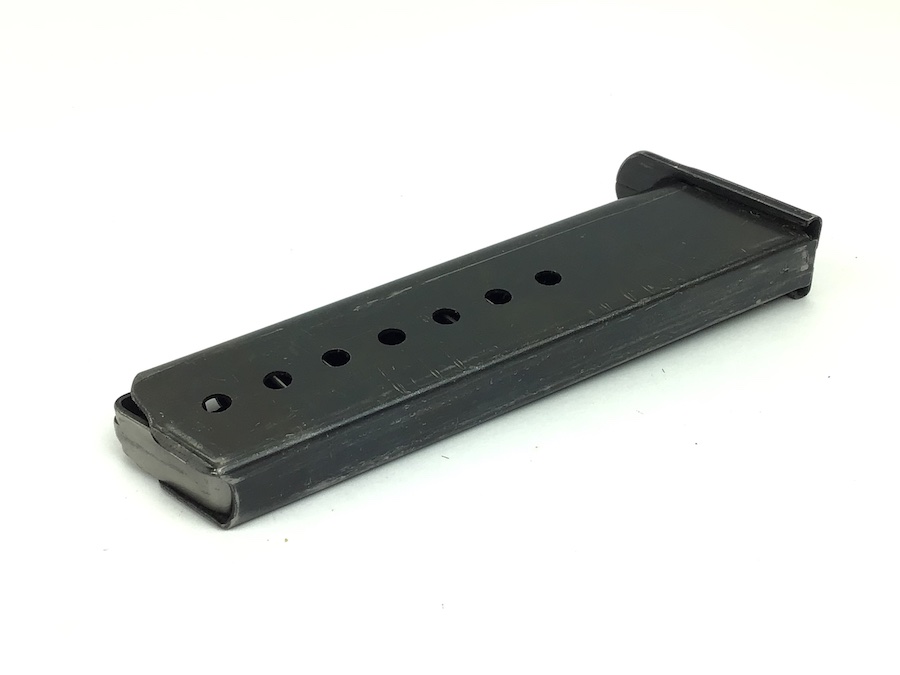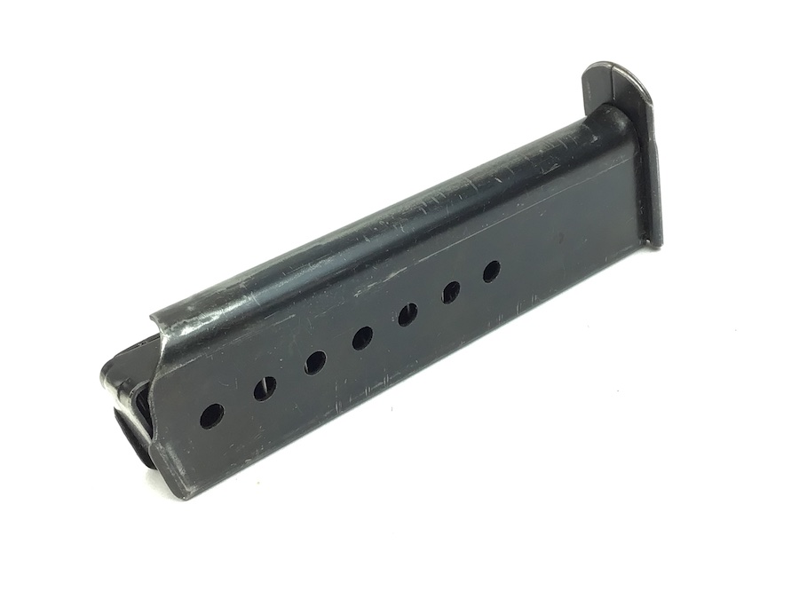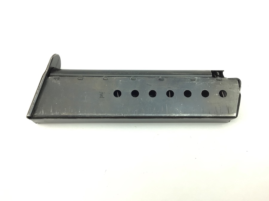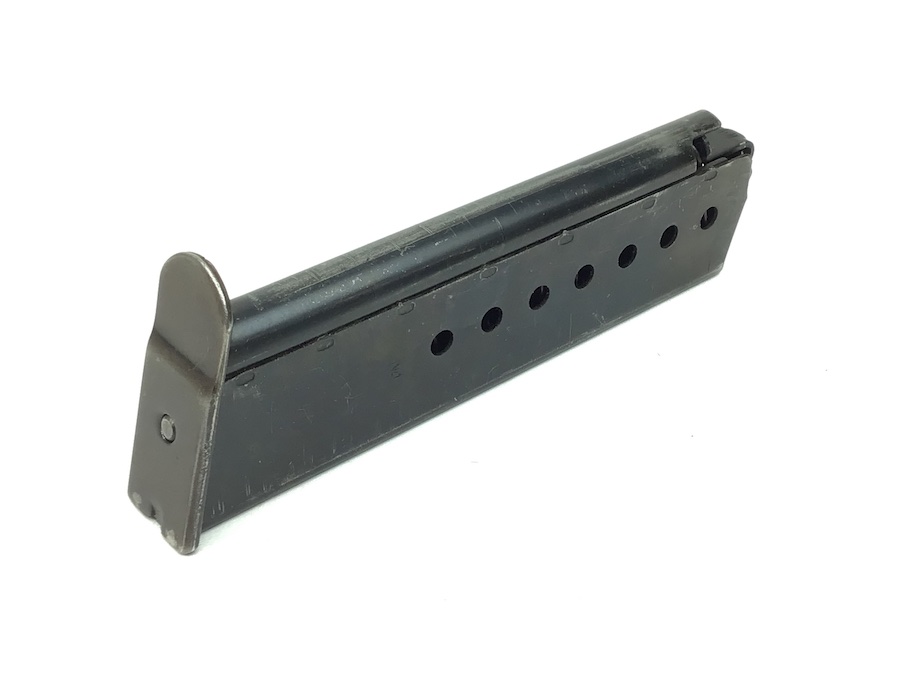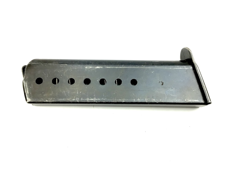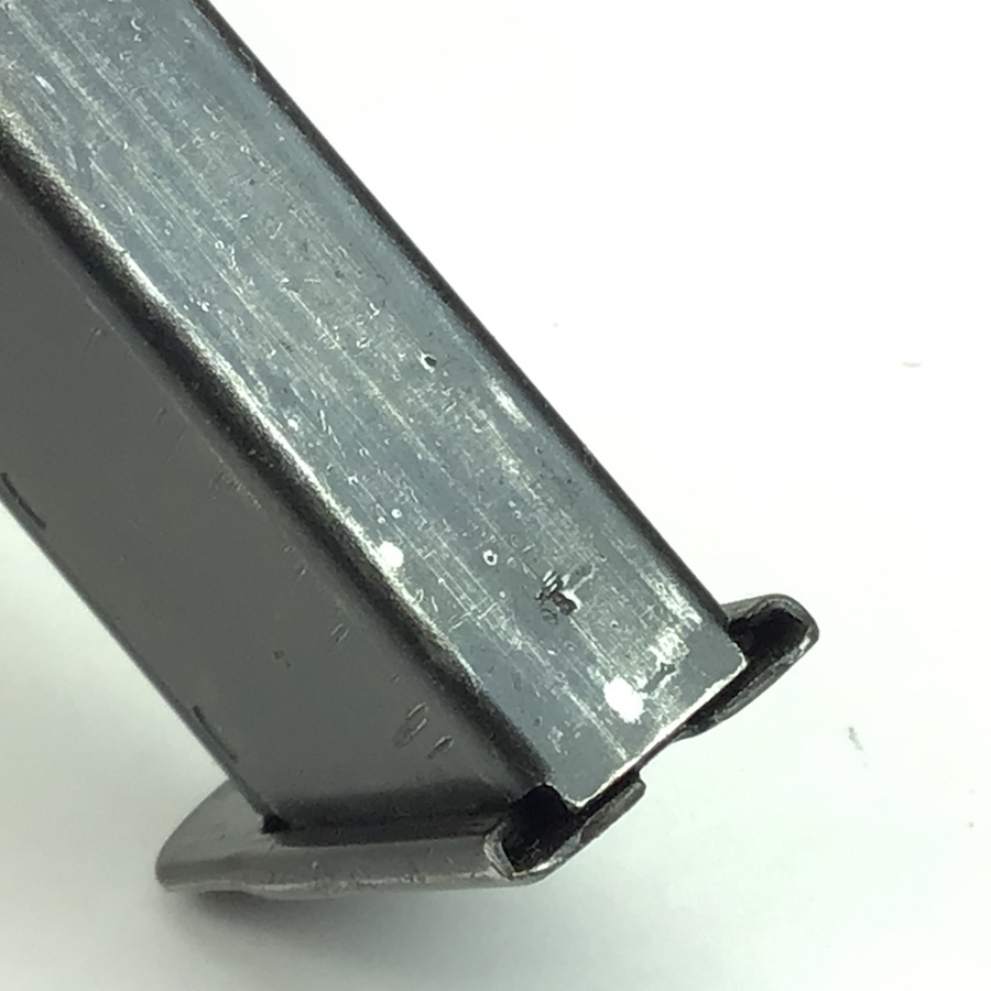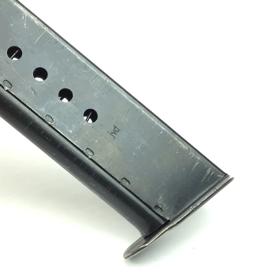 11/19/21 – Original and very good condition. This is a second variation magazine produced by Erste Nordbohmische Metallwarenfabrik (ENM). JVD is the only marking found on the left side of the housing. Eagle 88 is stamped on the lower portion of the spine. These magazines were issued with Spreewerk pistols (cyq).
