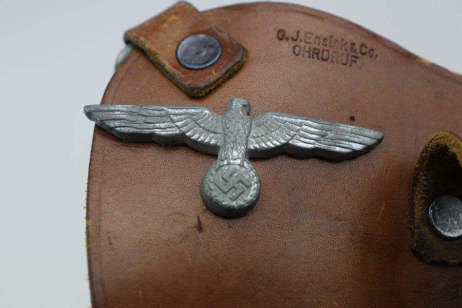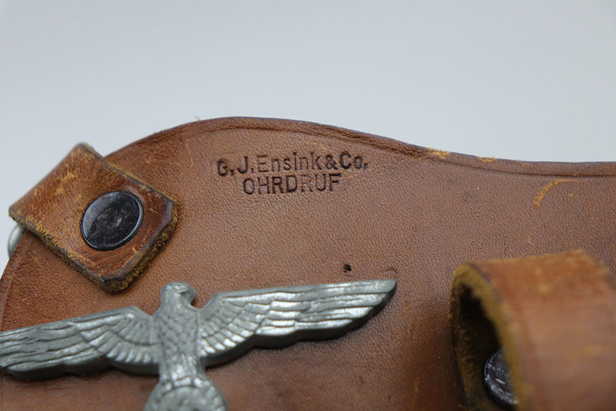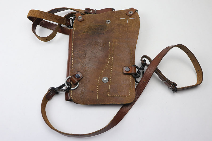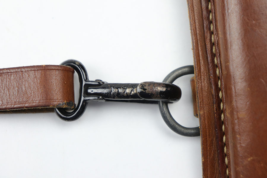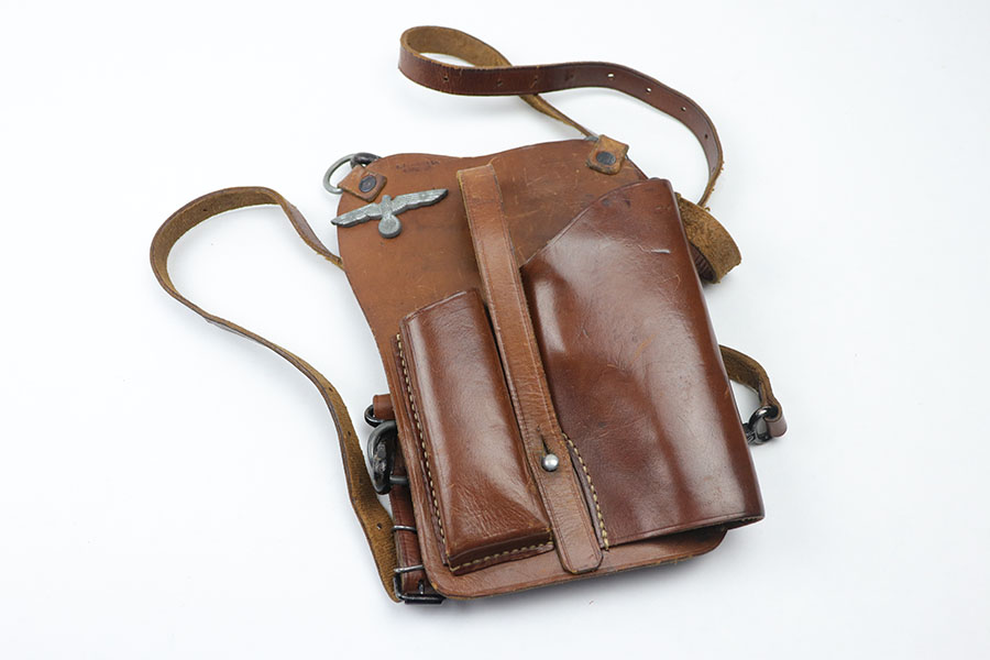 10/26/21 – This is a P.38 shoulder holster. The holster is likely late WW2 production, or early postwar. There is a maker stamp on the front top left corner of leather. Underneath the maker stamp is an embellished Nazi uniform eagle. Hard to say whether this was added during or after the war. The leather is in great condition. Clean and without any major issues or blemishes. The stitching is all tight and original. Excellent shoulder strap.