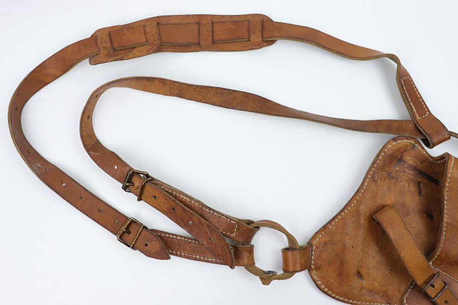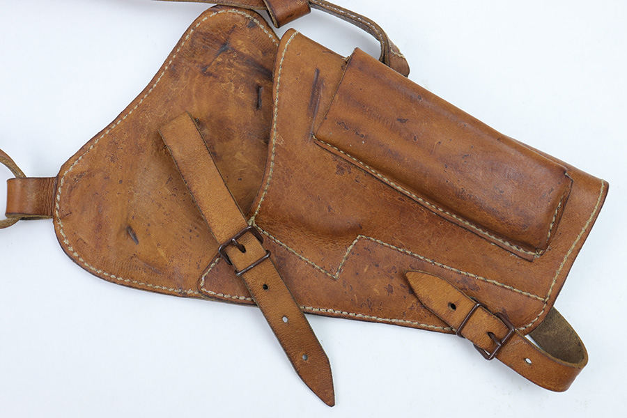 1/9/23 – This is a fairly scarce variation leather P.38 shoulder holster. The holster is unmarked except for an ink stamp on the back leather that looks to be a Germany export stamp. The style of leather and stitching tells us this is likely a late WW2 or early post WW2 production holster. The leather is in great condition but shows evidence of previous use. The leather is pliable and soft with some mild surface wear but no major issues. No stitching issues as all the stitching appears original throughout. The shoulder straps are in great condition as well.