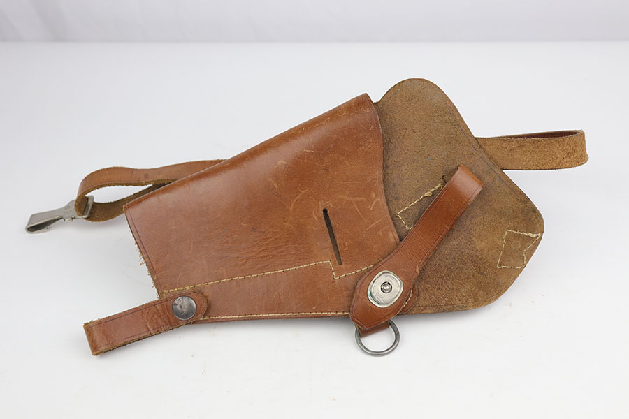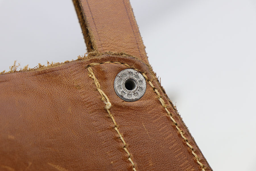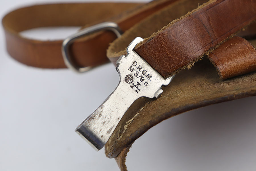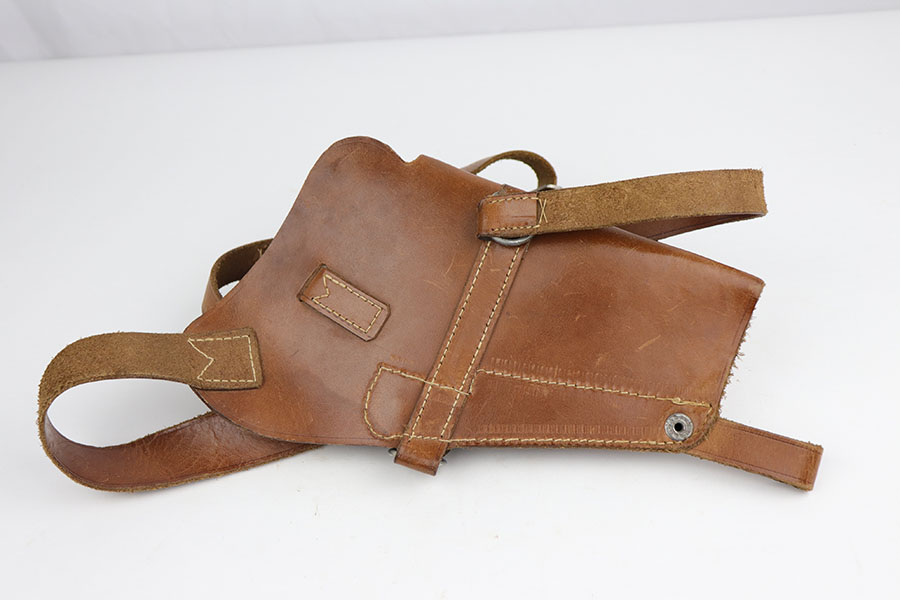 9/6/19 – This is an original German P.38 shoulder holster. The holster has excellent, unmarked leather with minimal wear. The stitching appears all original, tight, and in tact. The front closure snap is maker stamped by Alan Stoger. The shoulder strap clips are RZM maker stamped, as shown in photos. The style indicates commercial production, but it’s hard to determine a date. Overall a fairly scarce shoulder holster.