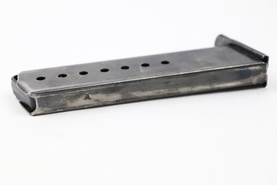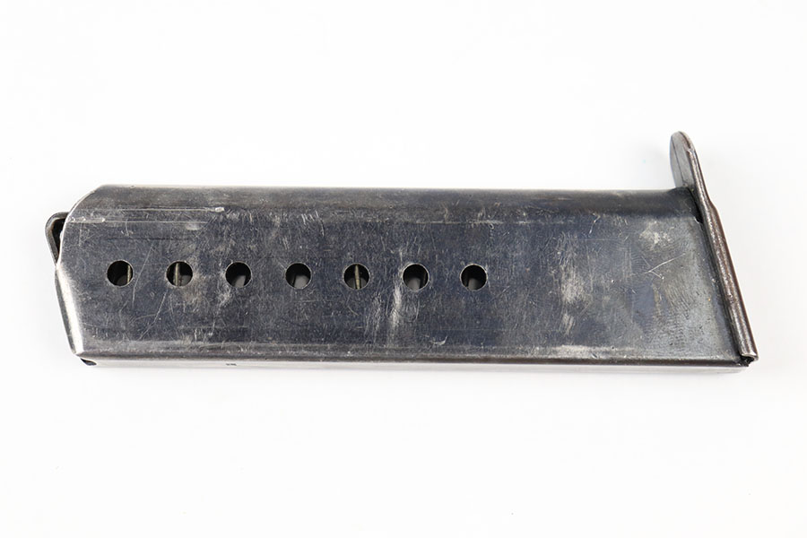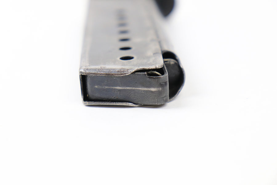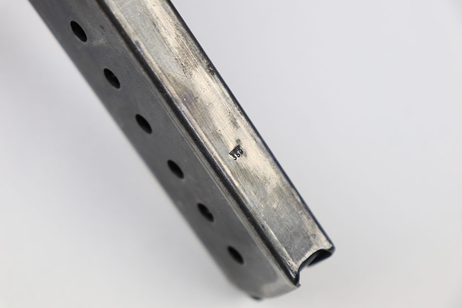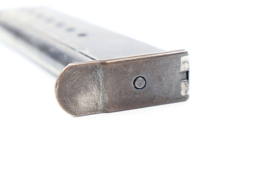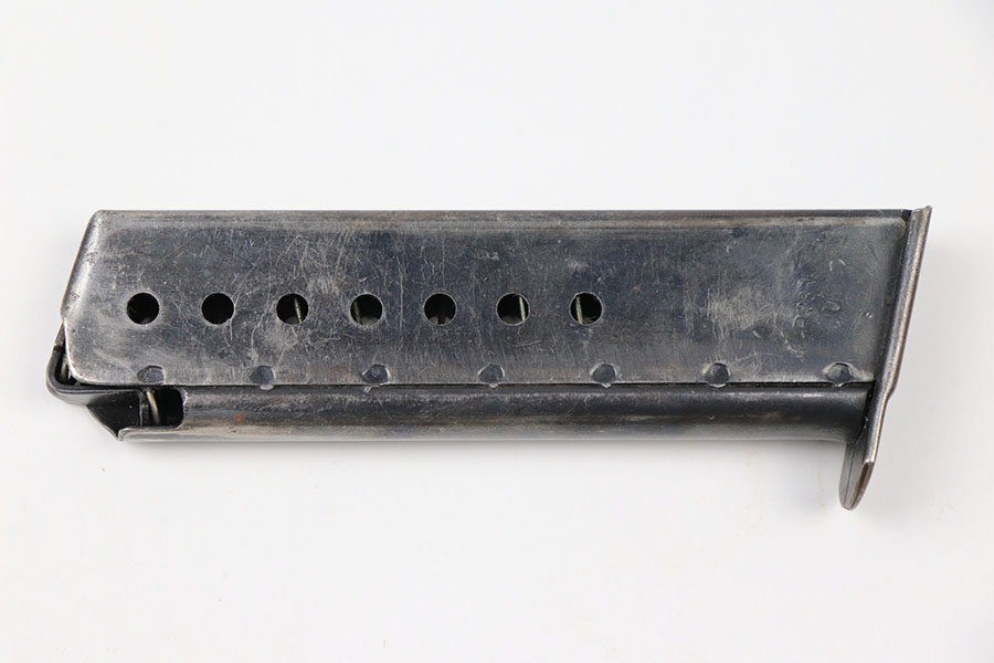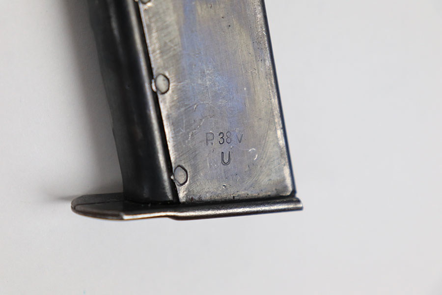 9/2/21 – This is an original Walther P.38 magazine from late WW2. The magazine has a “U” under the P.38v stamp on the left side of the tube. This means they skipped the metal hardening process, a late war feature. The magazine is also stamped on the spine with an eagle 359 military acceptance stamp. The bluing is thinning throughout, but overall the magazine is in great shape. Strong, functional spring.