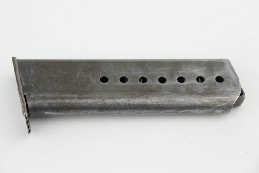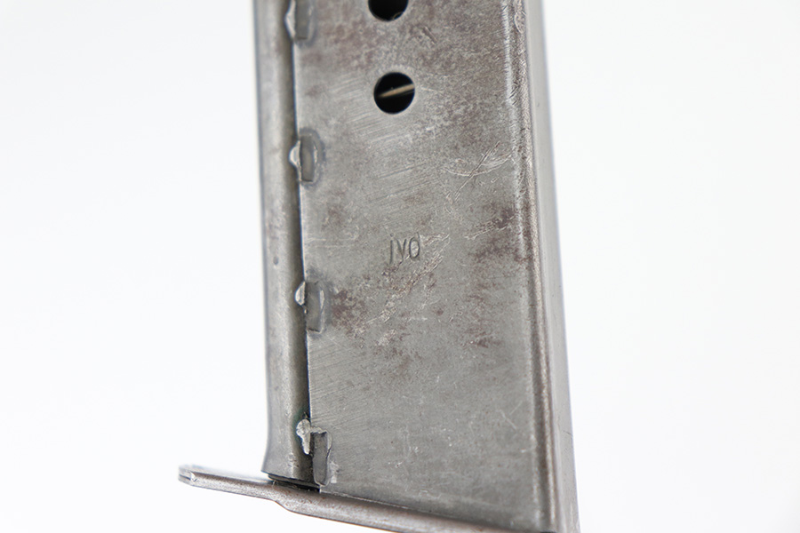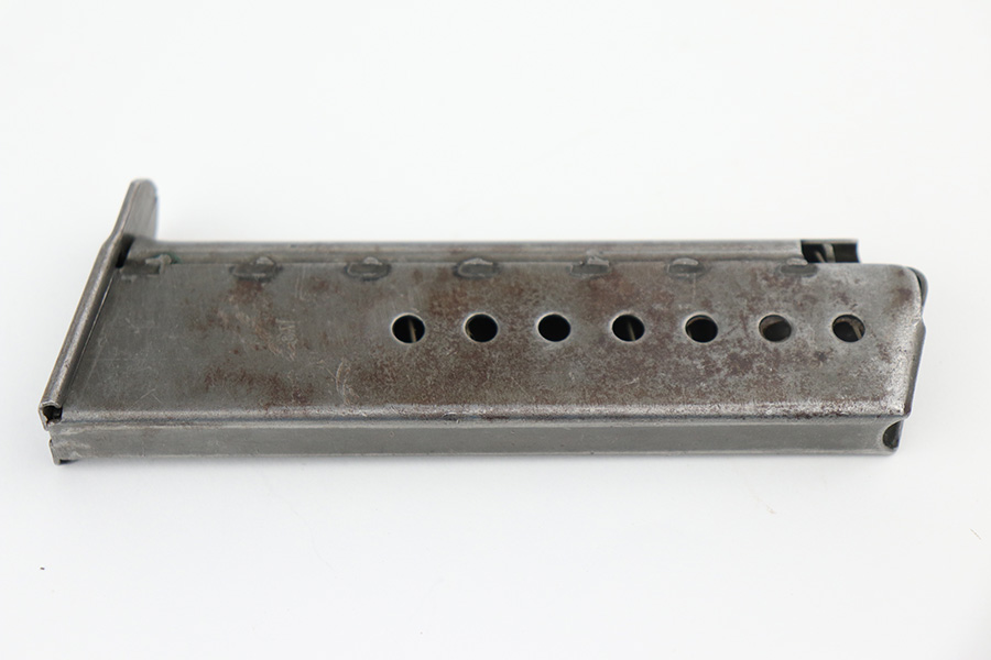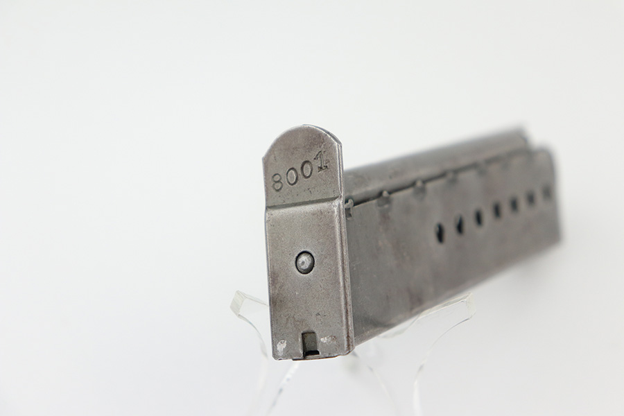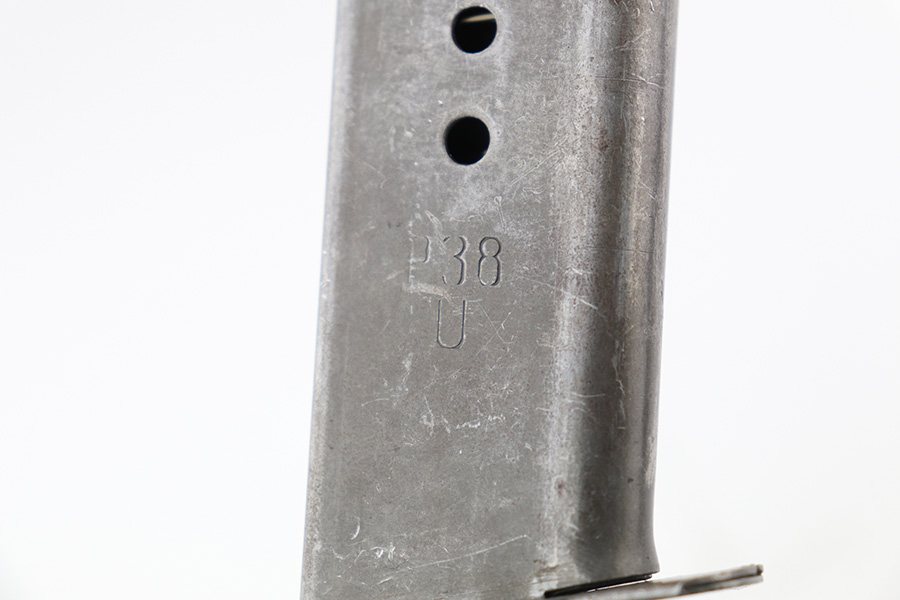 9/17/21 – This is a late WW2 production P.38 magazine. The magazine is stamped P.38 U, which is a late war feature to signify they skipped the metal hardening process was skipped during production. The magazine is also stamped jvd on the tube. The base of the magazine is post-factory serial numbered 8001. Price reduced accordingly. Strong, functional spring.