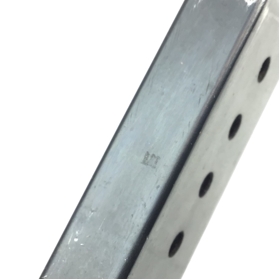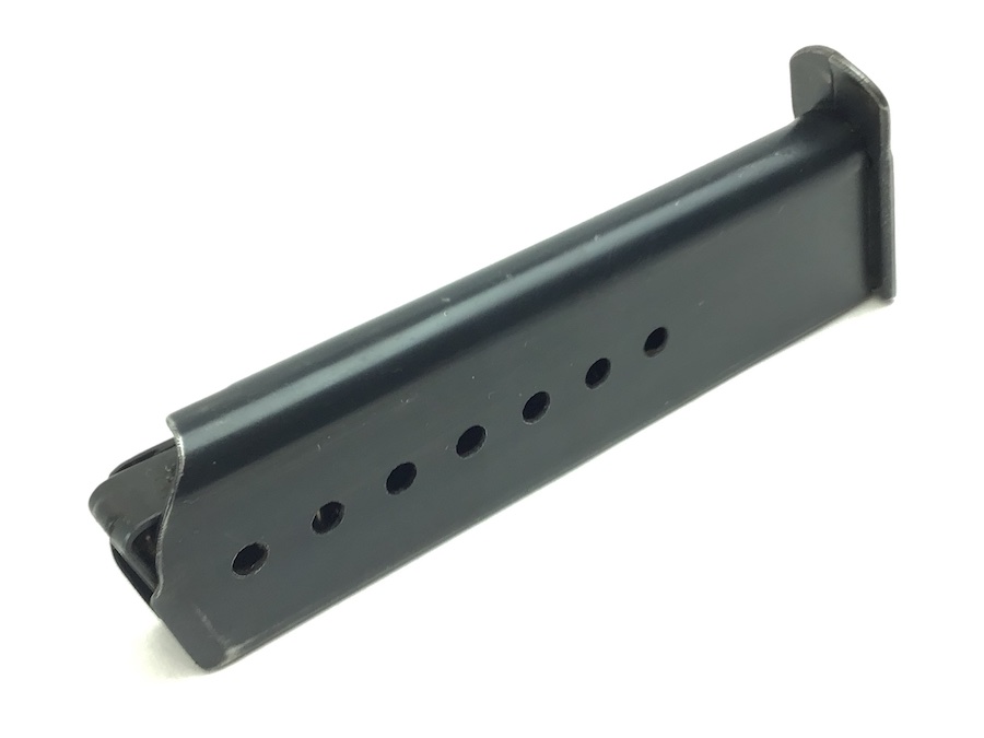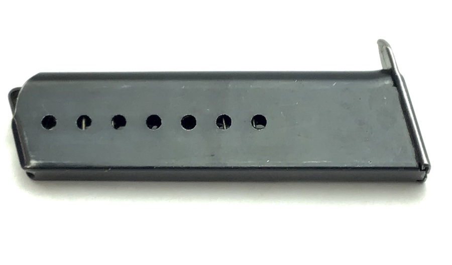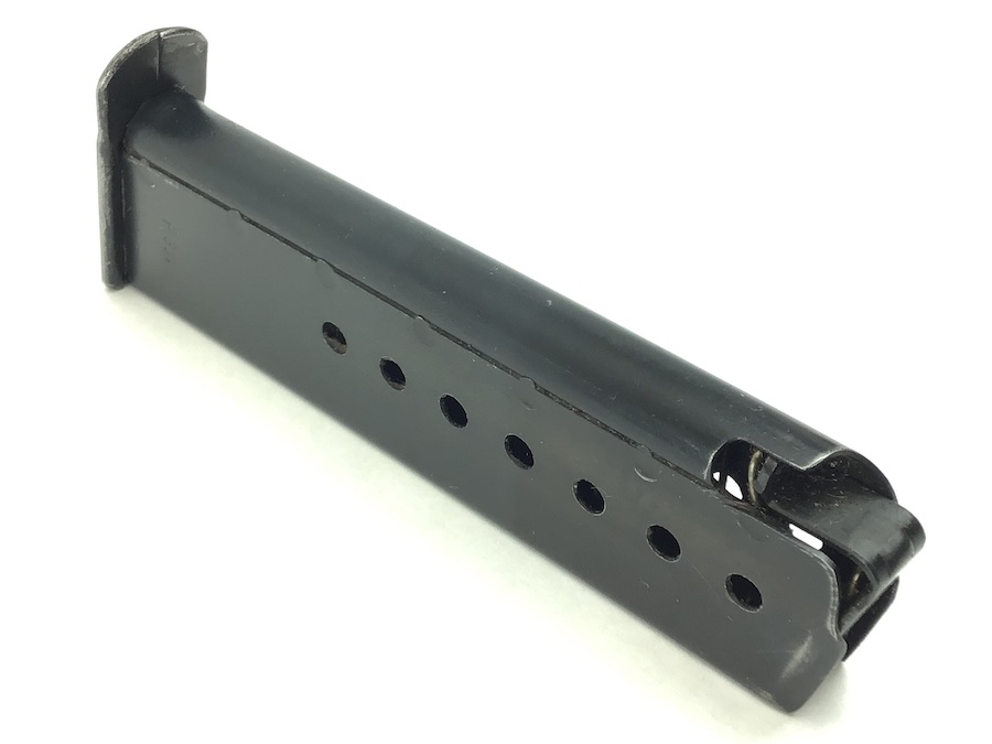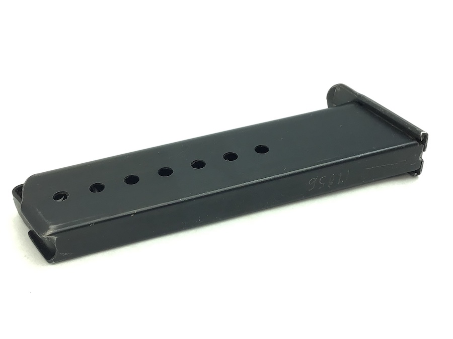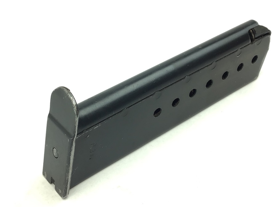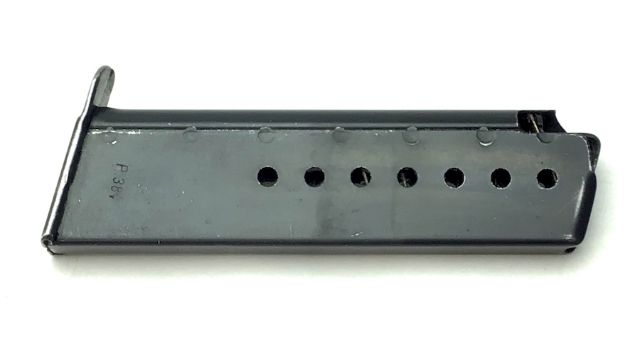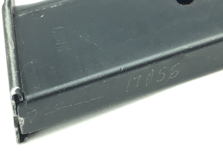 2/22/21 – This is an original WW2 variation P.38 magazine. The left side of the frame is stamped “P.38v”. The spine is stamped with “E/359” upside down near the top. There is also a serial number “17056” etched into the spine near the bottom. The spring is excellent and fully functional. The original blued finish has minimal wear with no pitting or corrosion.
