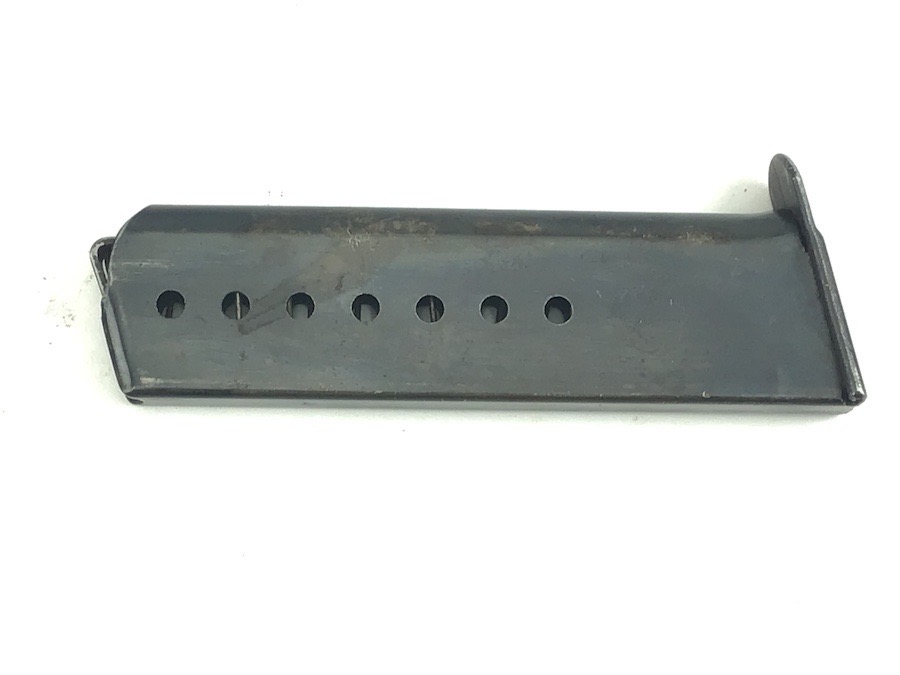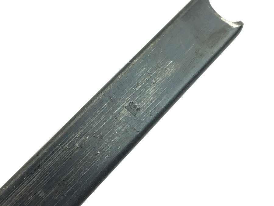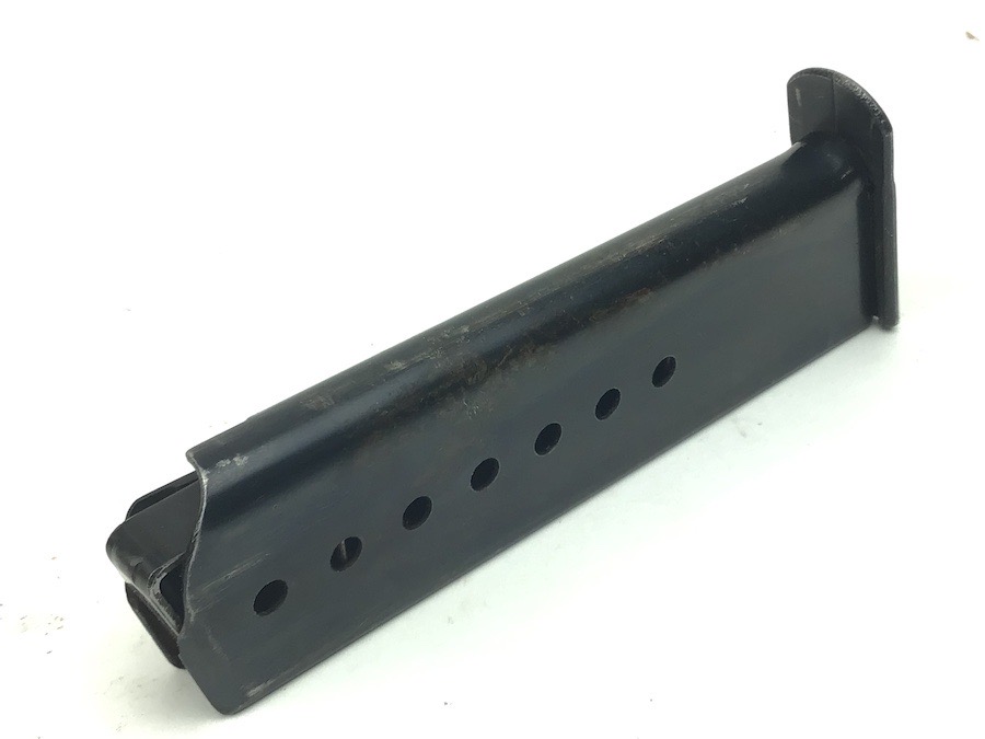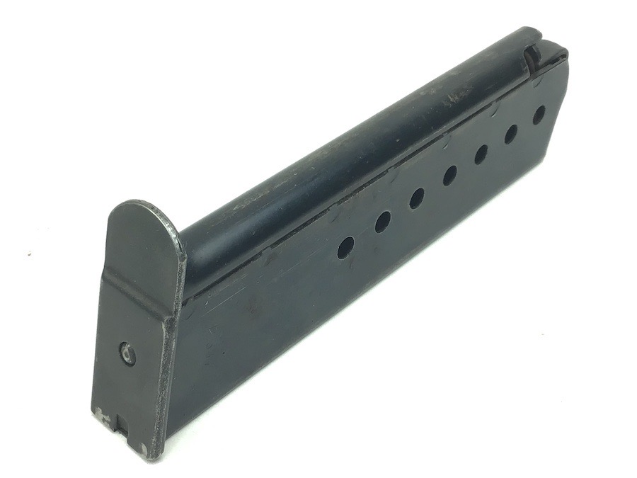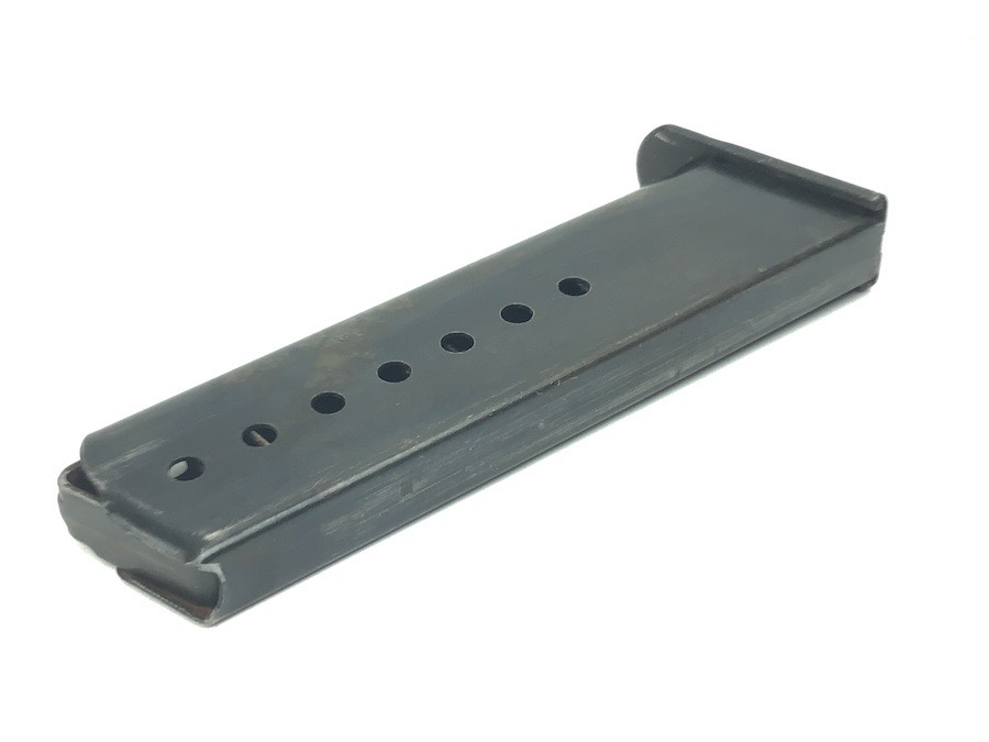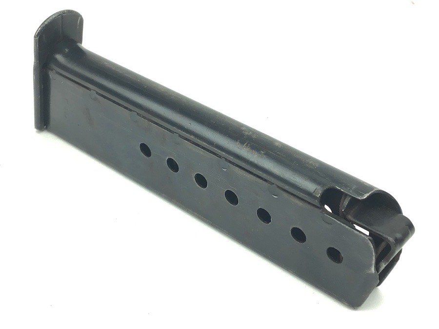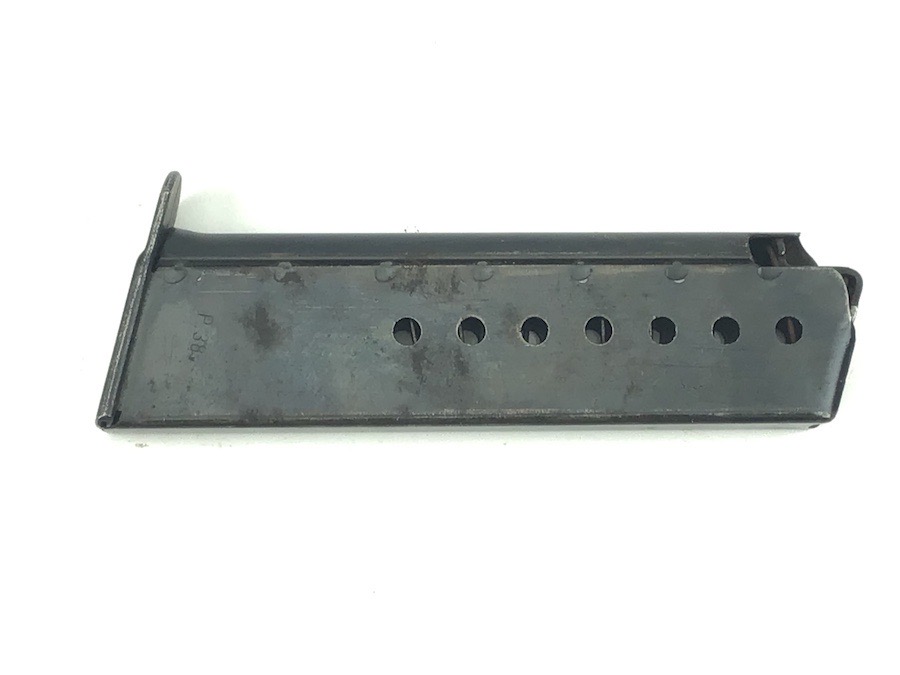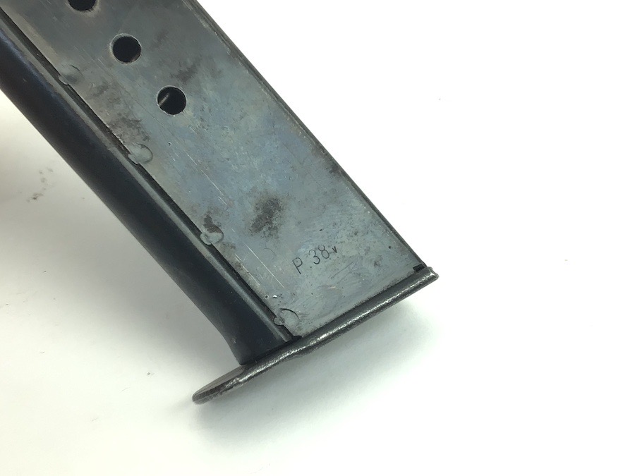 12/21/22 – This is an original WW2 variation P.38 magazine. The left side of the frame is stamped “P.38v”. The spine is stamped with “E/359” upside down near the top. The spring is excellent and fully functional. The original blued finish has typical wear and a few small areas of minor pitting.