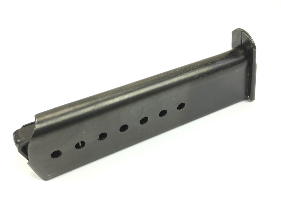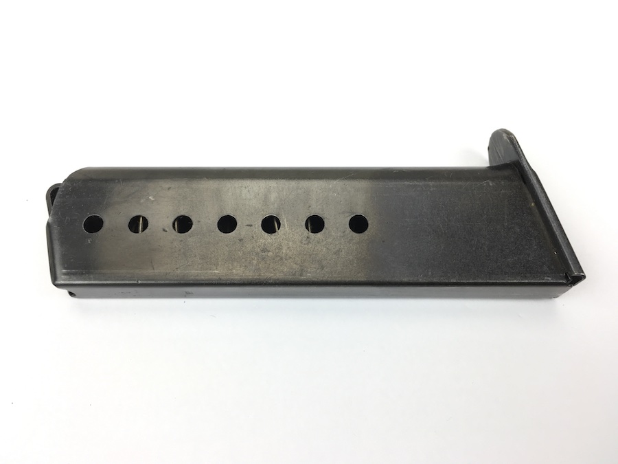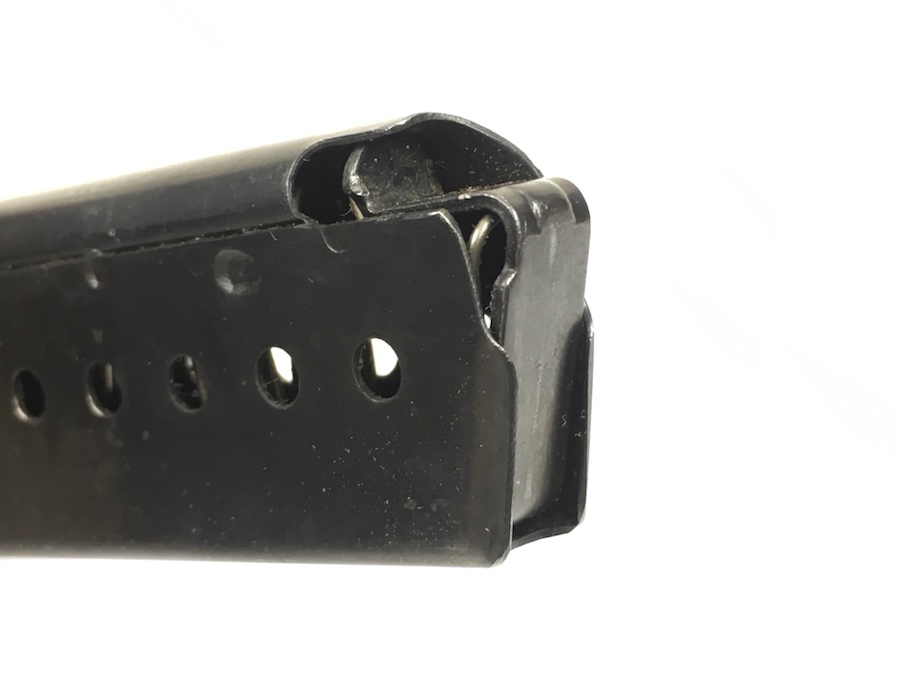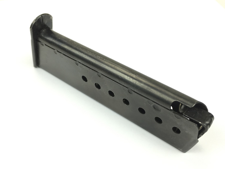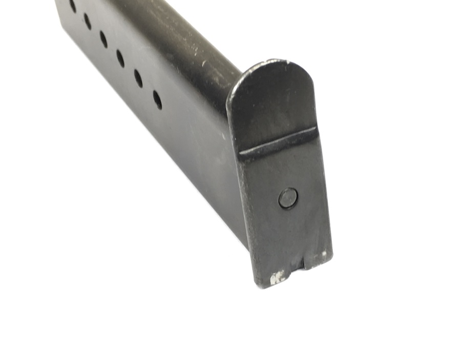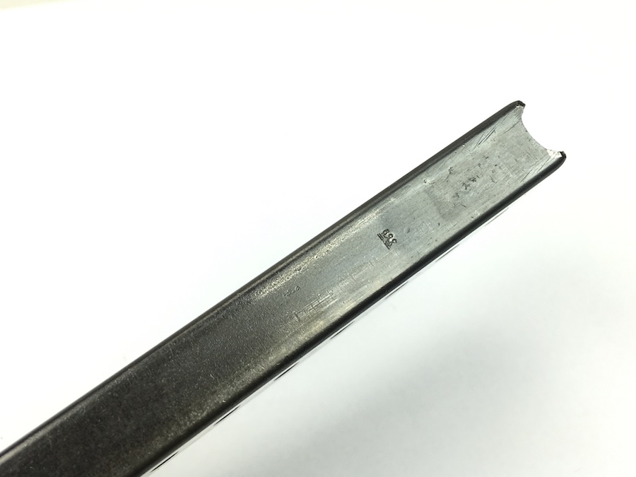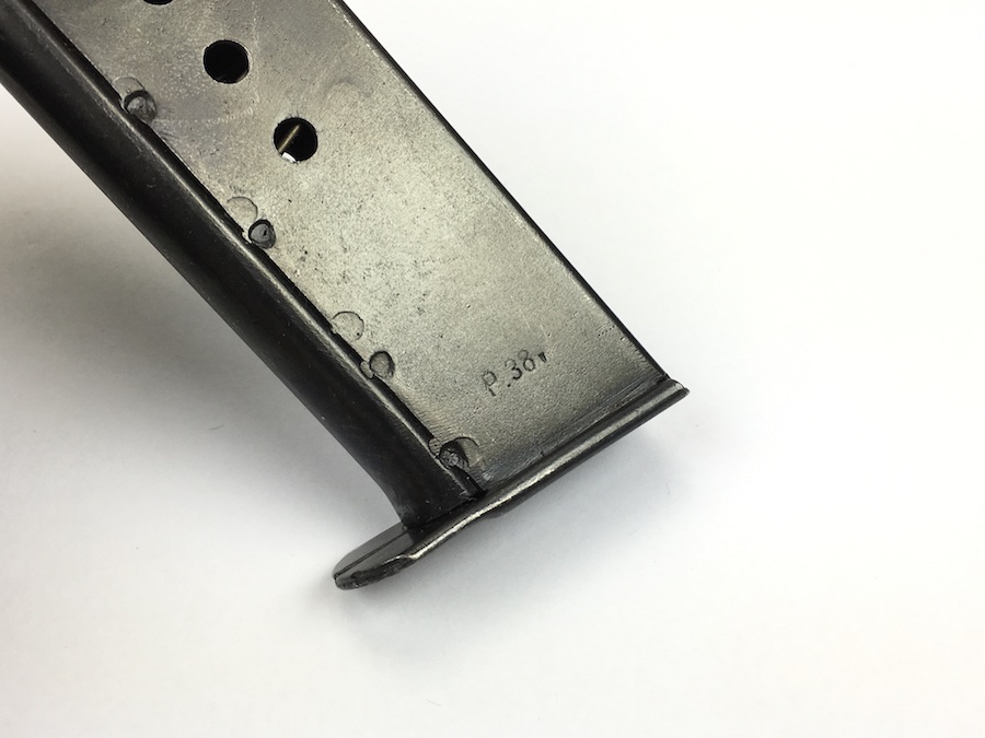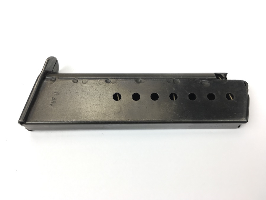 7/19/19 – This is an original WW2 variation P.38 magazine. The left side of the frame is stamped “P.38v”.  The spine is stamped with “E/359” upside down near the top. There are no other markings. The spring is excellent and fully functional. The original blued finish has minimal wear with no pitting or corrosion.