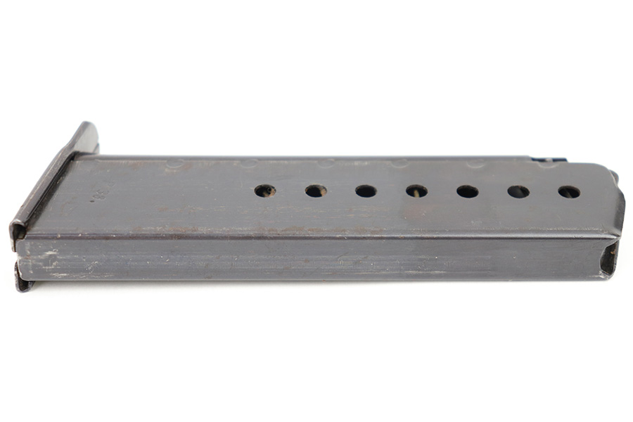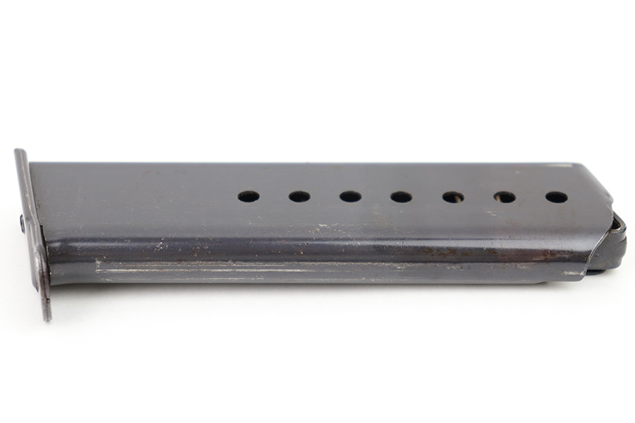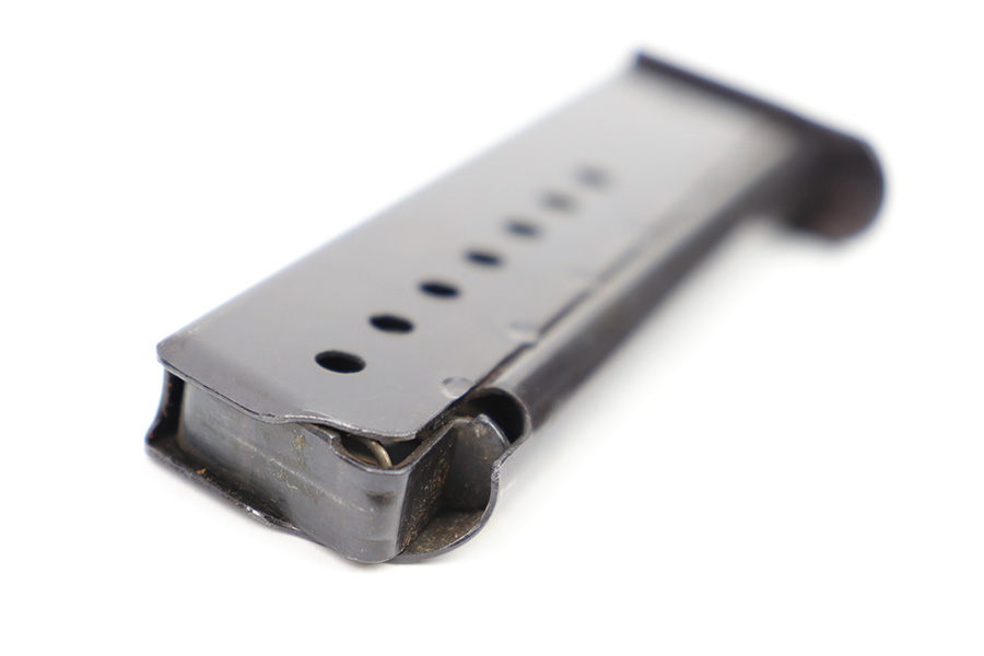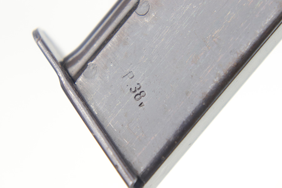 2/17/23 – This is an original WW2 magazine stamped with P.38v on the left side of the housing. No other markings. No acceptance stamp is found on the spine, as this magazine was likely issued with commercial P.38’s. There is very mild patina throughout the magazine but no signs of pitting or rust. The base is in excellent condition and the spring is strong and fully functional.