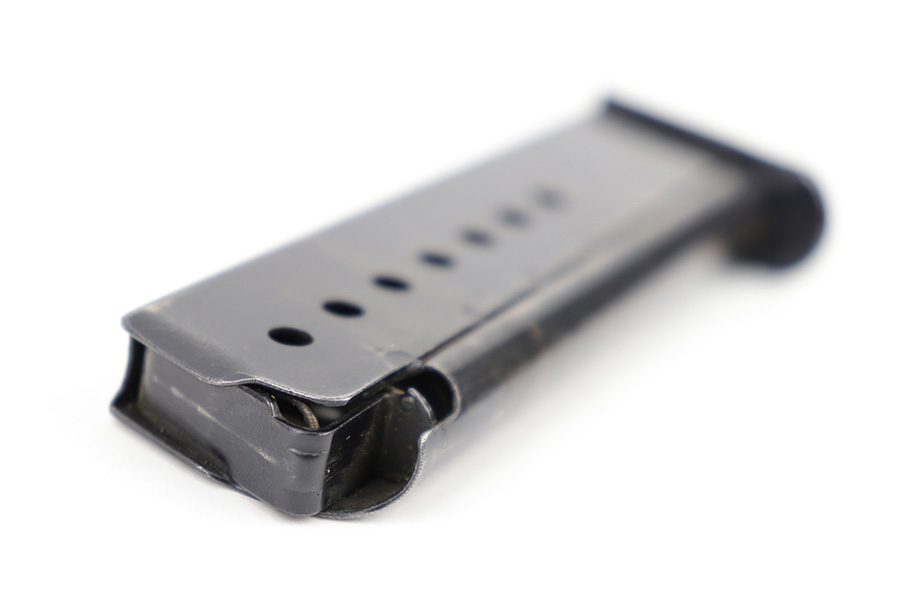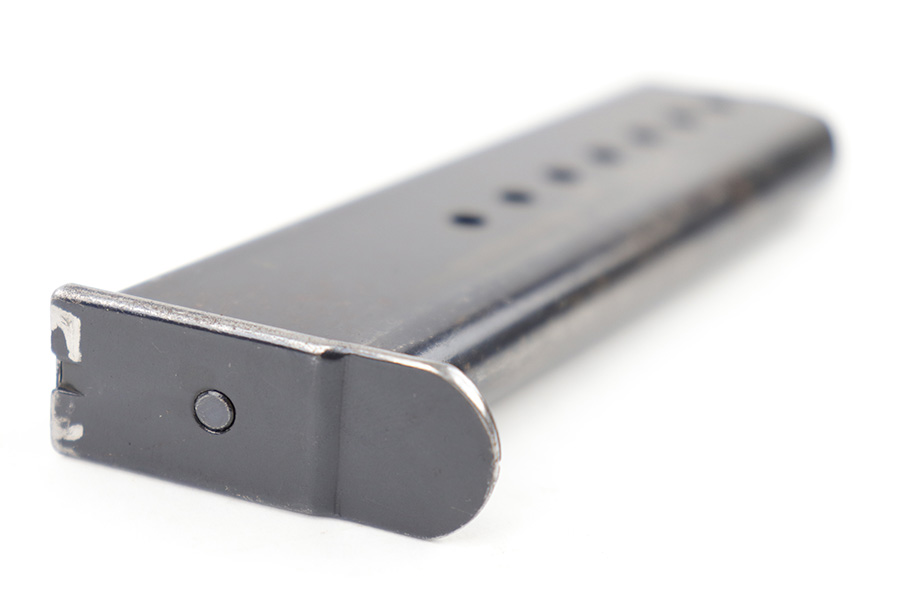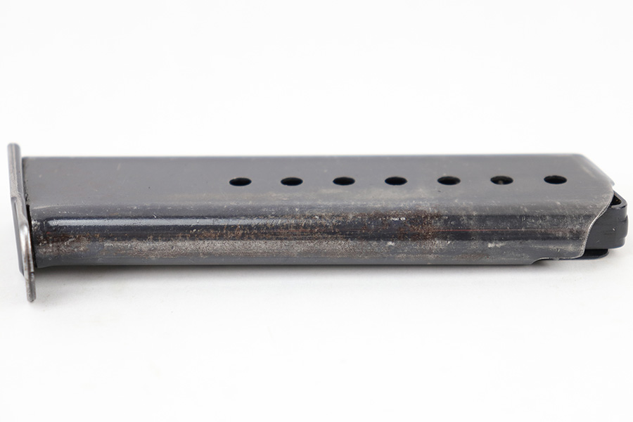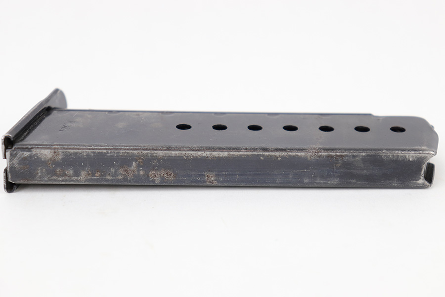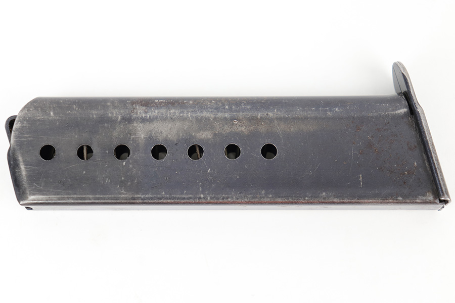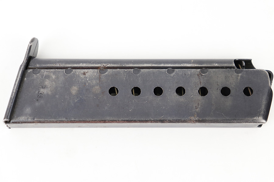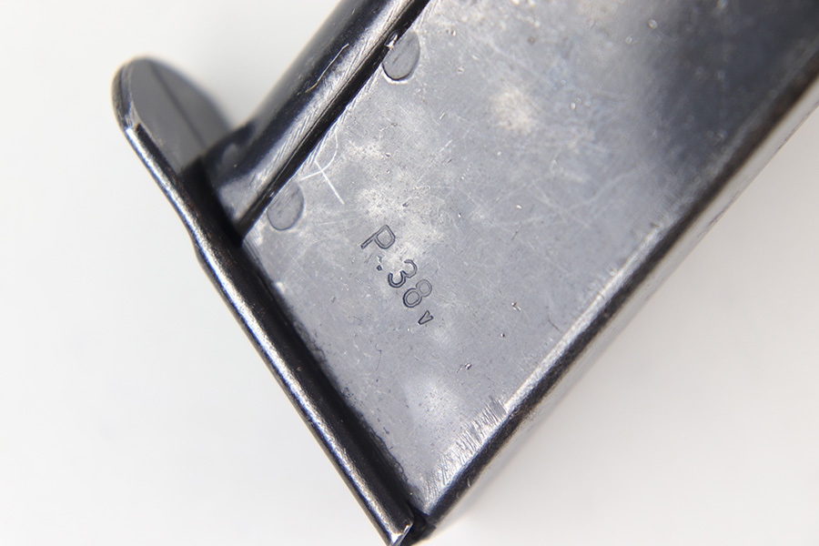 6/20/23 – This is an original WW2 production P.38 magazine. The magazine is somewhat unusual because it lacks any proof stamps. These are believed to be commercial-issued magazines. The only external stamp is a P.38v stamp on the left side of the tube. The magazine has a wartime finish with areas of mild finish loss and surface patina. The spring is strong and fully functional.