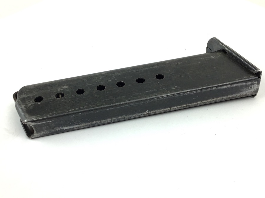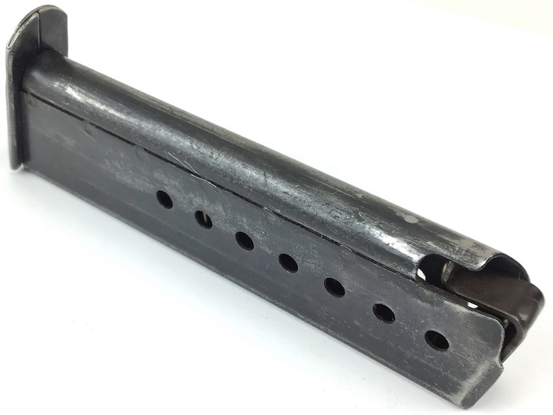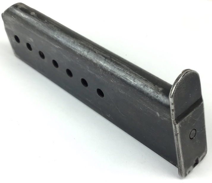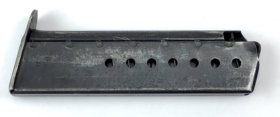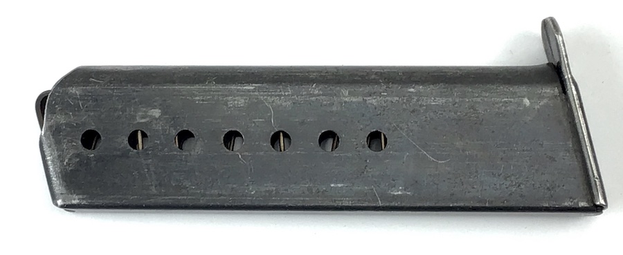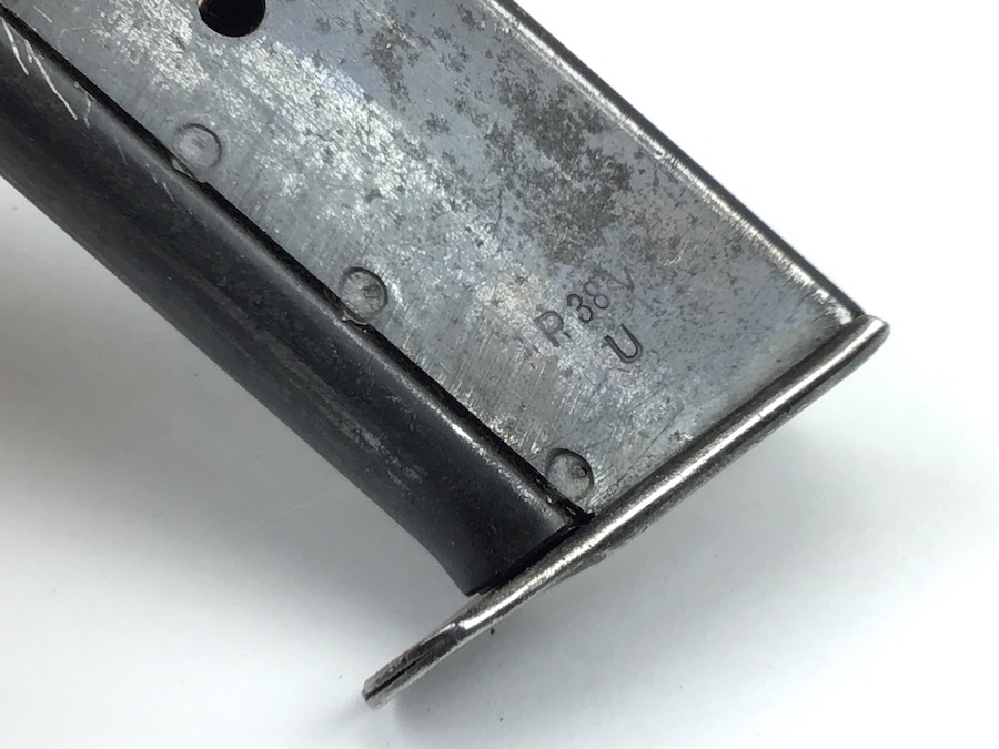 3/23/20 – This is an original late WW2 variation P.38 magazine. The left side of the frame is stamped “P.38v U”. The U stands for unhardened metal which was a late-war manufacturing technique used to speed production. There are no other markings. The spring is excellent and fully functional. The original blued finish has minor wear and a small are of pitting at the P.38 stamp. These magazines were issued with late WW2 production P.38 pistols.