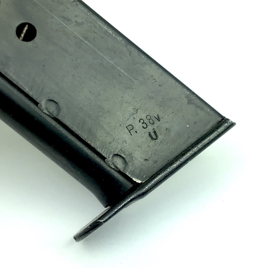 4/14/20 – This is an original late WW2 production P.38 magazine. The magazine is stamped “P.38v U” on the left frame. Semi-rare ribbed follower. These are both late war features only used at the end of production. No stamps on the spine, so could be used on late war Mauser or Walther P.38s. Most correct for late ac 45 models. Some light wear throughout but overall in great condition. Fully functional.