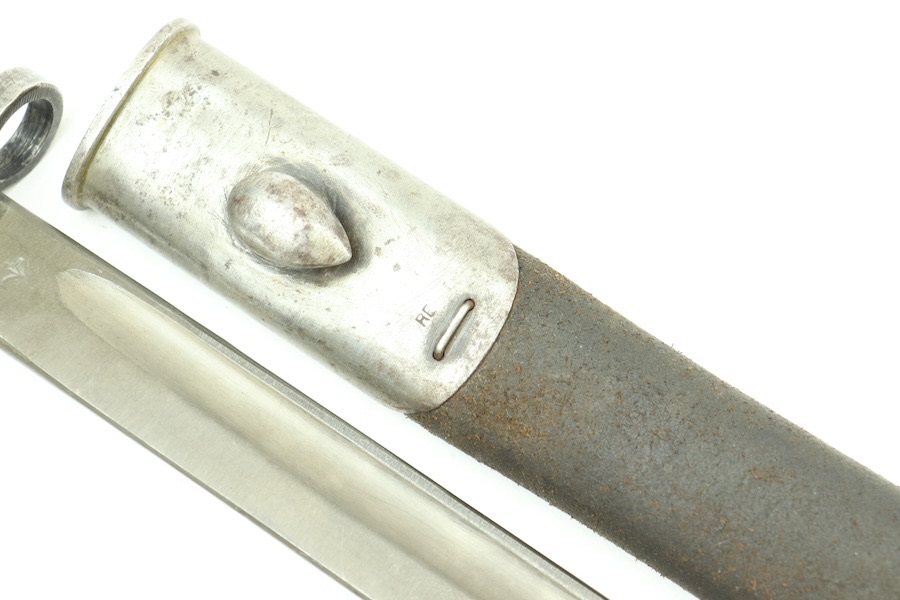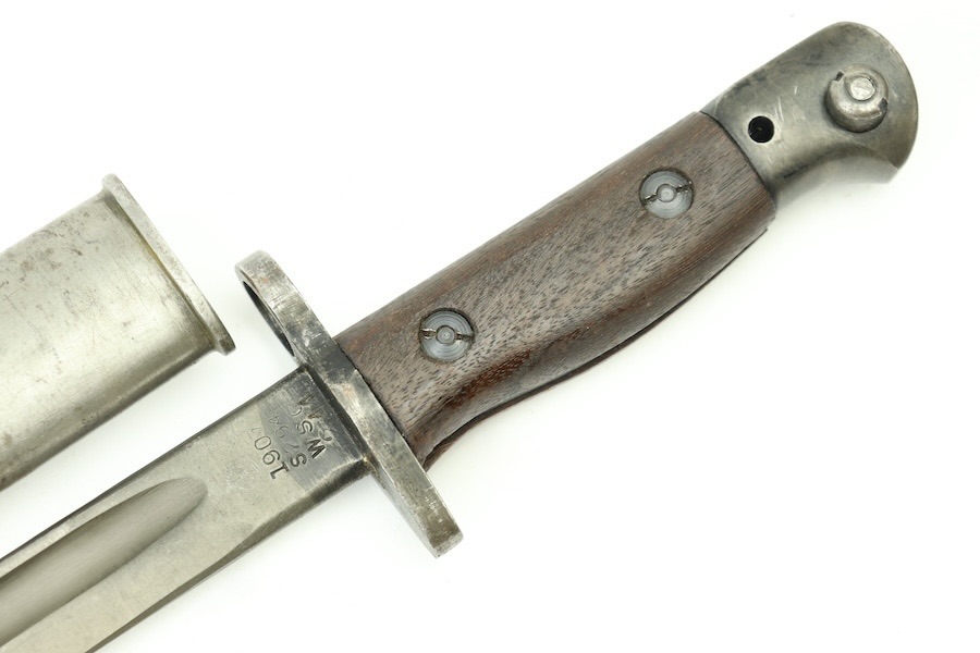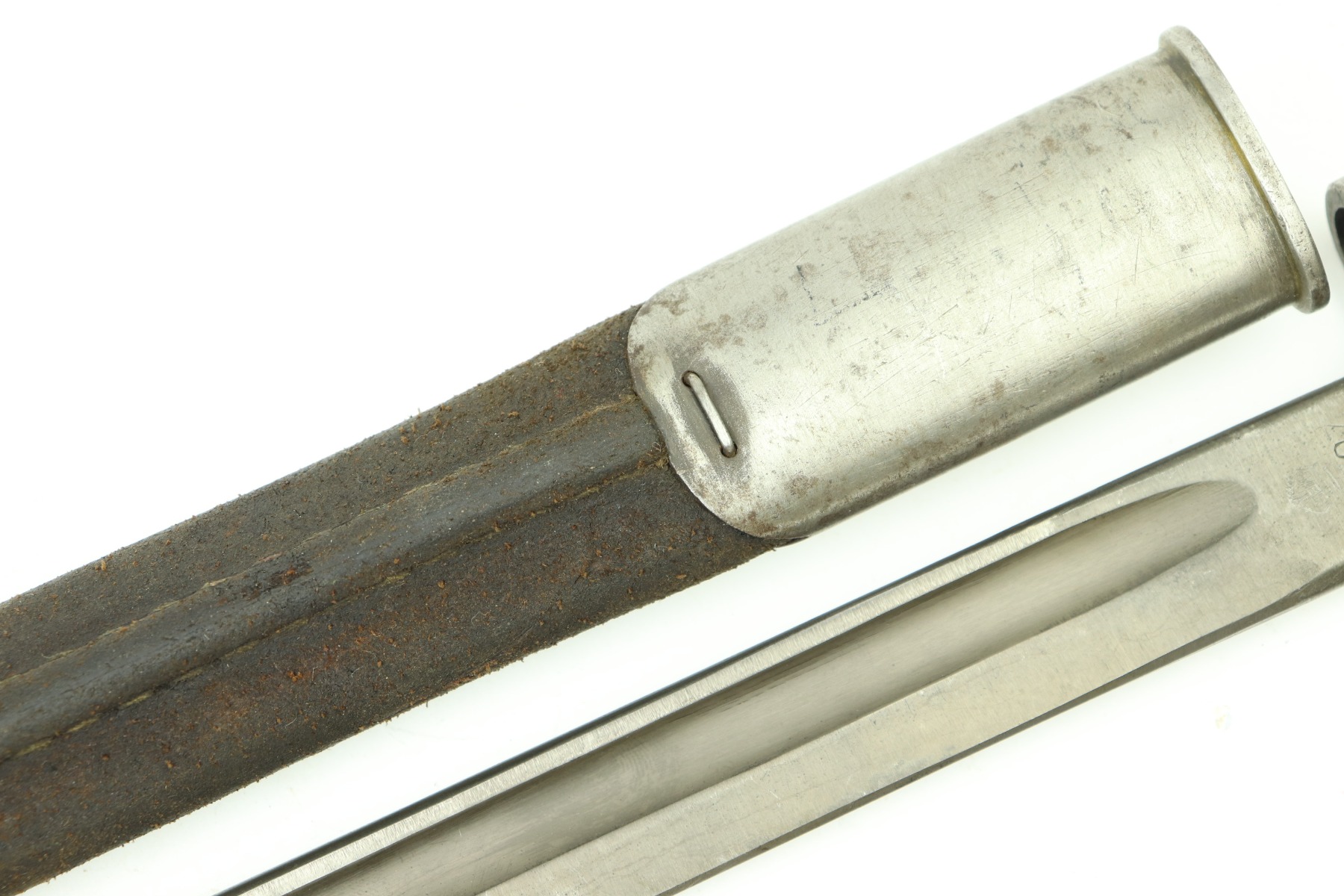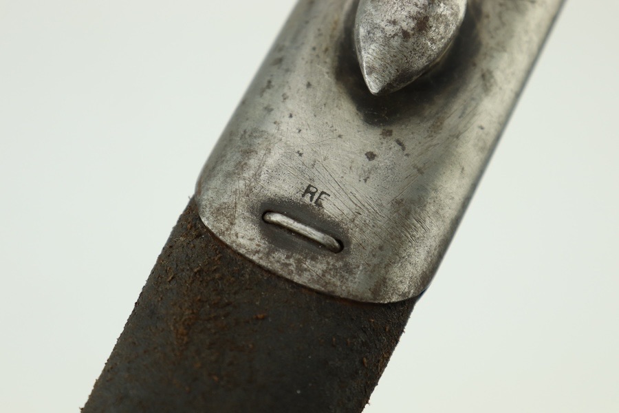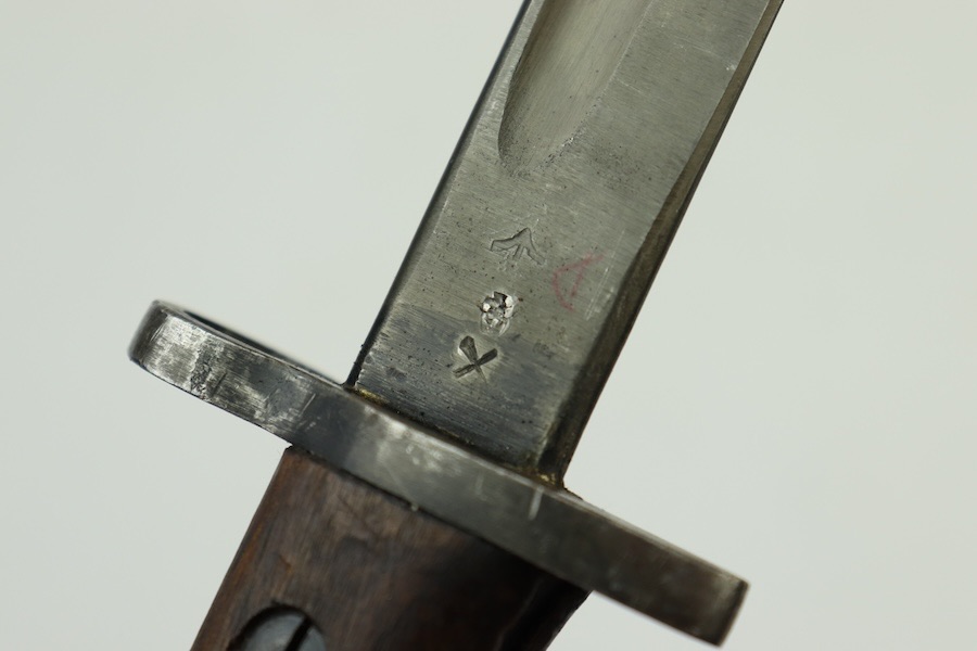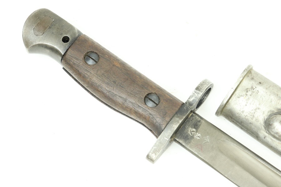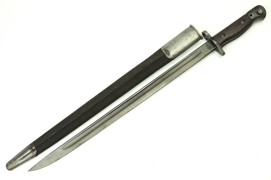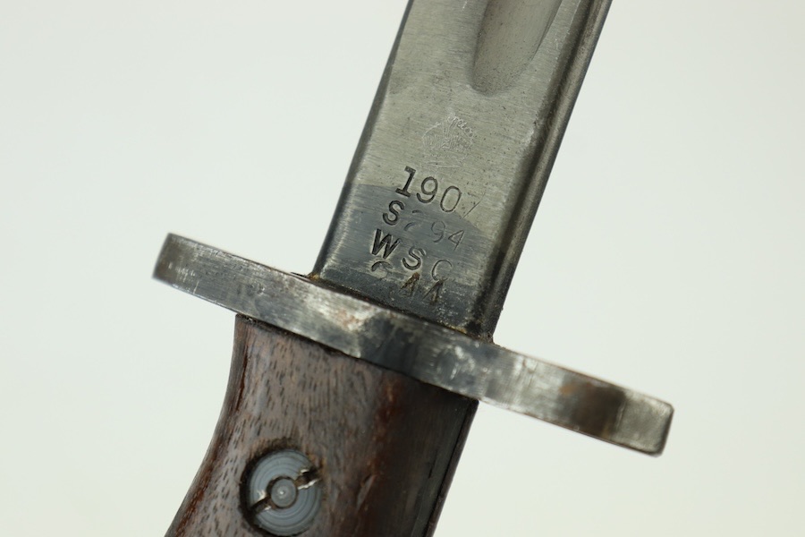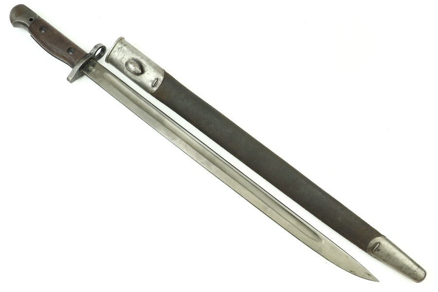 10/25/23 – This is an original and excellent condition P1907 Wilkinson bayonet. Bayonet comes with a very nice leather scabbard that has very little wear. The blade shows very little wear and retains its factory edge. Ricasso is dated and has maker stamps as well as British inspection proofs. The cross guard and pommel show minor finish loss with no rust or pitting. Bayonet is fitted with a set of excellent dark brown wood grips that have few imperfections.