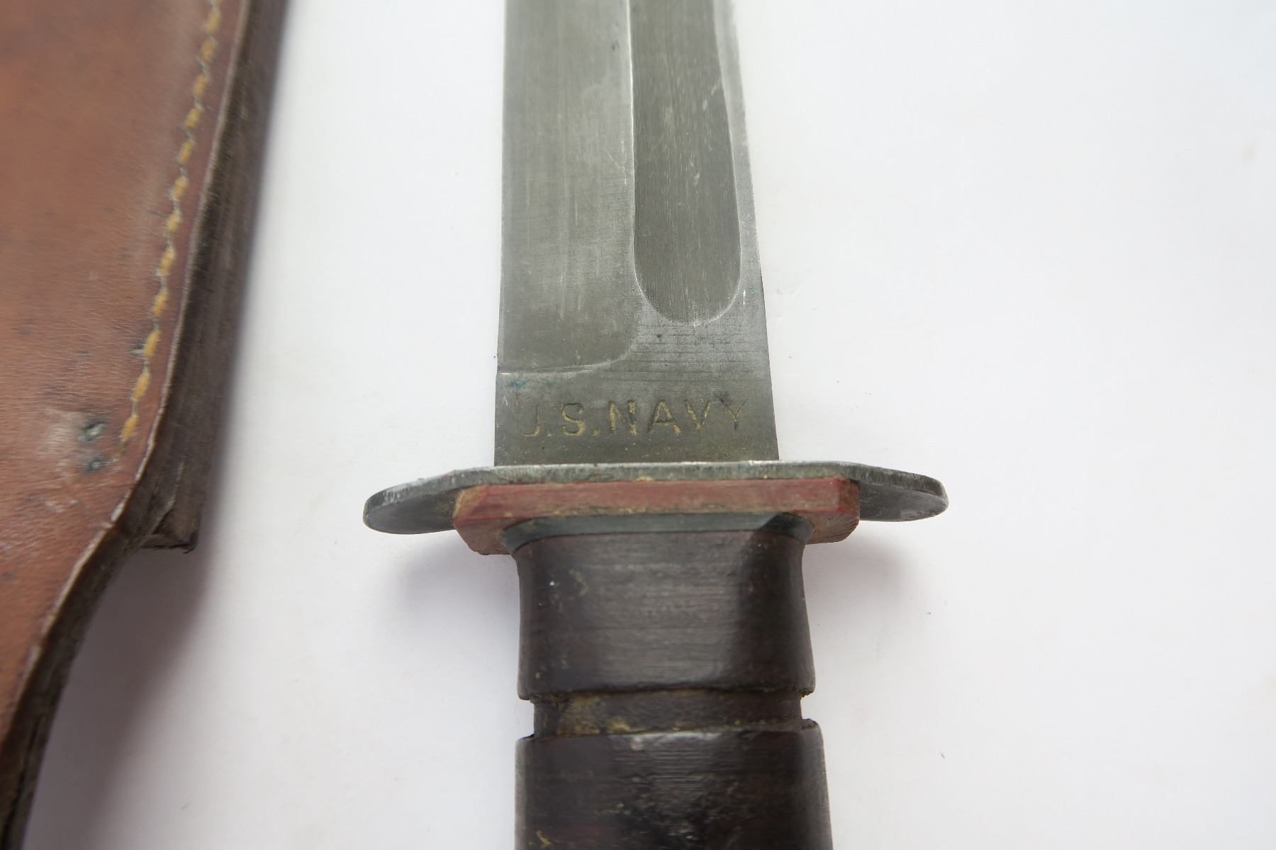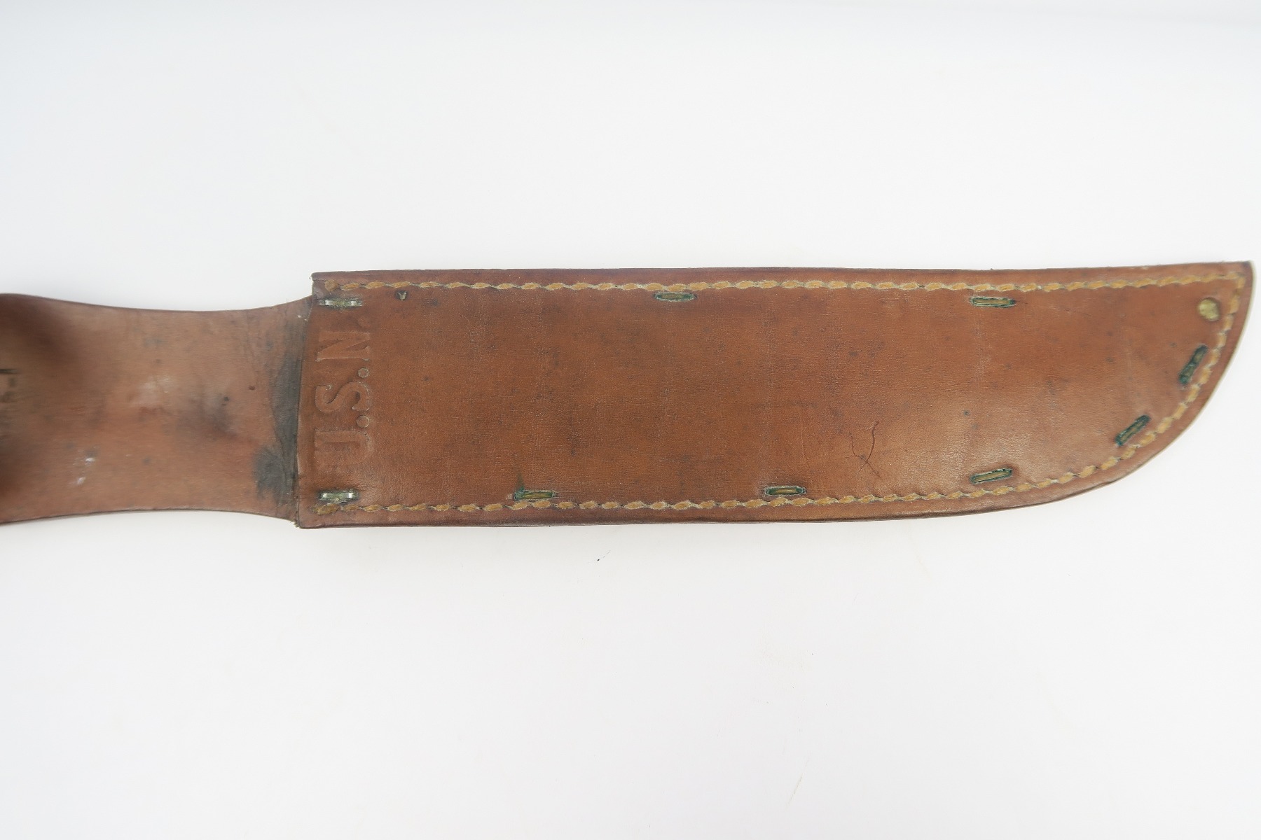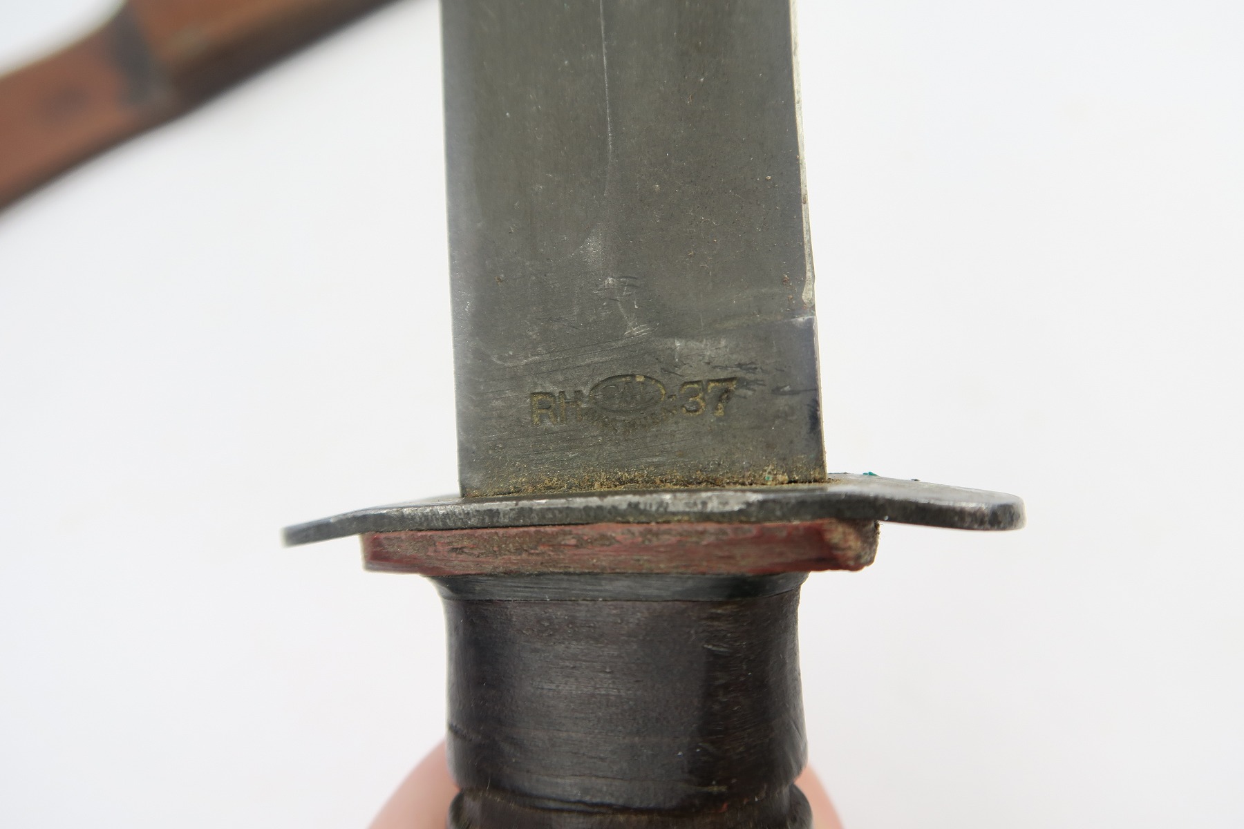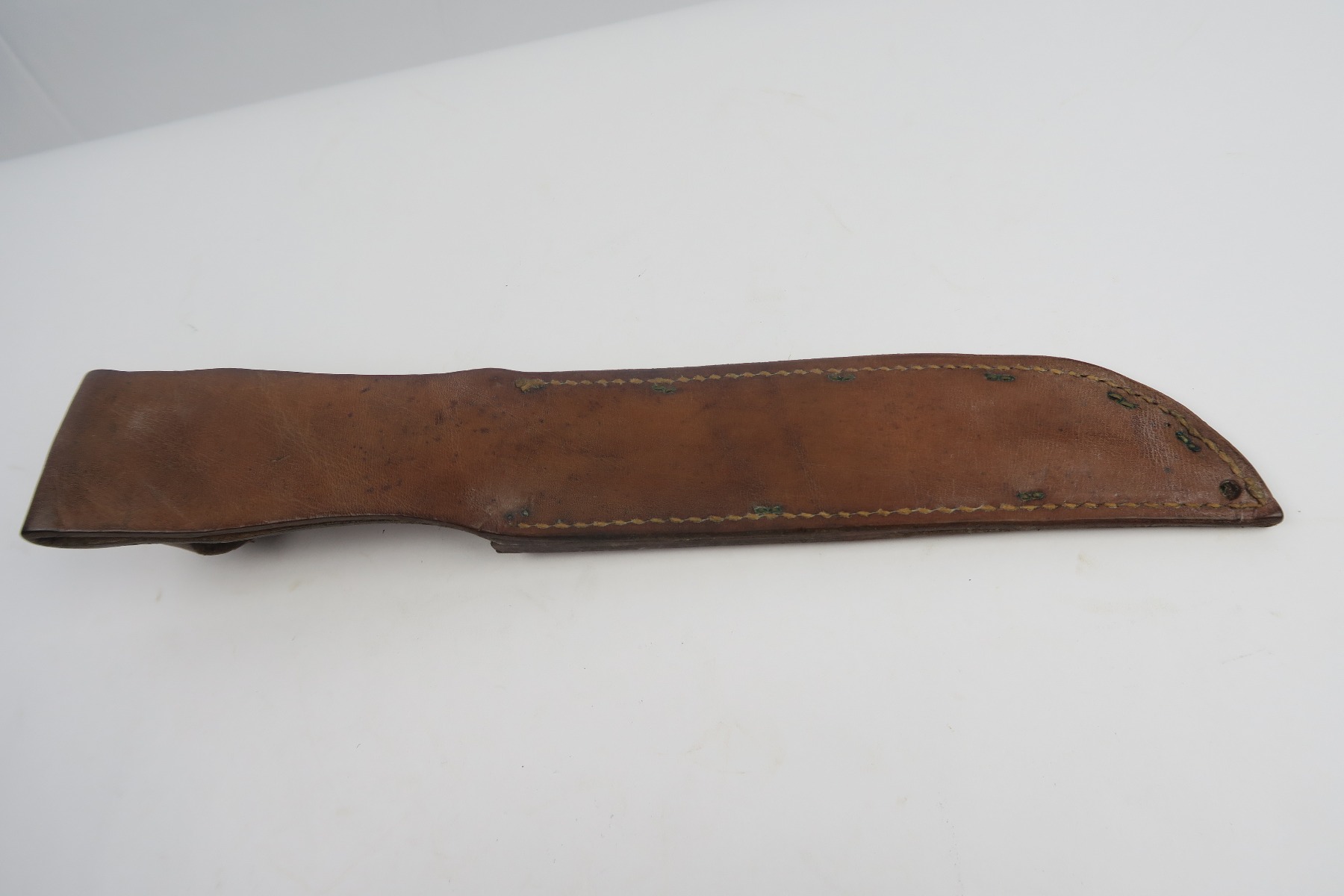 12/28/17 – This is an original PAL model 37 US Navy fighting knife, complete with the original leather scabbard made by BOYT. The blade is in excellent condition with only minor patina and spotting, but no major issues and no signs of sharpening. The left side is maker stamped and marked “RH 37” – the reverse side is “U.S. NAVY” stamped. The blade handle has iconic early red spacers. The scabbard is similarly U.S.N. stamped and marked BOYT with a “4” meaning the scabbard was made in 1944. Guaranteed original and authentic.