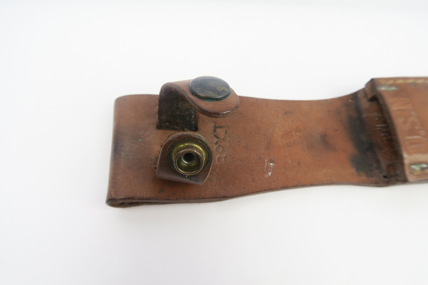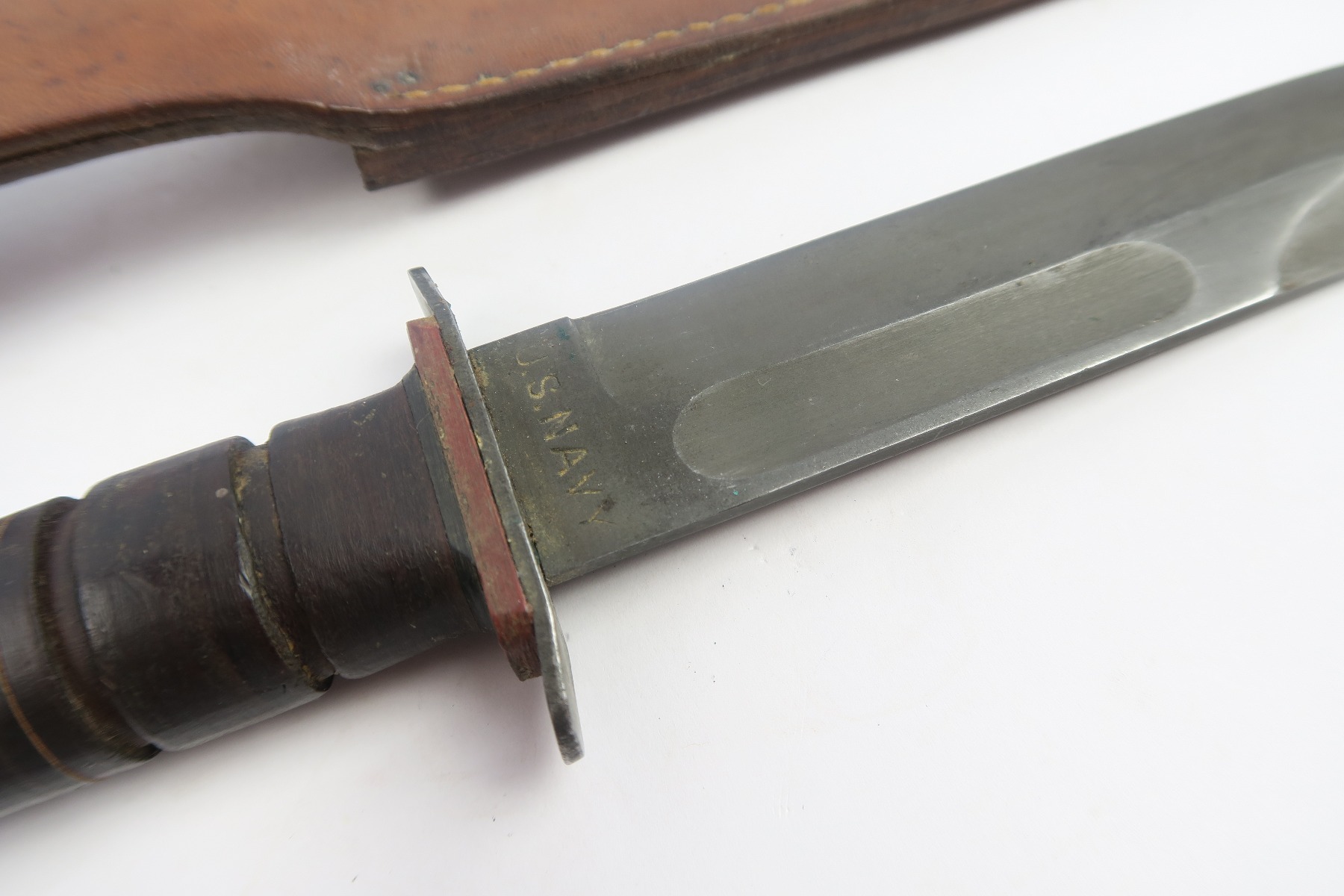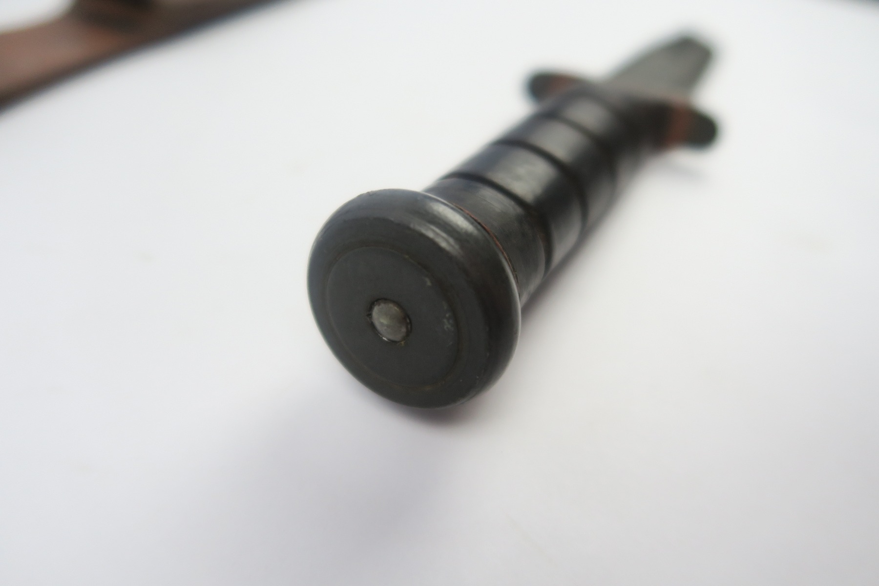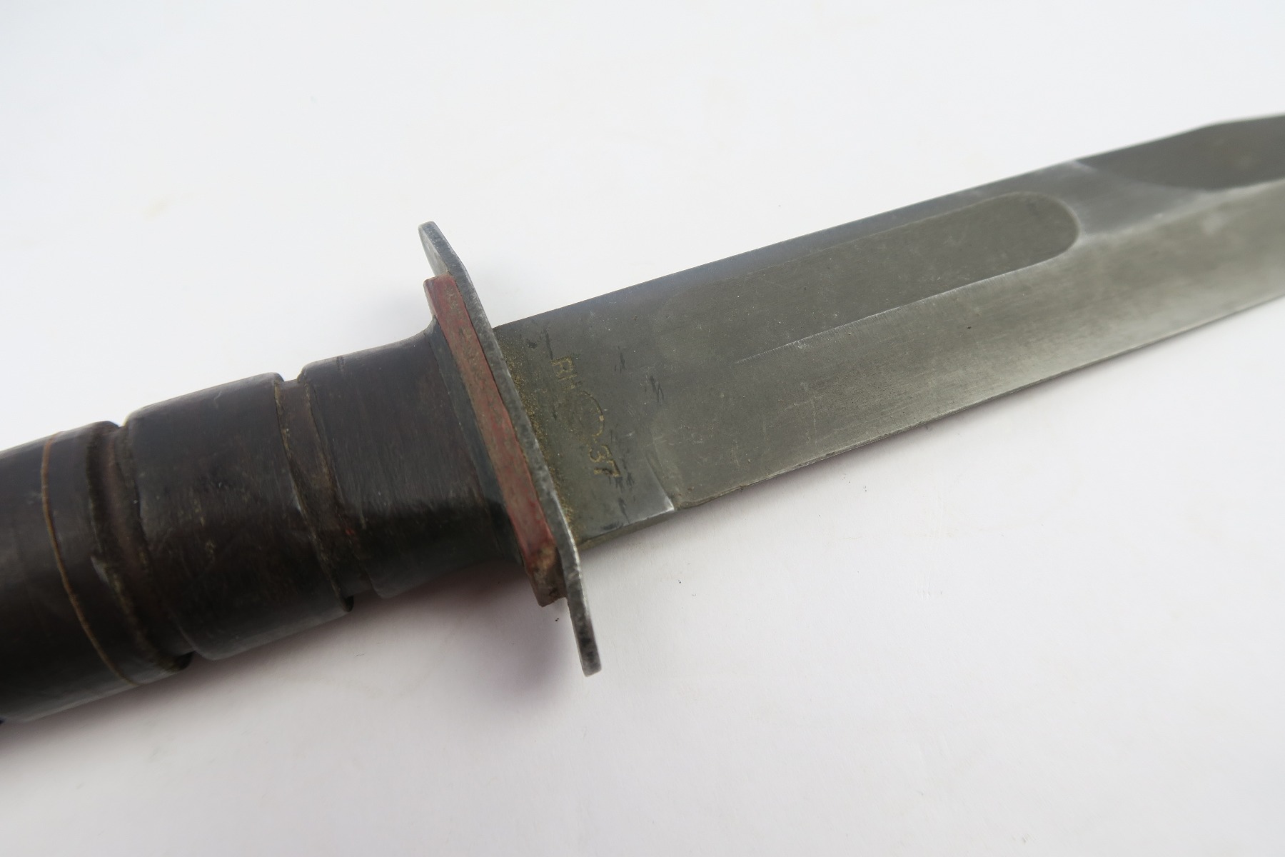 12/28/17 – This is an original PAL model 37 US Navy fighting knife, complete with the original leather scabbard made by BOYT. The blade is in excellent condition with only minor patina and spotting, but no major issues and no signs of sharpening. The left side is maker stamped and marked “RH 37” – the reverse side is “U.S. NAVY” stamped. The blade handle has iconic early red spacers. The scabbard is similarly U.S.N. stamped and marked BOYT with a “4” meaning the scabbard was made in 1944. Guaranteed original and authentic.