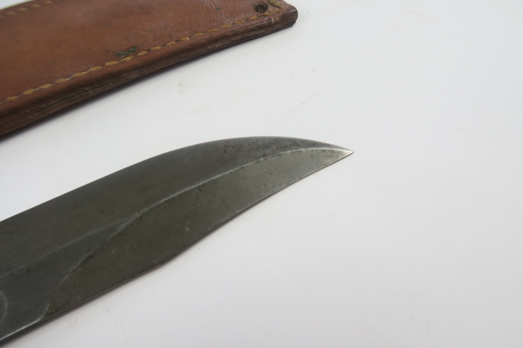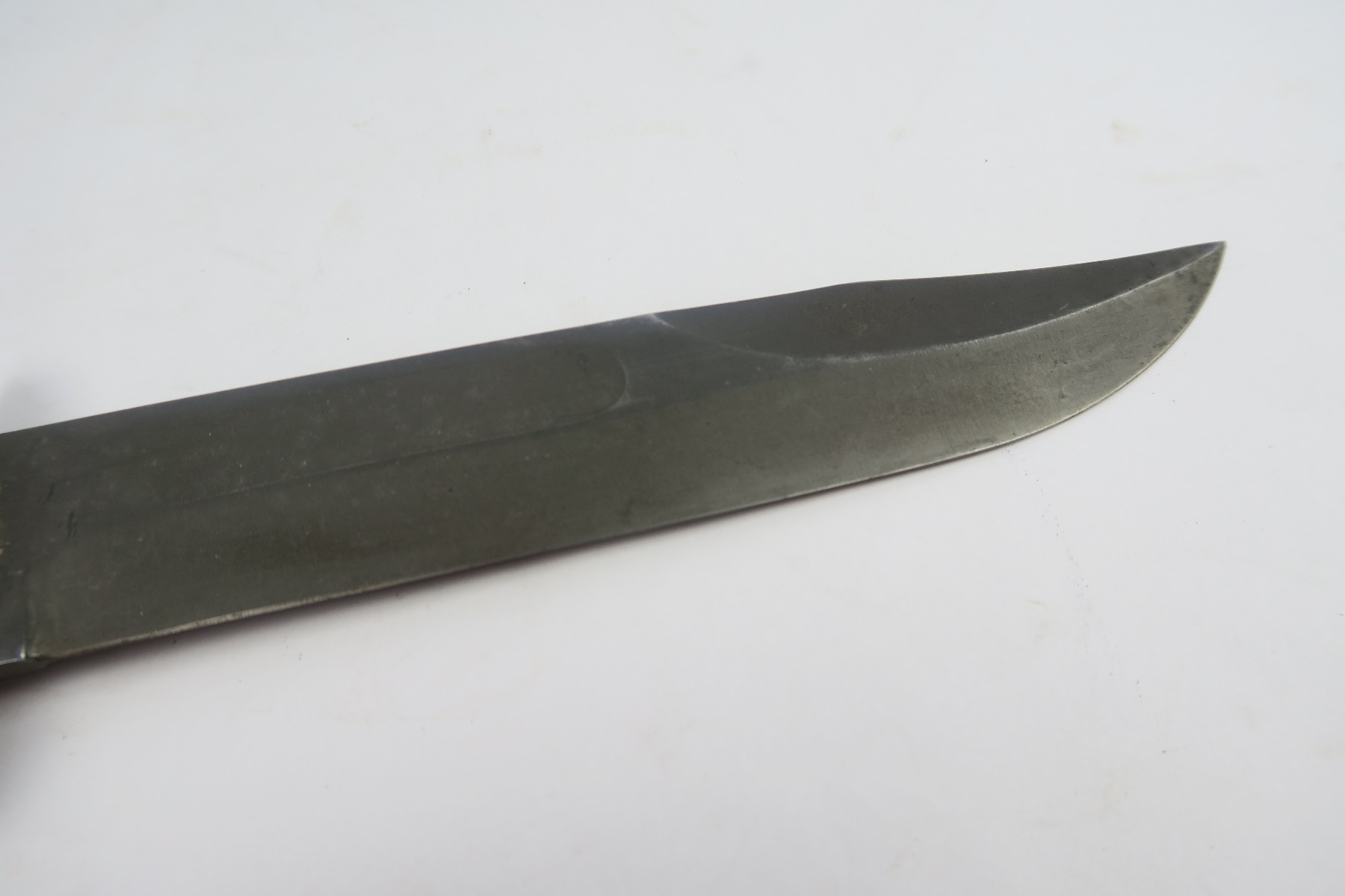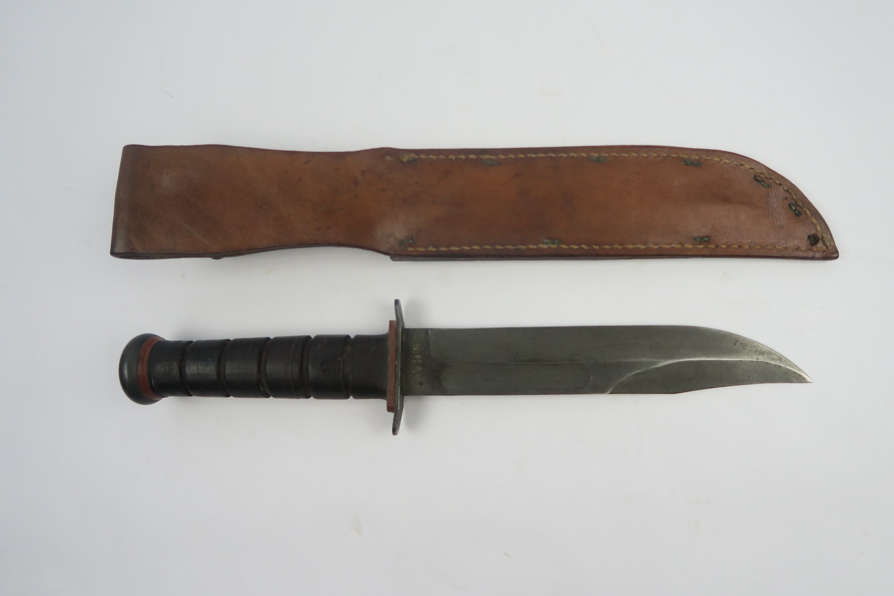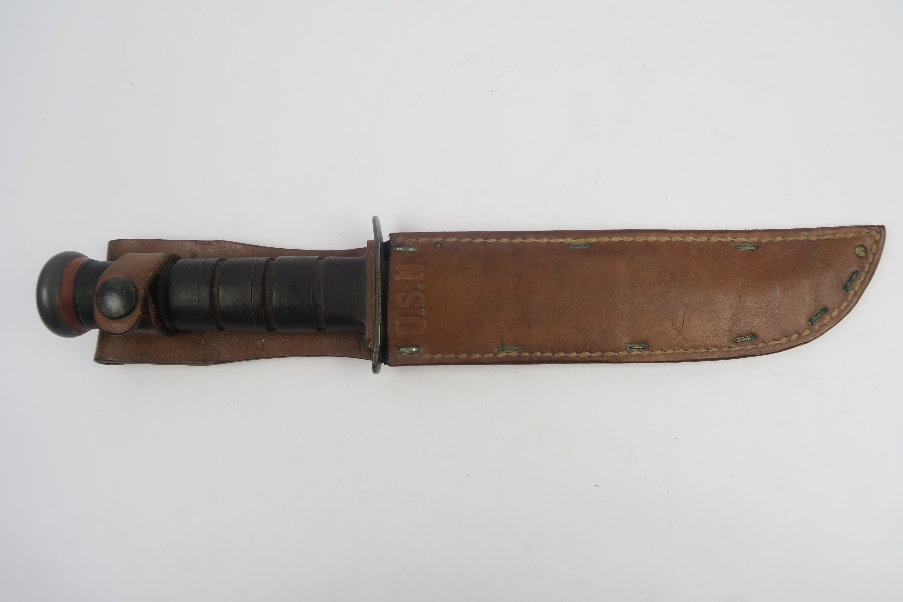 12/28/17 – This is an original PAL model 37 US Navy fighting knife, complete with the original leather scabbard made by BOYT. The blade is in excellent condition with only minor patina and spotting, but no major issues and no signs of sharpening. The left side is maker stamped and marked “RH 37” – the reverse side is “U.S. NAVY” stamped. The blade handle has iconic early red spacers. The scabbard is similarly U.S.N. stamped and marked BOYT with a “4” meaning the scabbard was made in 1944. Guaranteed original and authentic.
